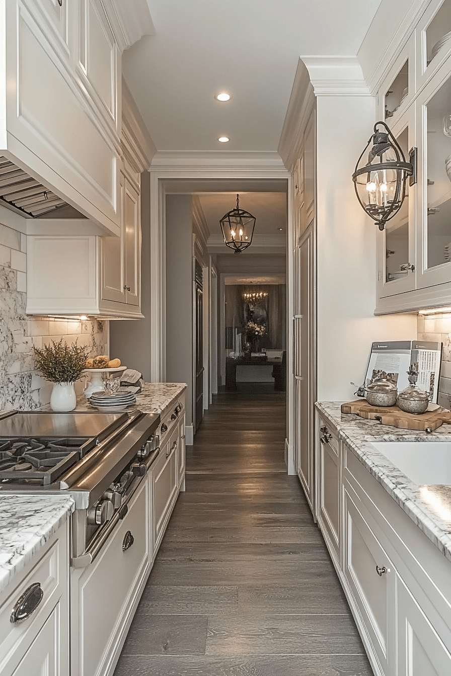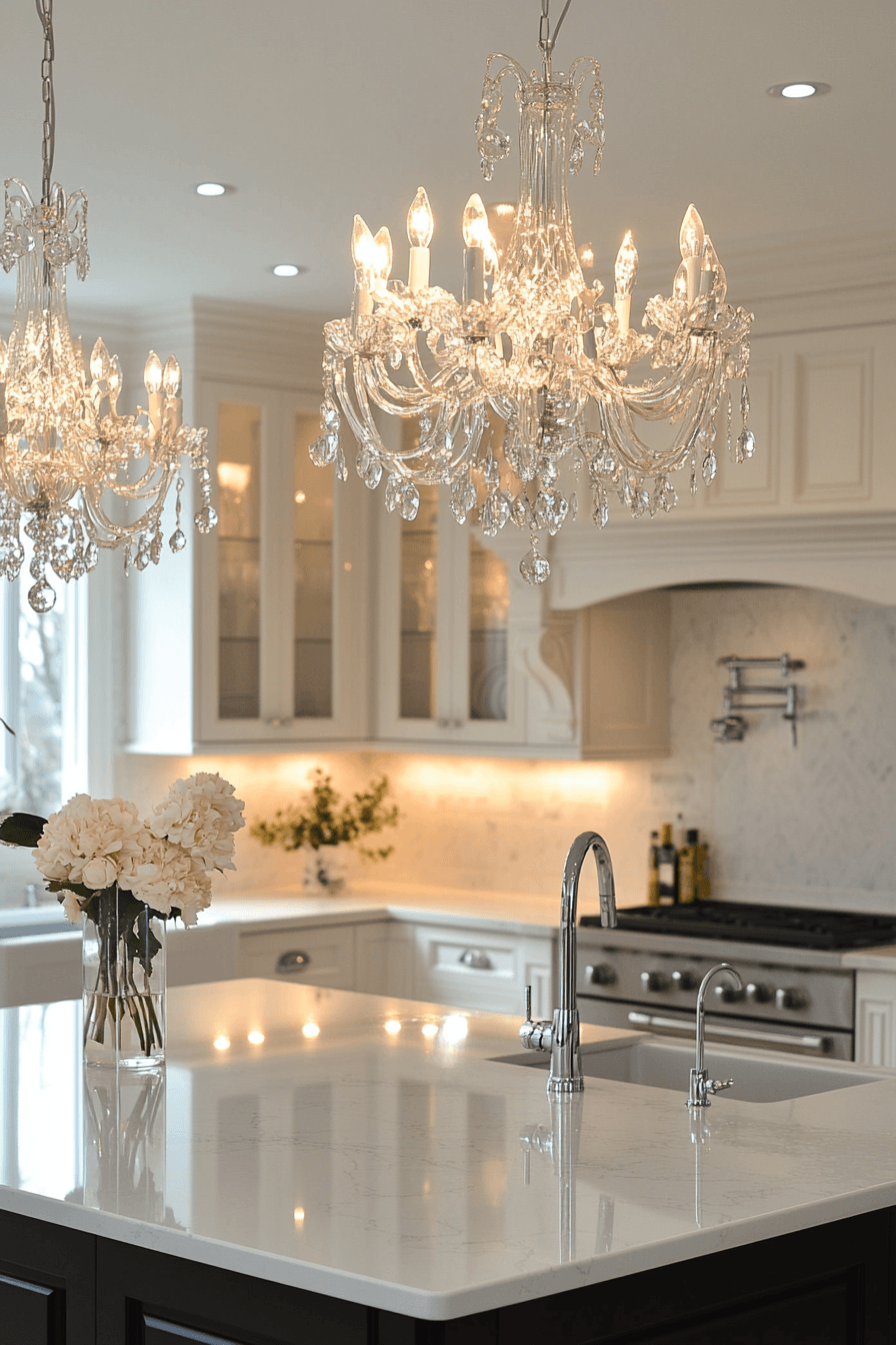 Crystal pendants reflect light beautifully, adding sparkle and elegance to the kitchen. Faceted surfaces create subtle shimmer throughout the space. Kitchen lighting ideas like this elevate everyday environments. Positioned over key areas, they naturally draw attention. The space feels more refined. Add a touch of shine to your kitchen.