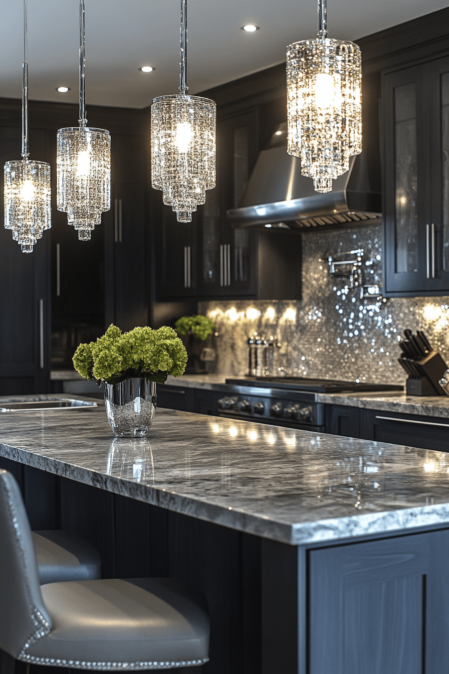Reflective glass fixtures amplify brightness and create visual impact. Light bounces across surfaces to enhance openness. Kitchen lighting ideas like this draw attention to key areas. The design feels polished and dramatic. The space becomes more dynamic. Make your lighting stand out.