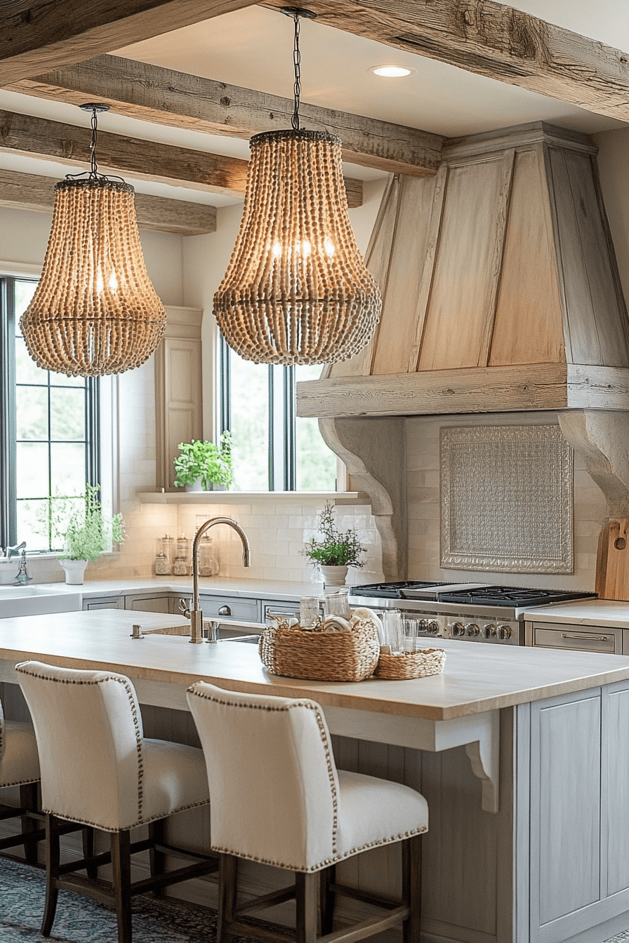 Beaded chandeliers introduce texture and warmth with their layered construction. Light filters softly through each element. Kitchen lighting ideas like this feel handcrafted and inviting. Positioned over gathering areas, they enhance the atmosphere. The space feels cozy yet refined. Add texture through beaded lighting.