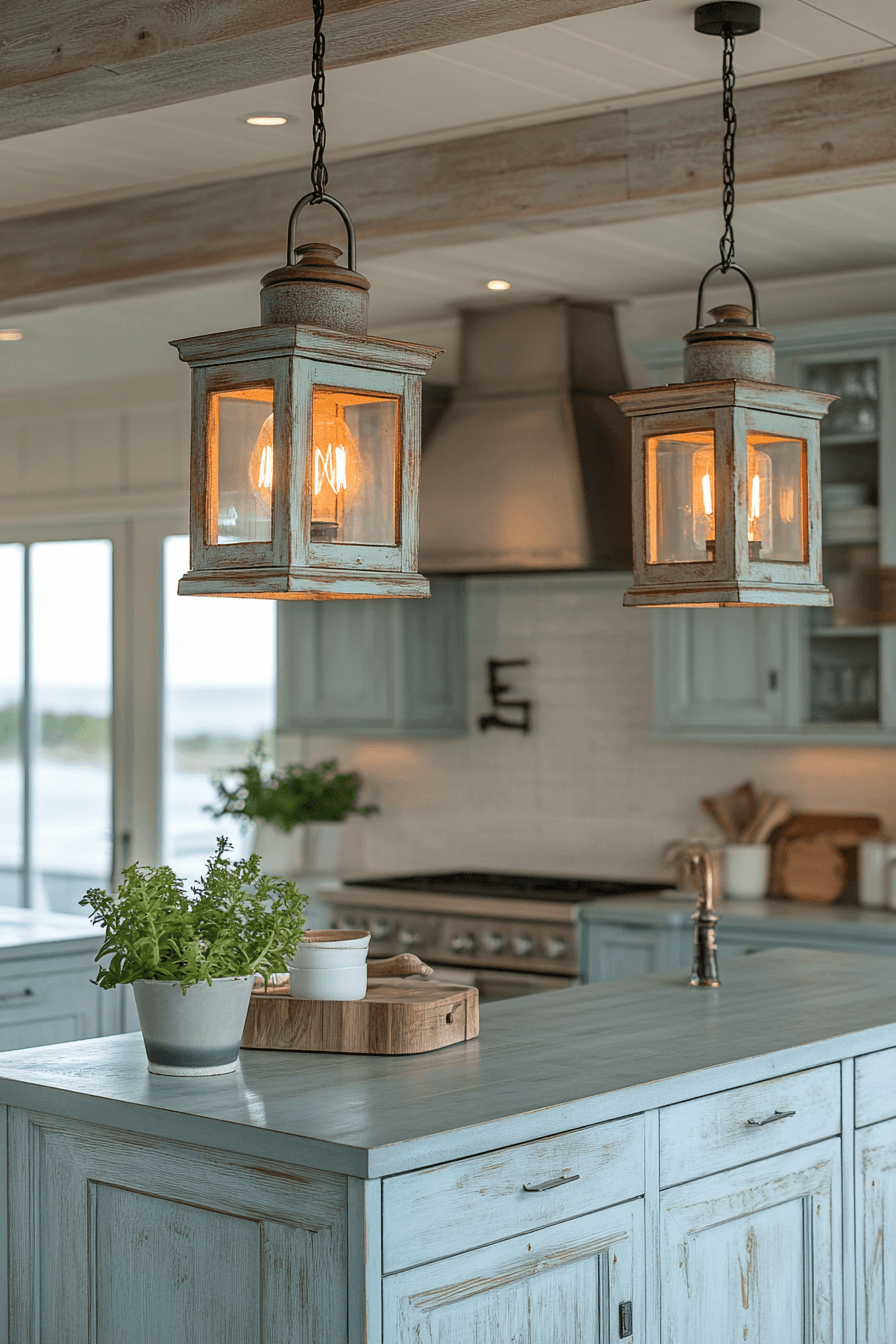 Coastal lantern designs create a relaxed and breezy atmosphere with light materials and glass panels. Soft illumination adds a calming feel to the space. Kitchen lighting ideas like this pair well with neutral tones and natural textures. The design feels fresh and open. The mood remains light and airy. Bring coastal energy into your kitchen.