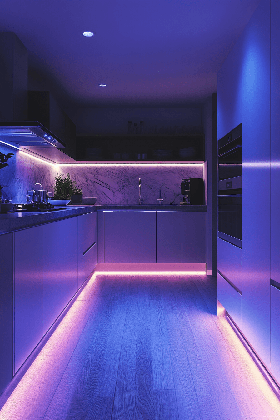 Soft LED strip accents introduce a modern glow that enhances both function and ambiance. Light flows along cabinets or shelves, creating a layered effect. Kitchen lighting ideas using LED strips allow customization in tone and intensity. Even tight spaces benefit from their flexibility. The atmosphere feels contemporary and inviting. Add a modern glow to your kitchen design.