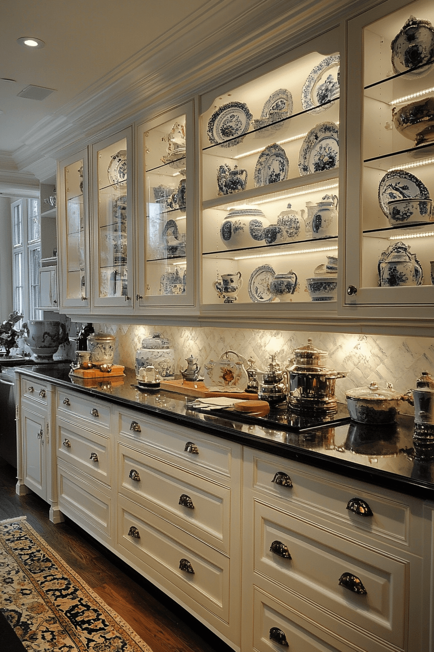 Subtle cabinet illumination adds depth and sophistication to the overall design. Light gently highlights finishes and decorative pieces. Kitchen lighting ideas like this create a layered and custom look. Even simple cabinetry feels elevated. The kitchen gains warmth and visual interest. Add depth with this refined lighting detail.