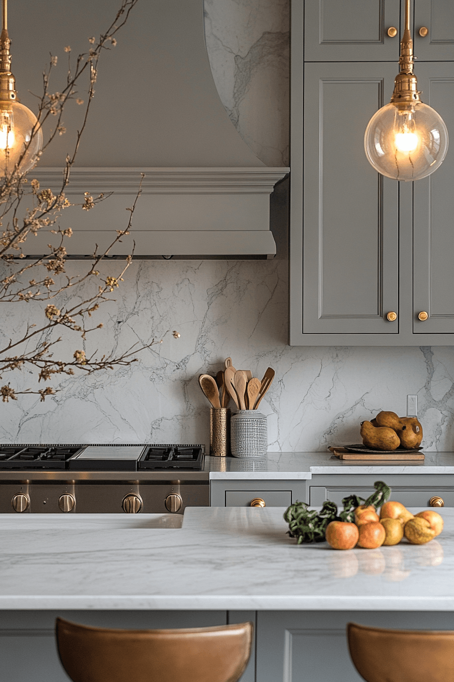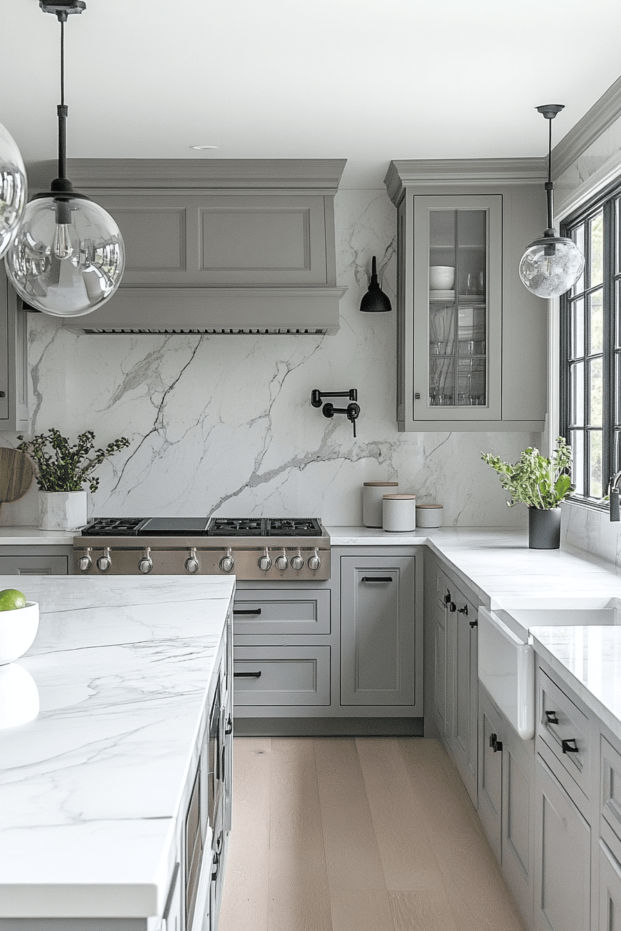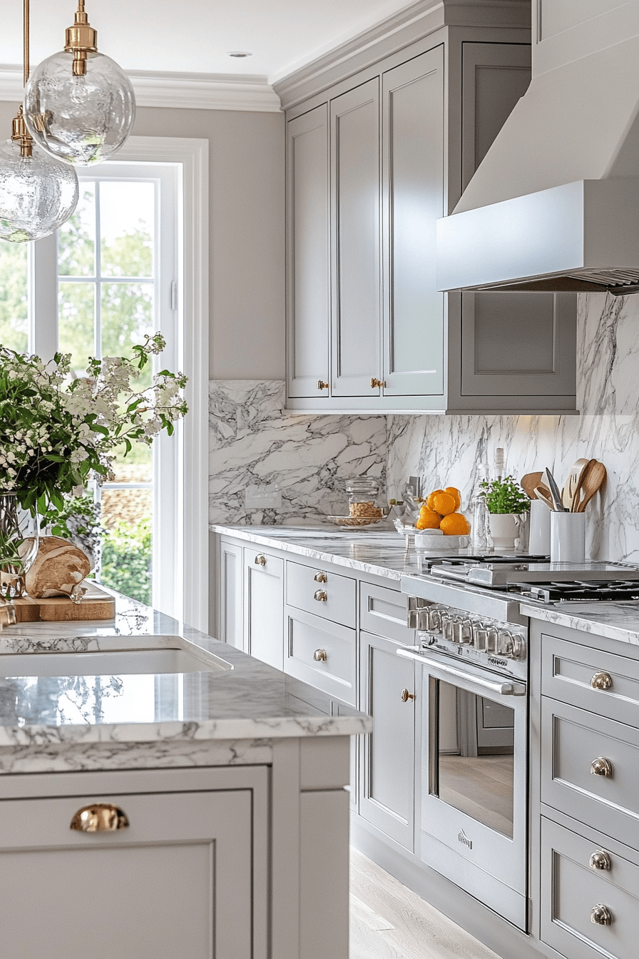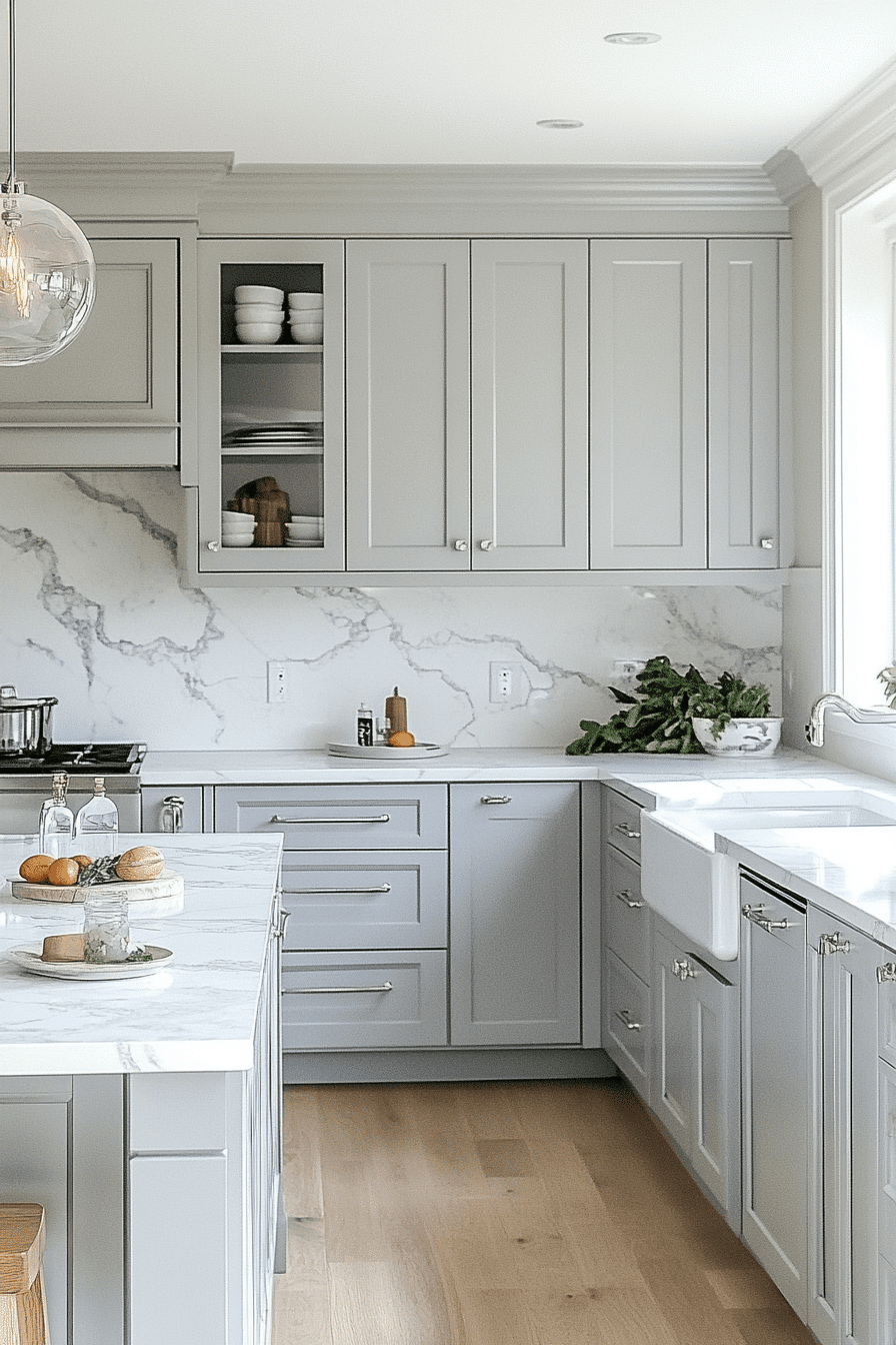 Marble pairings elevate light grey kitchen cabinets with natural elegance and contrast. Soft grey tones highlight marble veining beautifully. Light grey kitchen cabinets keep the design grounded while enhancing luxury. Metallic finishes complete the look. The space feels timeless and sophisticated. Elevate your kitchen with this pairing.