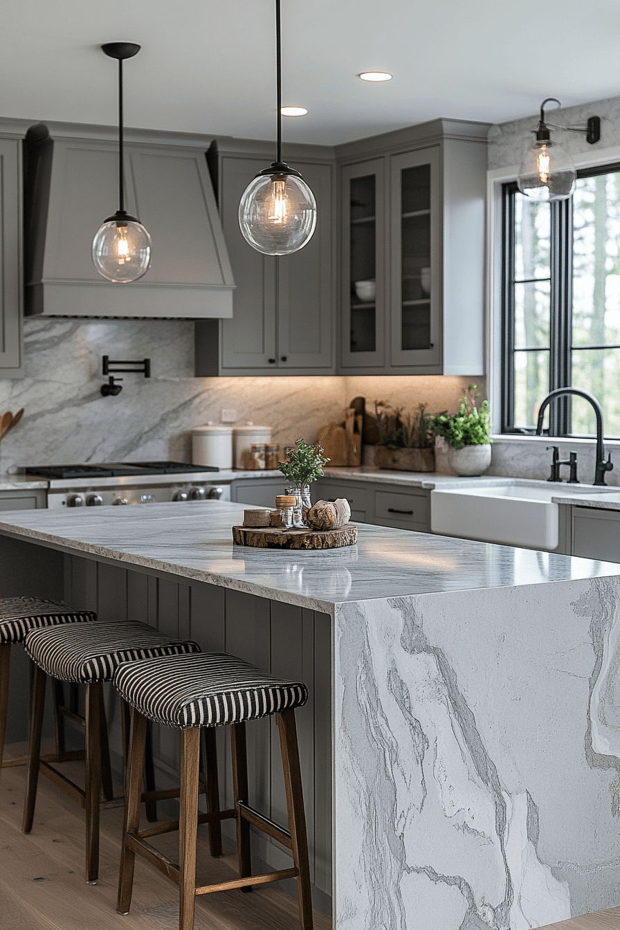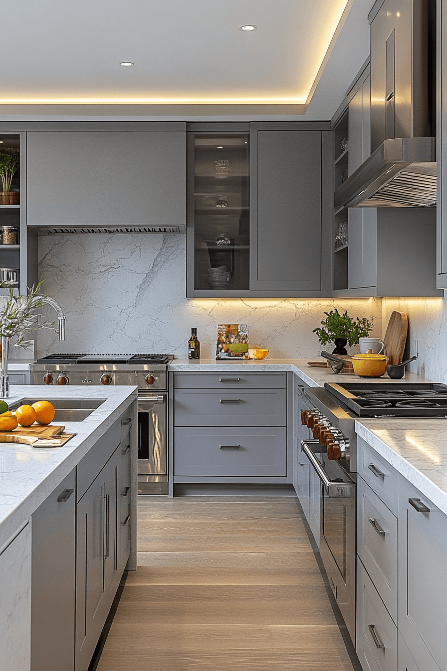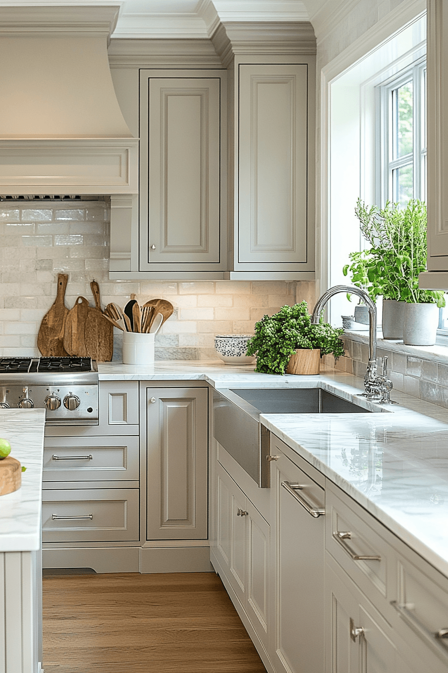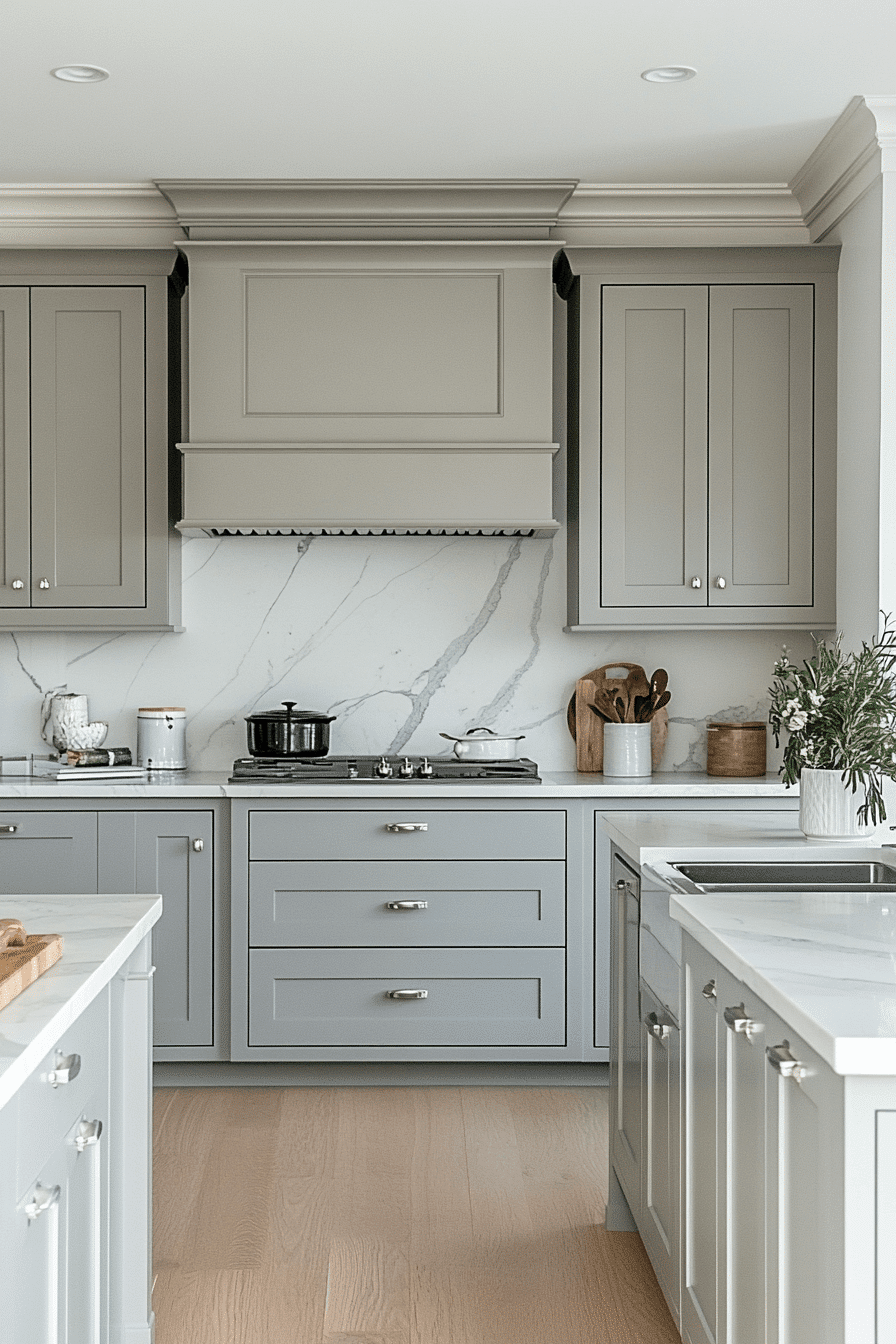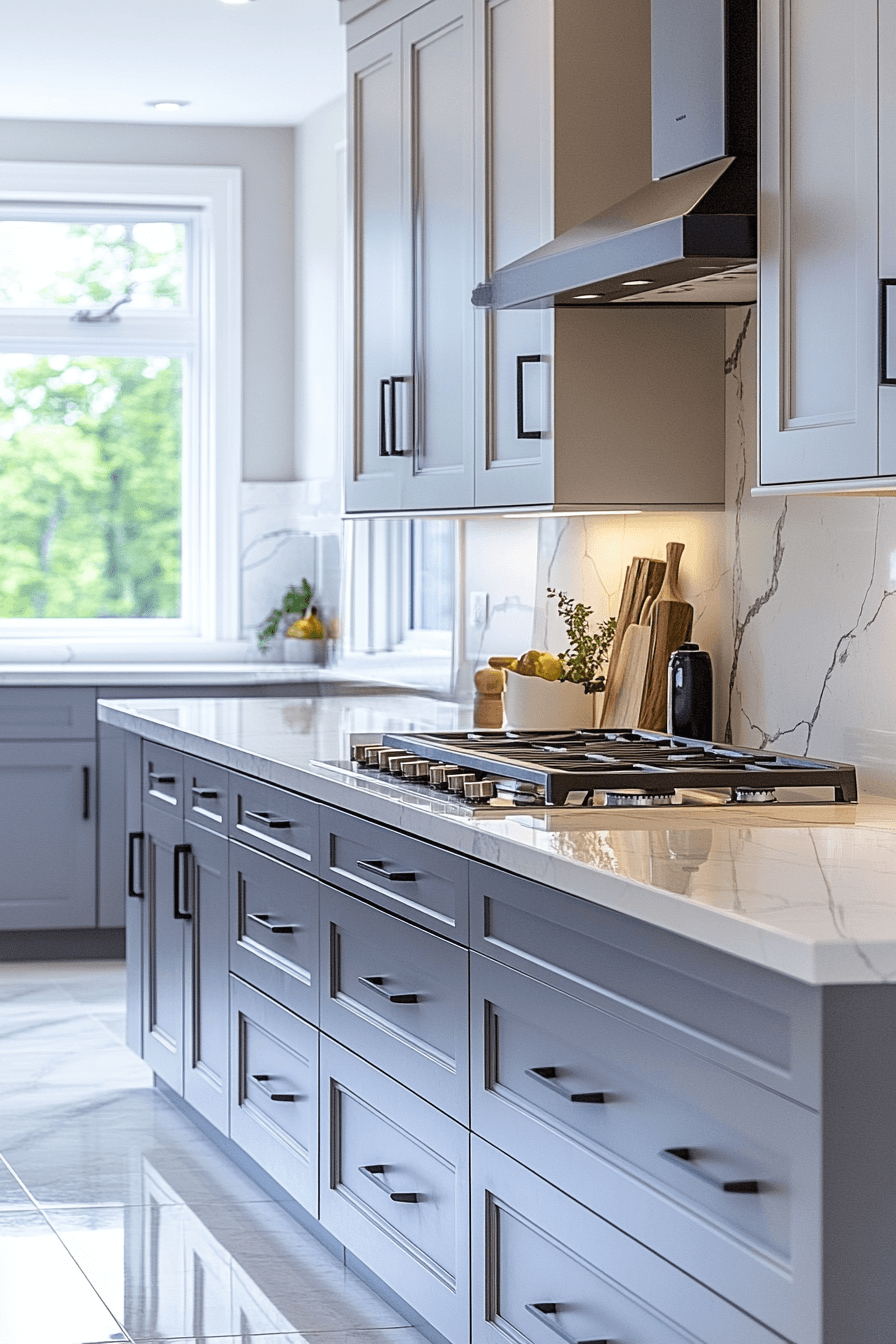 Marble pairings elevate light grey kitchen cabinets with natural elegance and contrast. Soft grey tones highlight marble veining beautifully. Light grey kitchen cabinets keep the design grounded while enhancing luxury. Metallic finishes complete the look. The space feels timeless and sophisticated. Elevate your kitchen with this pairing.