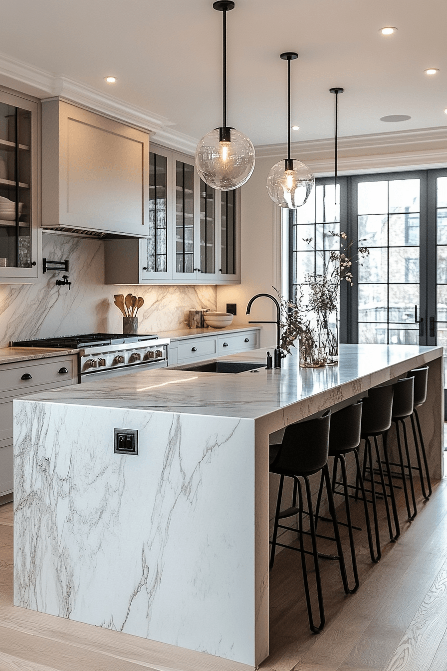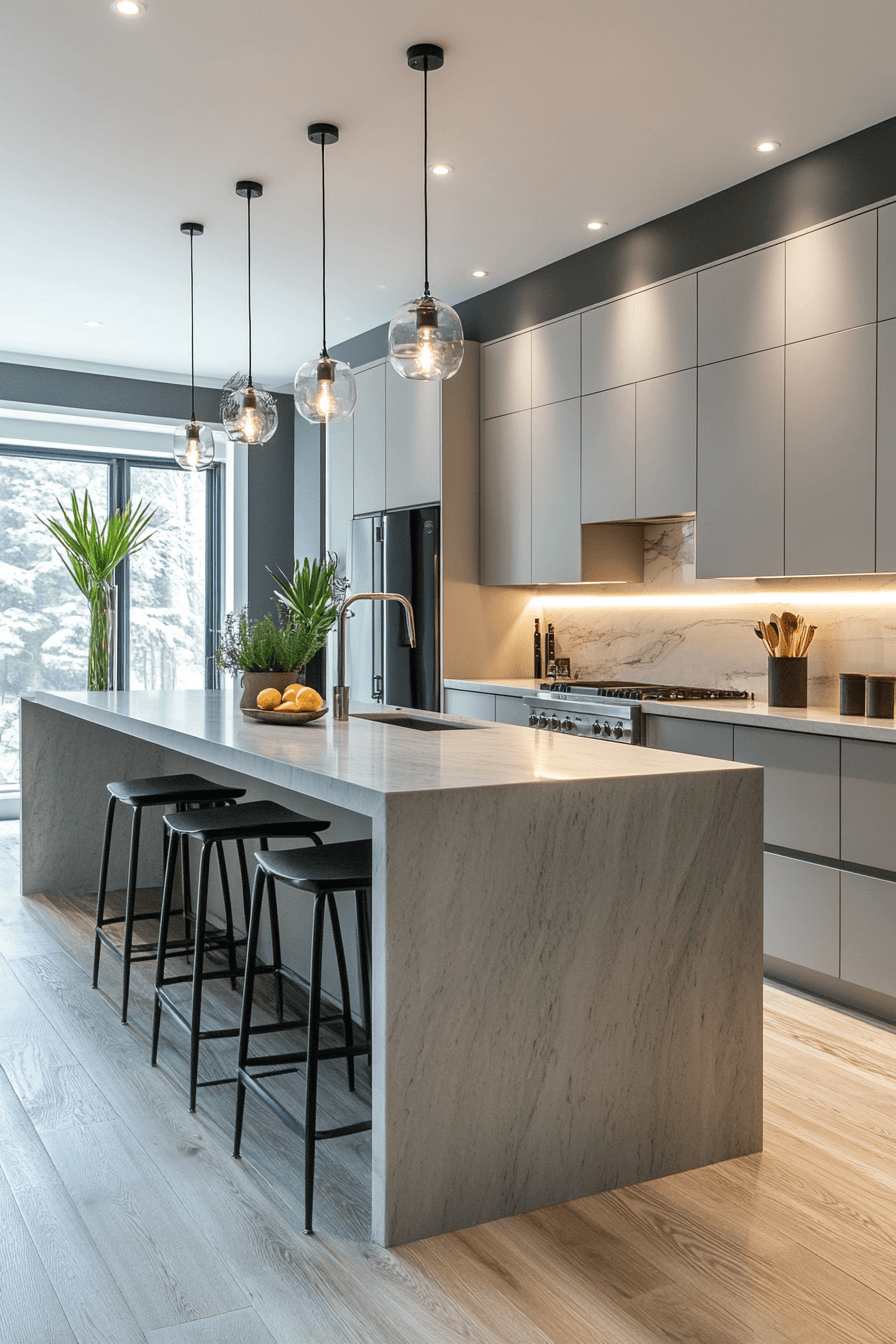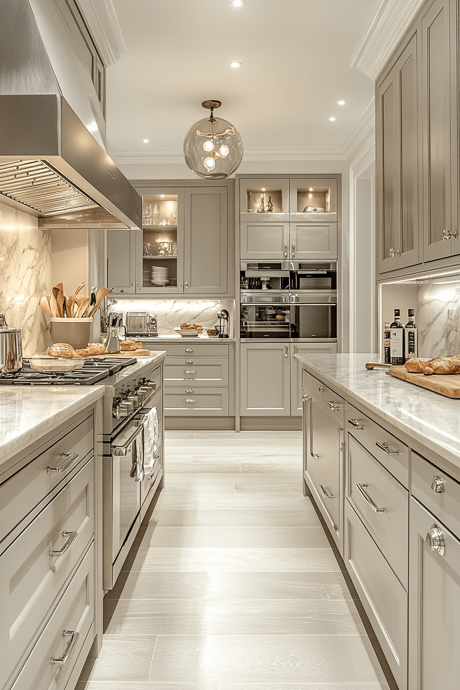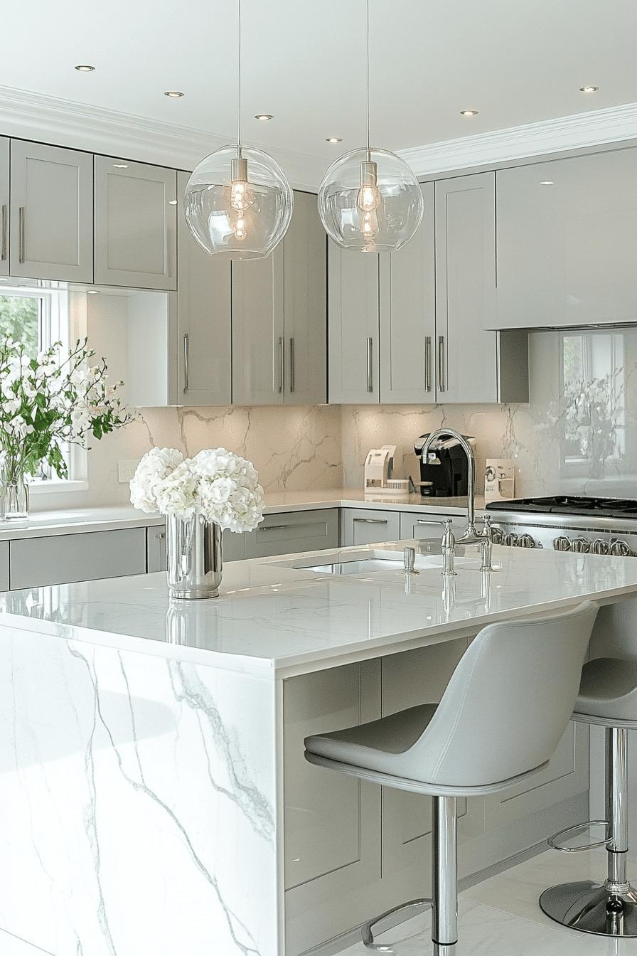 Marble pairings elevate light grey kitchen cabinets with natural elegance and contrast. Soft grey tones highlight marble veining beautifully. Light grey kitchen cabinets keep the design grounded while enhancing luxury. Metallic finishes complete the look. The space feels timeless and sophisticated. Elevate your kitchen with this pairing.
