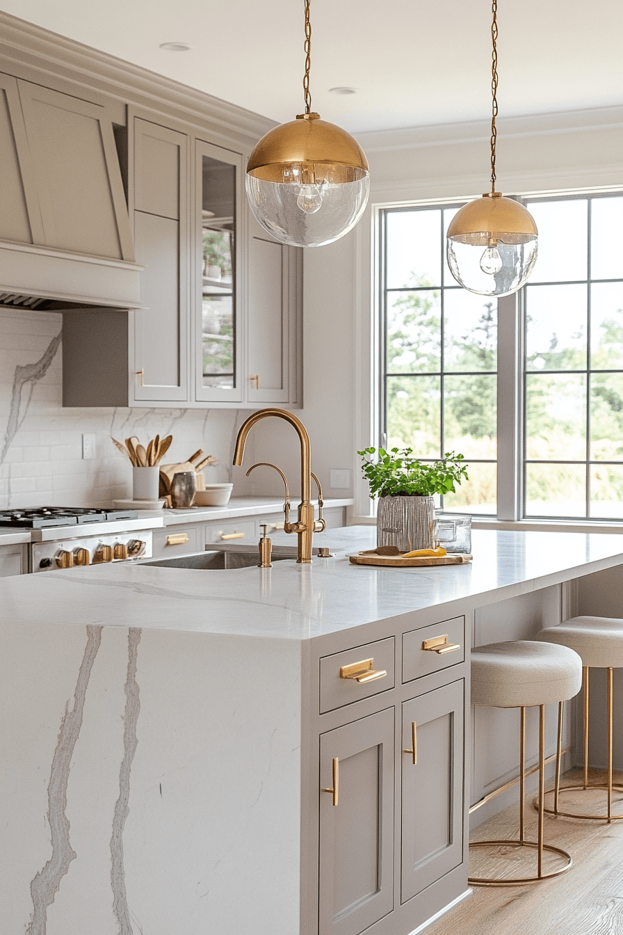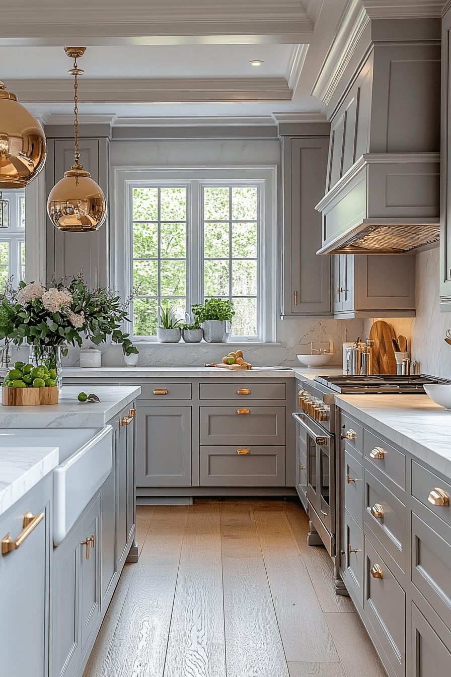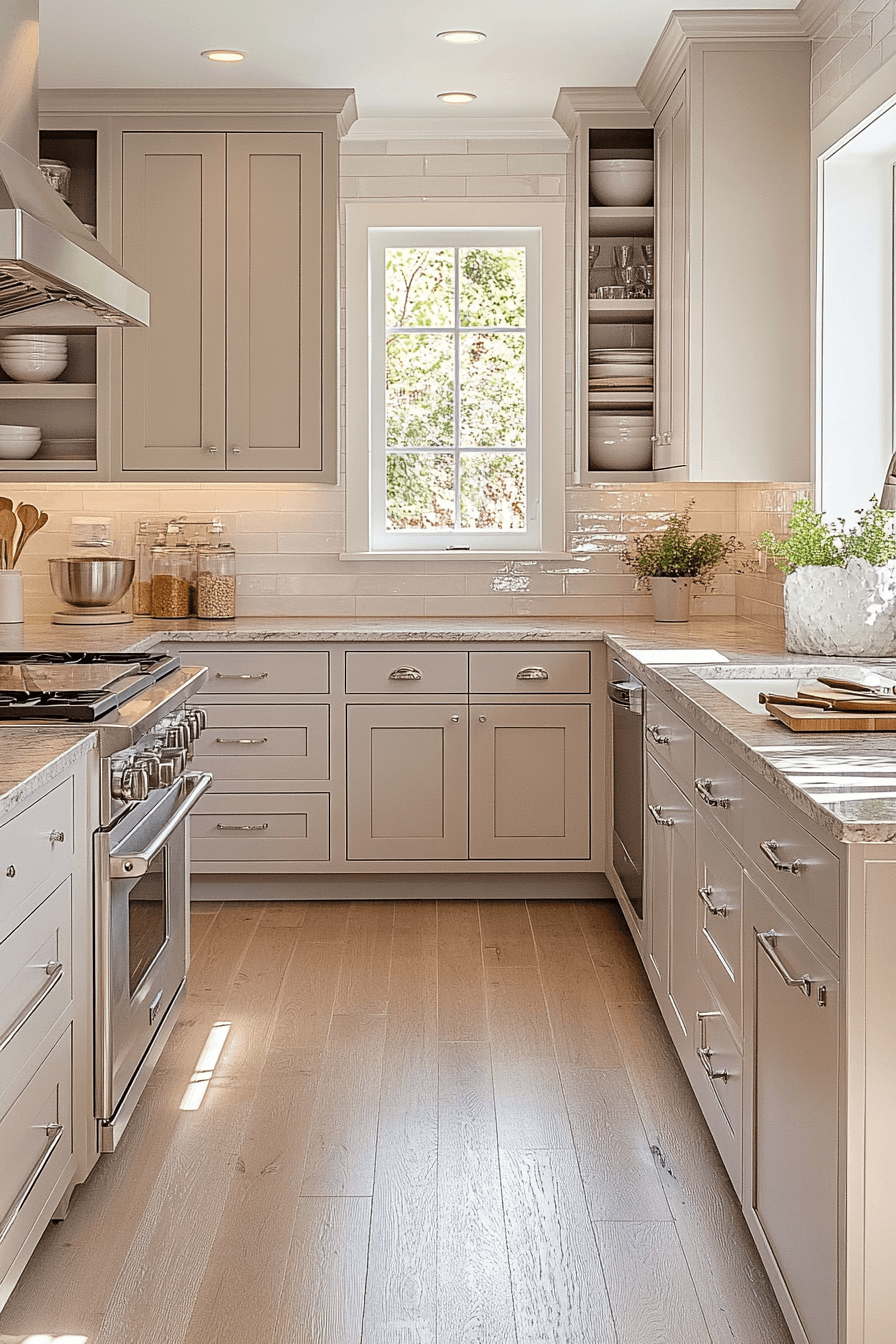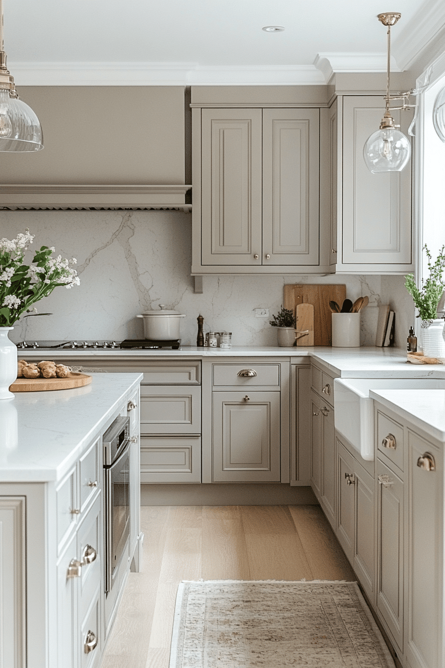 Subtle warm undertones transform light grey kitchen cabinets into a more inviting and cozy feature. Gentle hints of warmth soften the overall palette. Light grey kitchen cabinets pair beautifully with brass or gold accents. The balance between cool and warm feels natural. The space feels welcoming yet modern. Add warmth to your kitchen palette.
