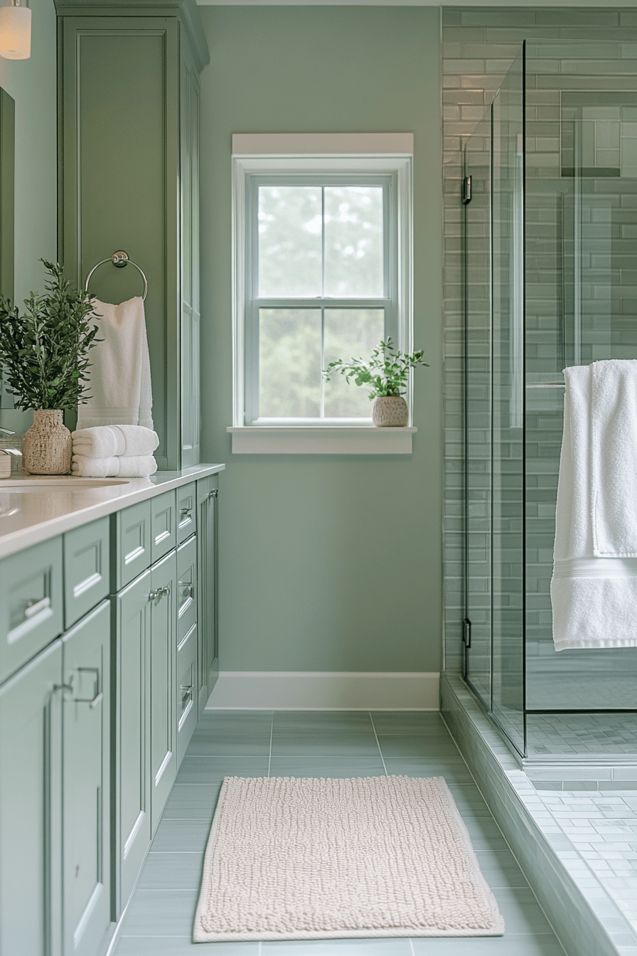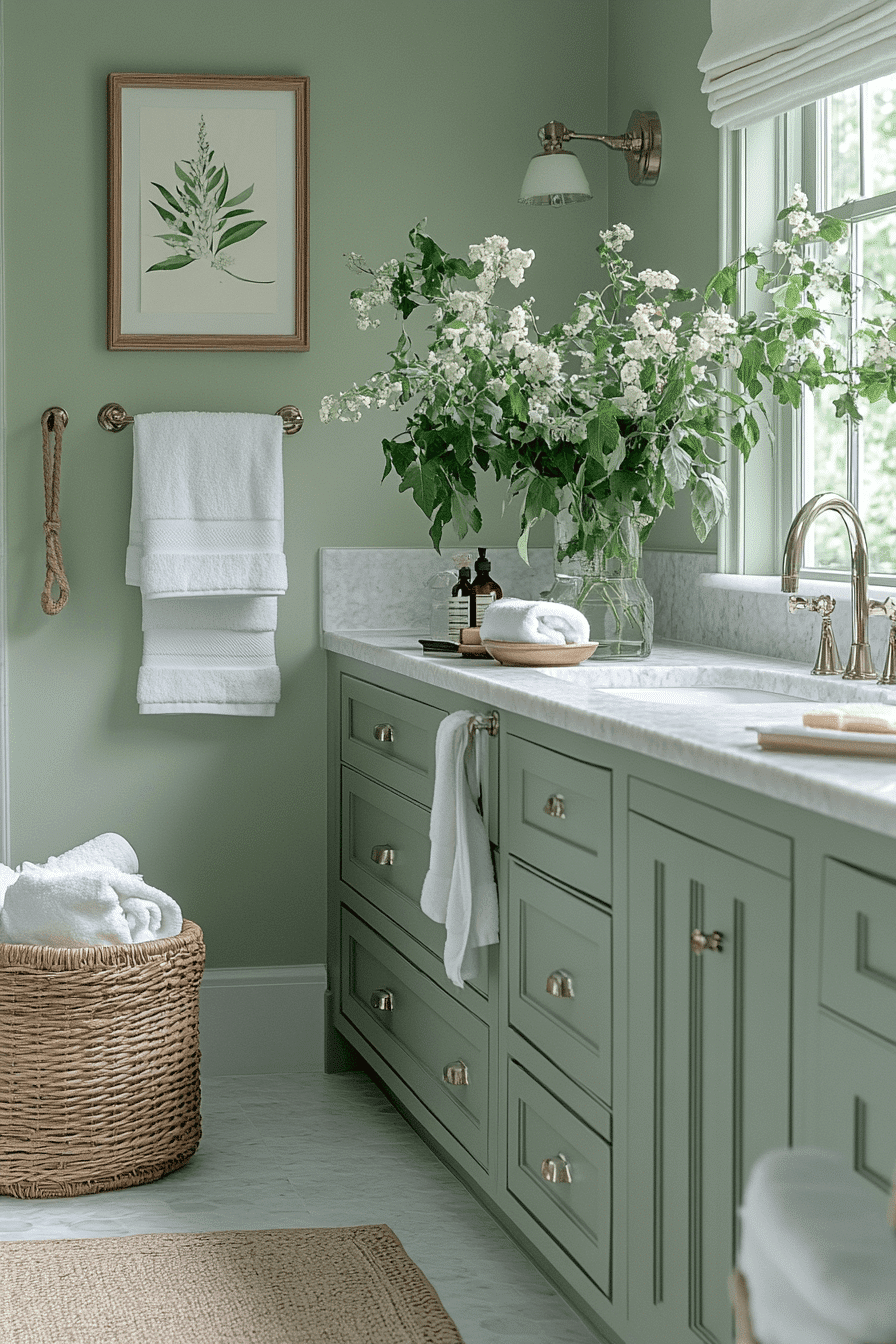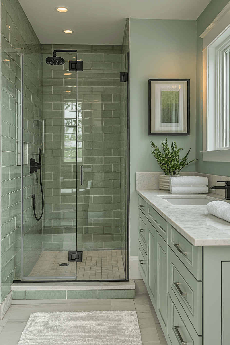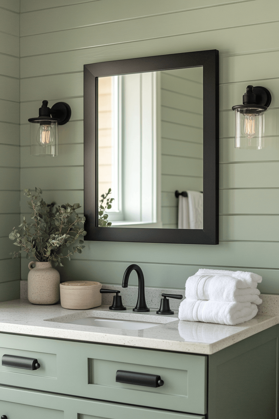 Dark contrasting elements sharpen a light sage green bathroom while maintaining a balanced feel. Bold accents create definition without overwhelming the space. Light sage green bathroom palettes soften the contrast naturally. Clean lines keep the design cohesive. The space feels modern and stylish. Add bold contrast for visual impact.