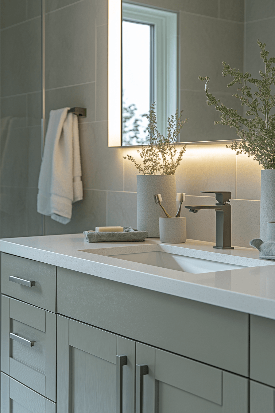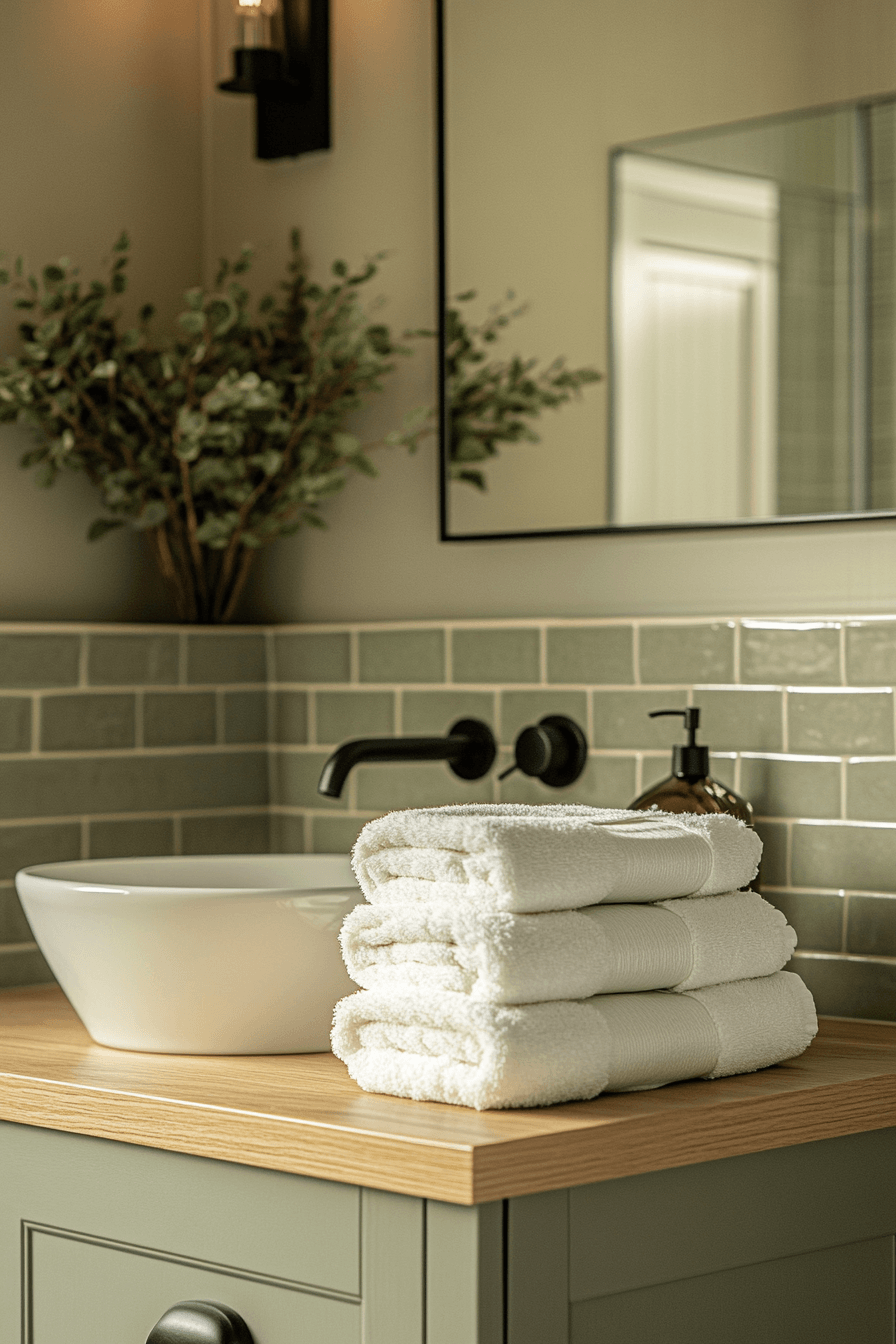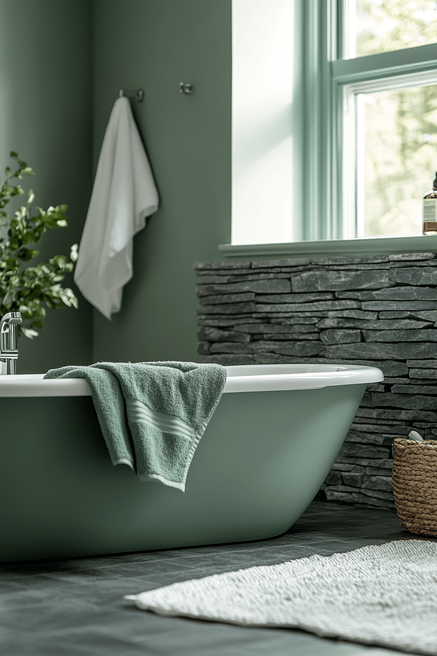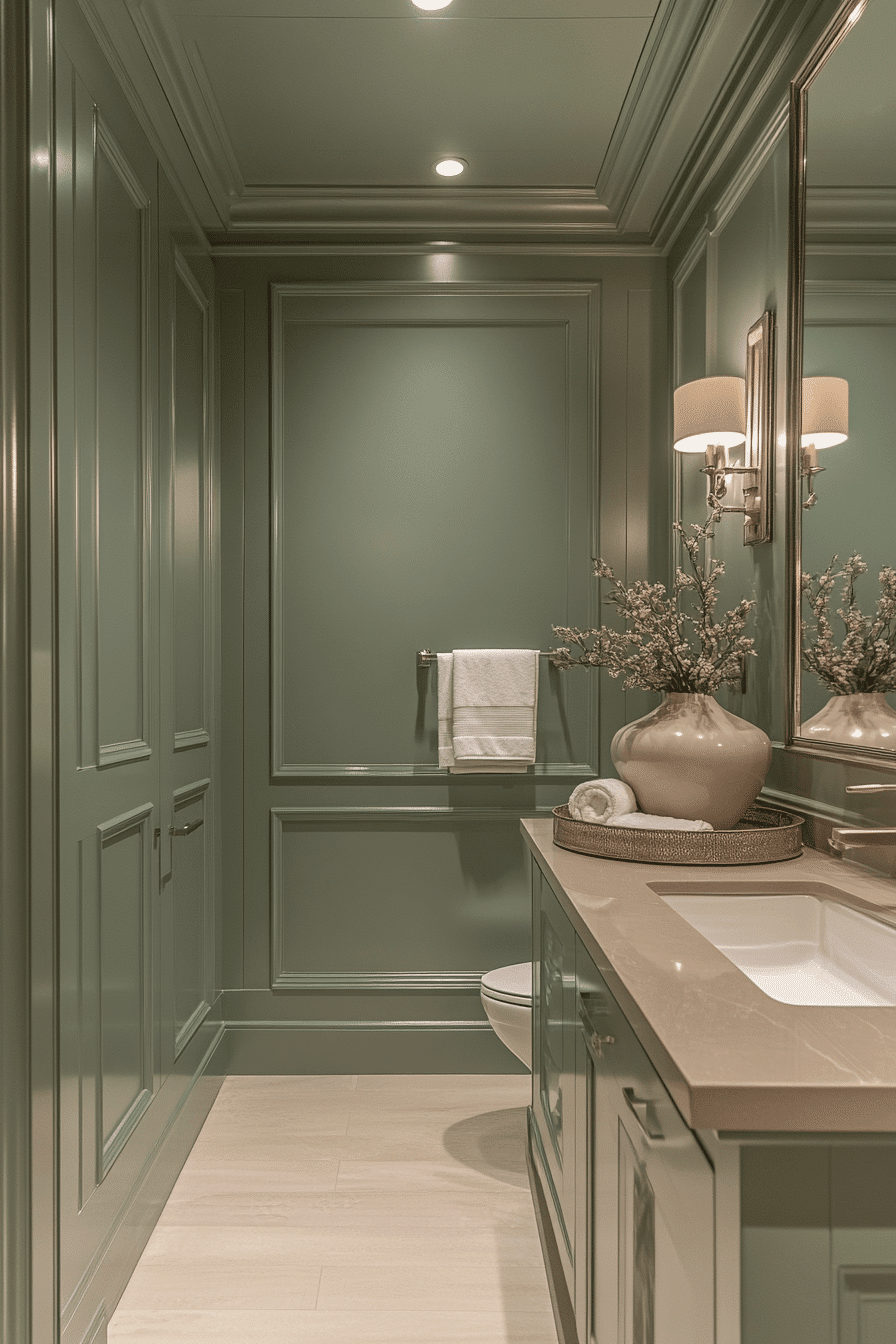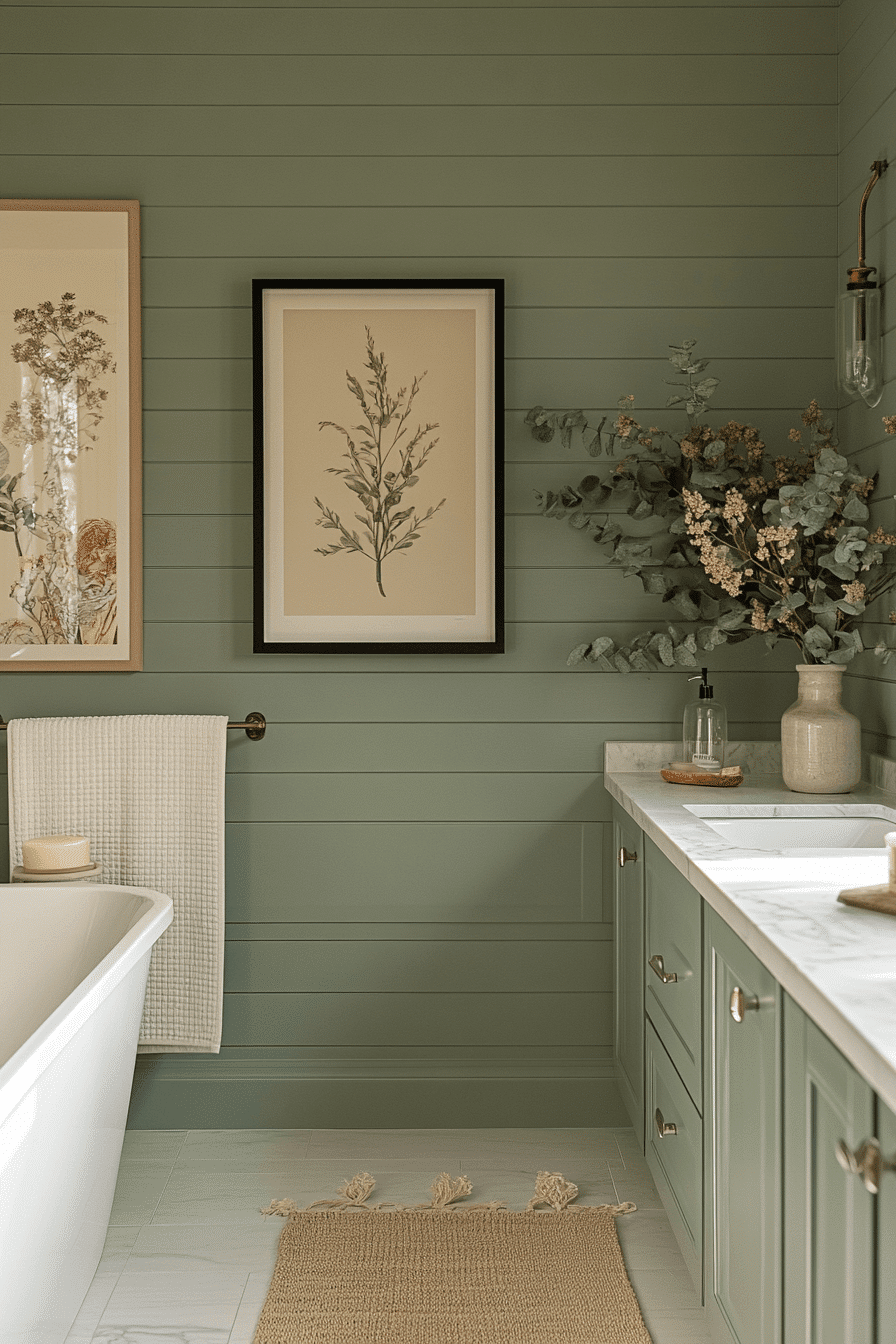Dark contrasting elements sharpen a light sage green bathroom while maintaining a balanced feel. Bold accents create definition without overwhelming the space. Light sage green bathroom palettes soften the contrast naturally. Clean lines keep the design cohesive. The space feels modern and stylish. Add bold contrast for visual impact.