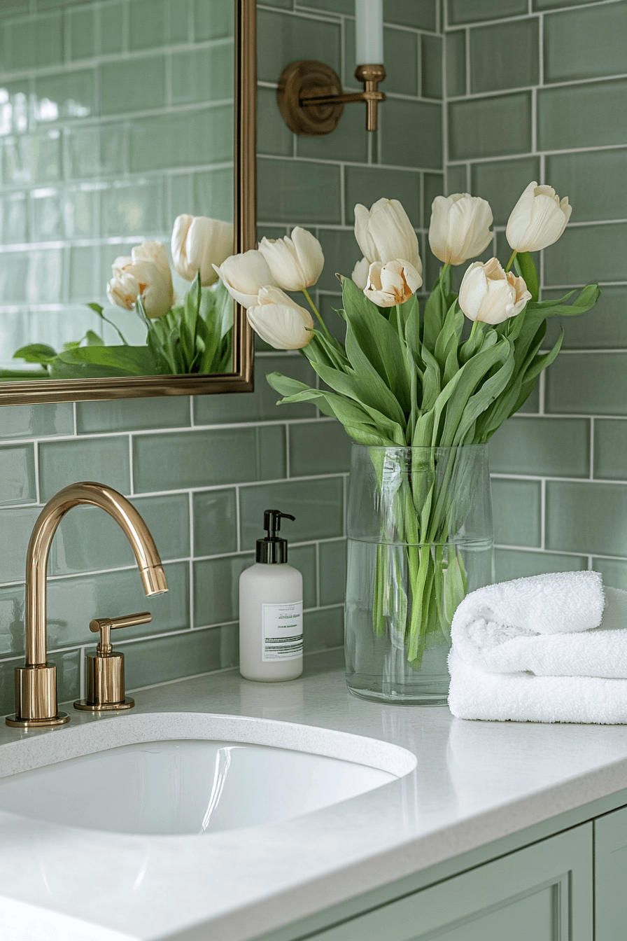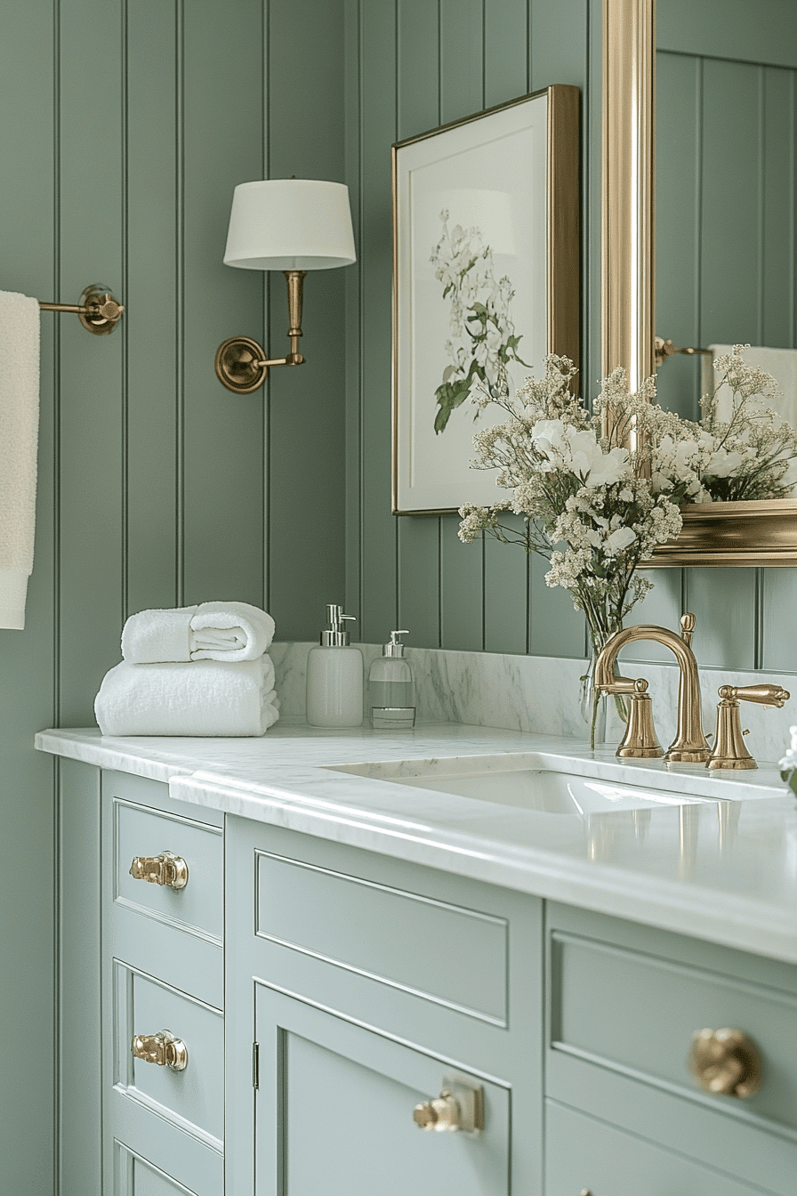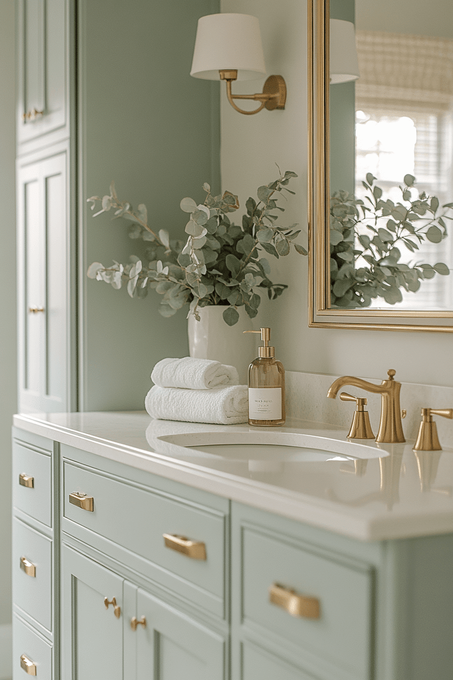 Brass details add a warm glow to a light sage green bathroom, creating subtle elegance. Metallic finishes stand out softly against the sage backdrop. Light sage green bathroom combinations feel elevated with these accents. Small details enhance the overall design. The space feels polished and refined. Add a warm glow with brass accents.
