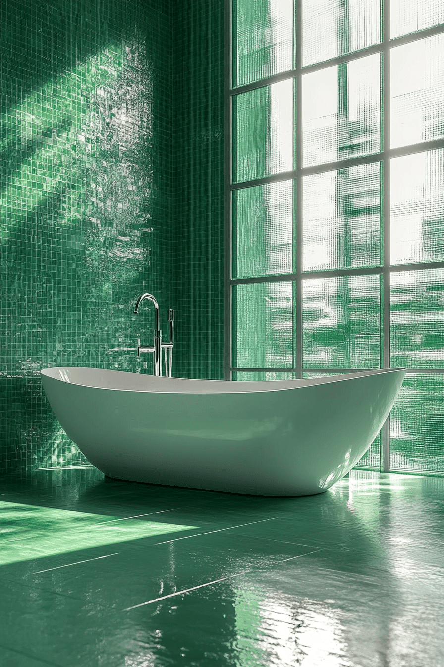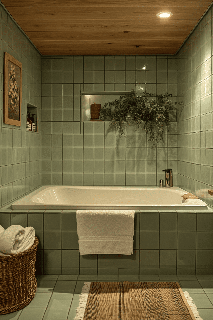 Vertical tile patterns elongate a light sage green bathroom by drawing the eye upward. This layout creates the illusion of height. Light sage green bathroom tiles keep the look soft and relaxed. Minimal decor allows the pattern to stand out. The space feels open and taller. Add height with vertical tile design.
