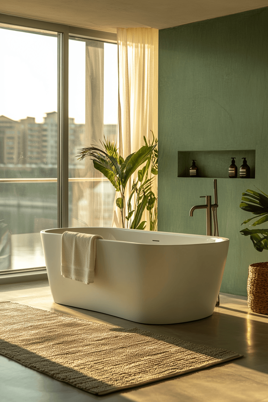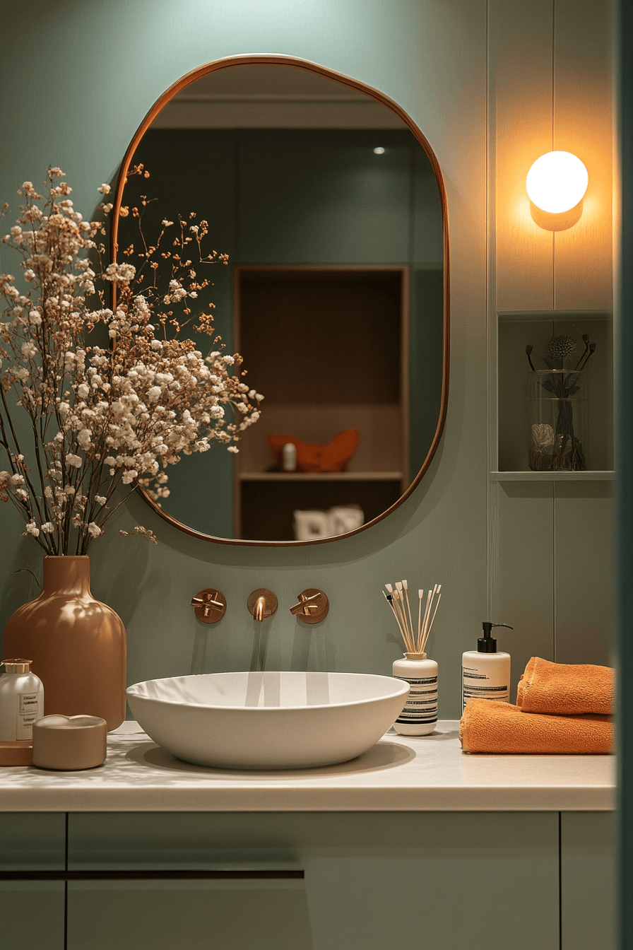 Curved shapes soften a light sage green bathroom by introducing organic lines and gentle movement. Rounded mirrors enhance the calming tone. Light sage green bathroom designs benefit from this soft contrast. Warm lighting adds a cozy glow. The space feels inviting and modern. Soften your design with curved elements.