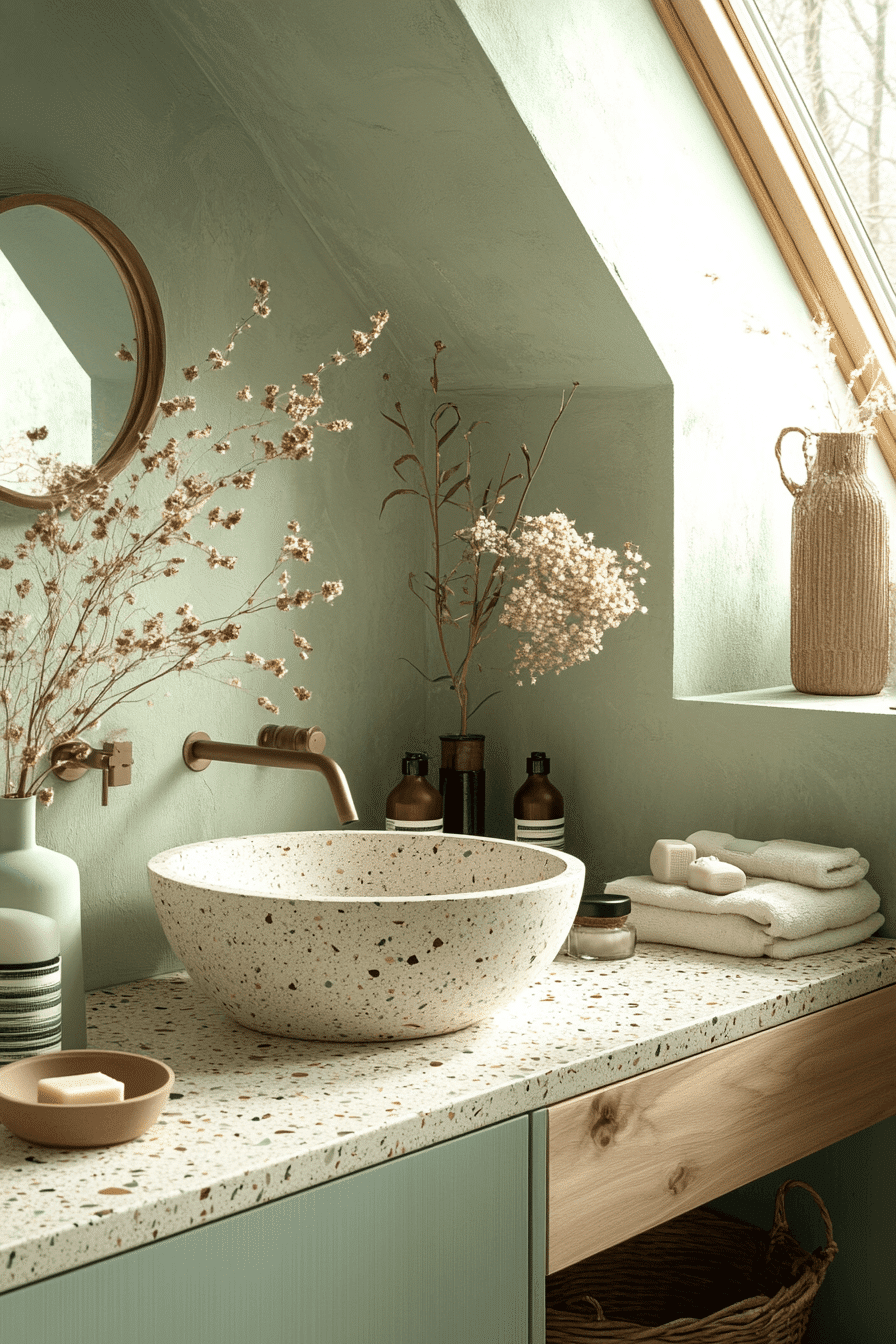 Terrazzo textures add playful detail to a light sage green bathroom while maintaining a calm palette. Speckled surfaces introduce subtle energy. Light sage green bathroom designs balance this texture beautifully. Simple surroundings keep everything cohesive. The space feels creative and refined. Add personality with terrazzo.