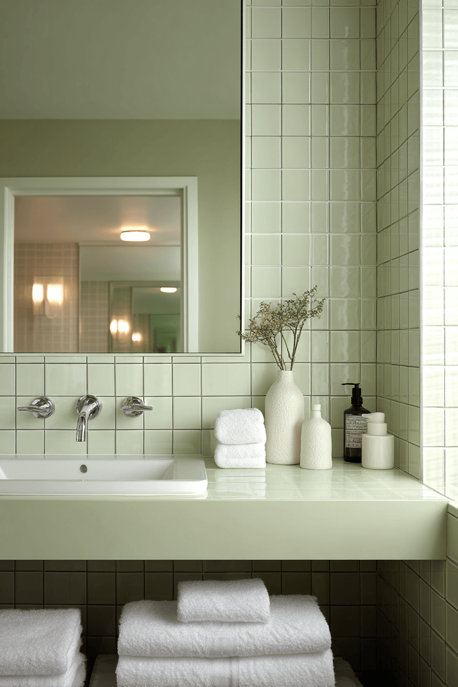 Linear tile arrangements introduce subtle movement into a light sage green bathroom while keeping the palette calm. Horizontal lines enhance the modern feel. Light sage green bathroom styles balance structure and softness. Sleek finishes complete the look. The space feels cohesive and contemporary. Add movement with linear tile.