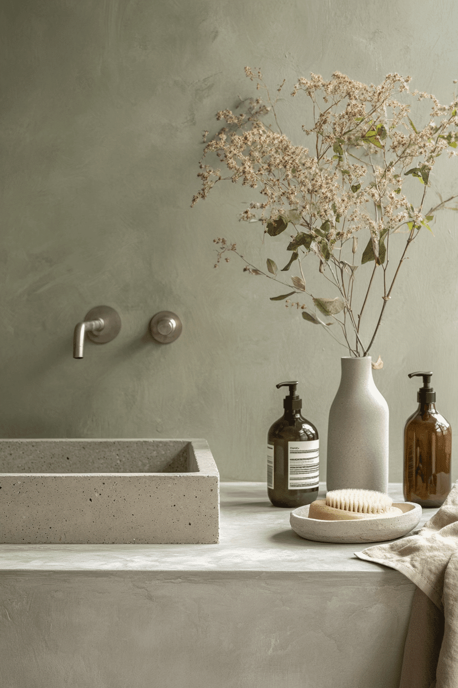 Concrete textures create contrast in a light sage green bathroom while maintaining a calm atmosphere. Raw finishes add modern character. Light sage green bathroom designs balance softness with structure. Neutral tones keep everything cohesive. The space feels unique and grounded. Add modern texture with concrete.