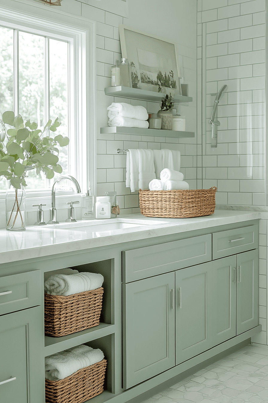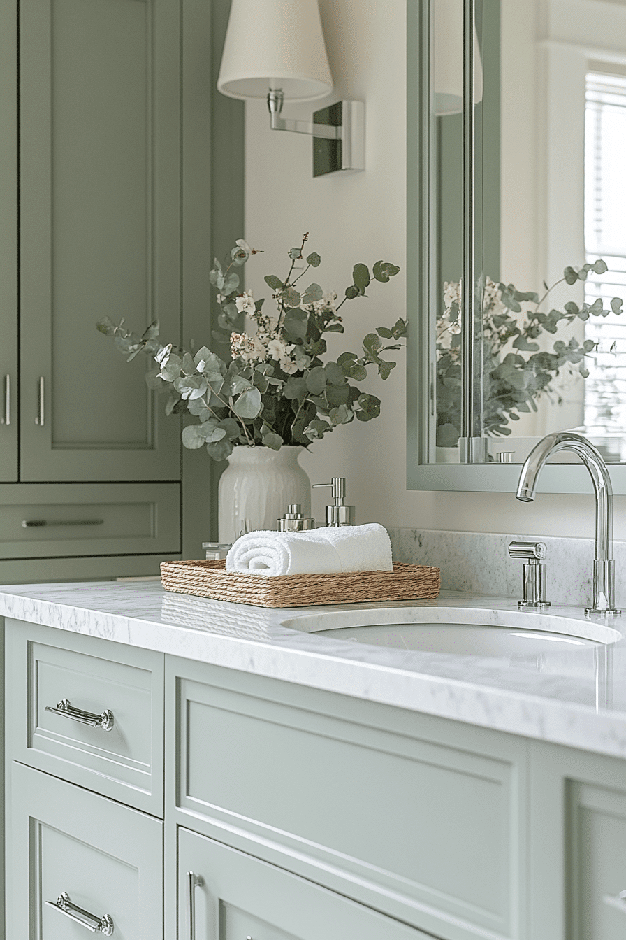 Feature vanities add personality to a light sage green bathroom while maintaining a soft and modern look. Sage cabinetry becomes a focal point without overwhelming the space. Light sage green bathroom vanities pair beautifully with sleek countertops and subtle hardware. Mirrors and lighting enhance the overall brightness. The design feels clean and elevated. Update your vanity with this fresh idea.