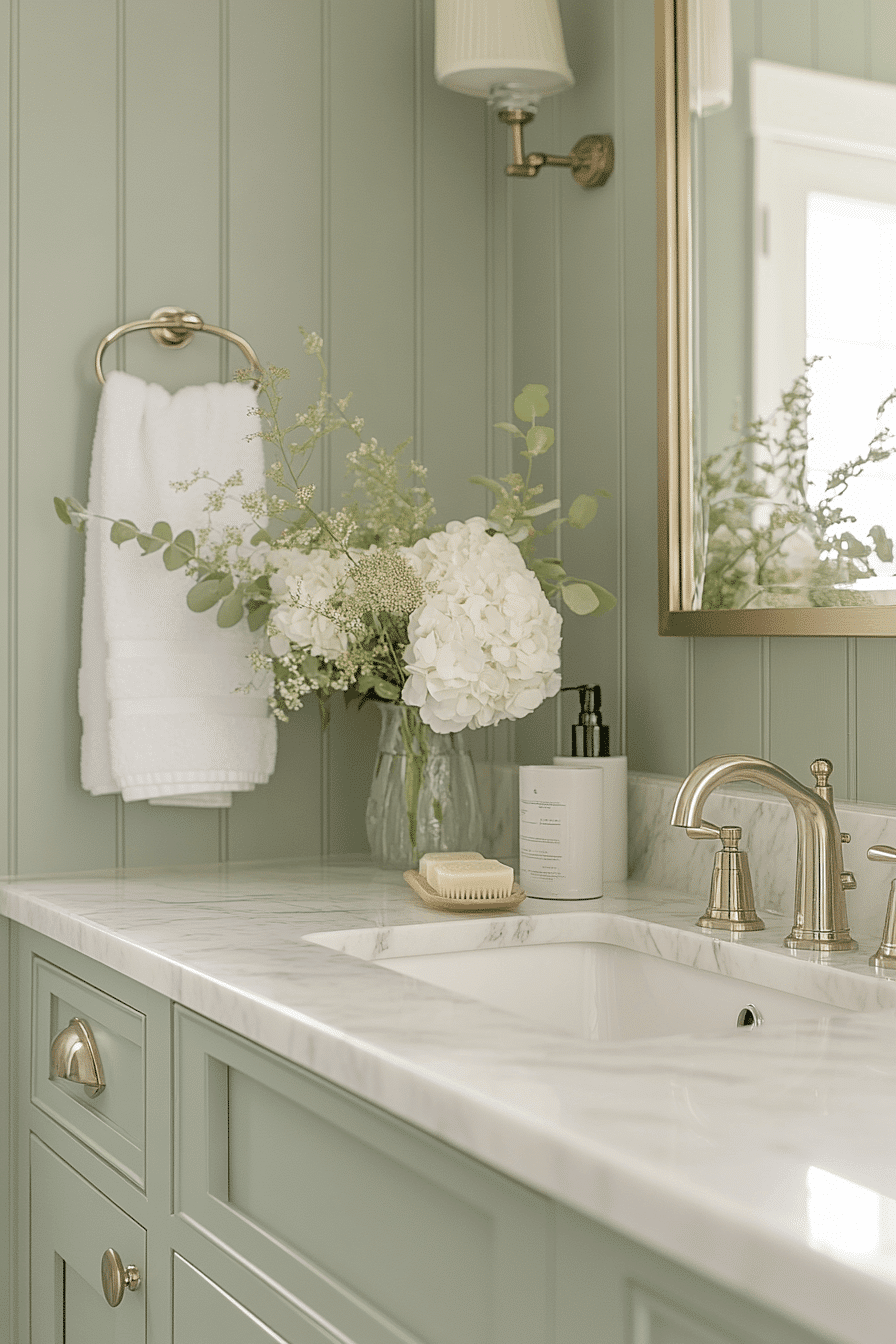 Wainscoting details add refined structure to a light sage green bathroom while keeping the design light. Lower panels introduce depth without heaviness. Light sage green bathroom tones soften the contrast. Brighter upper walls enhance openness. The design feels timeless and fresh. Add structure with modern wainscoting.