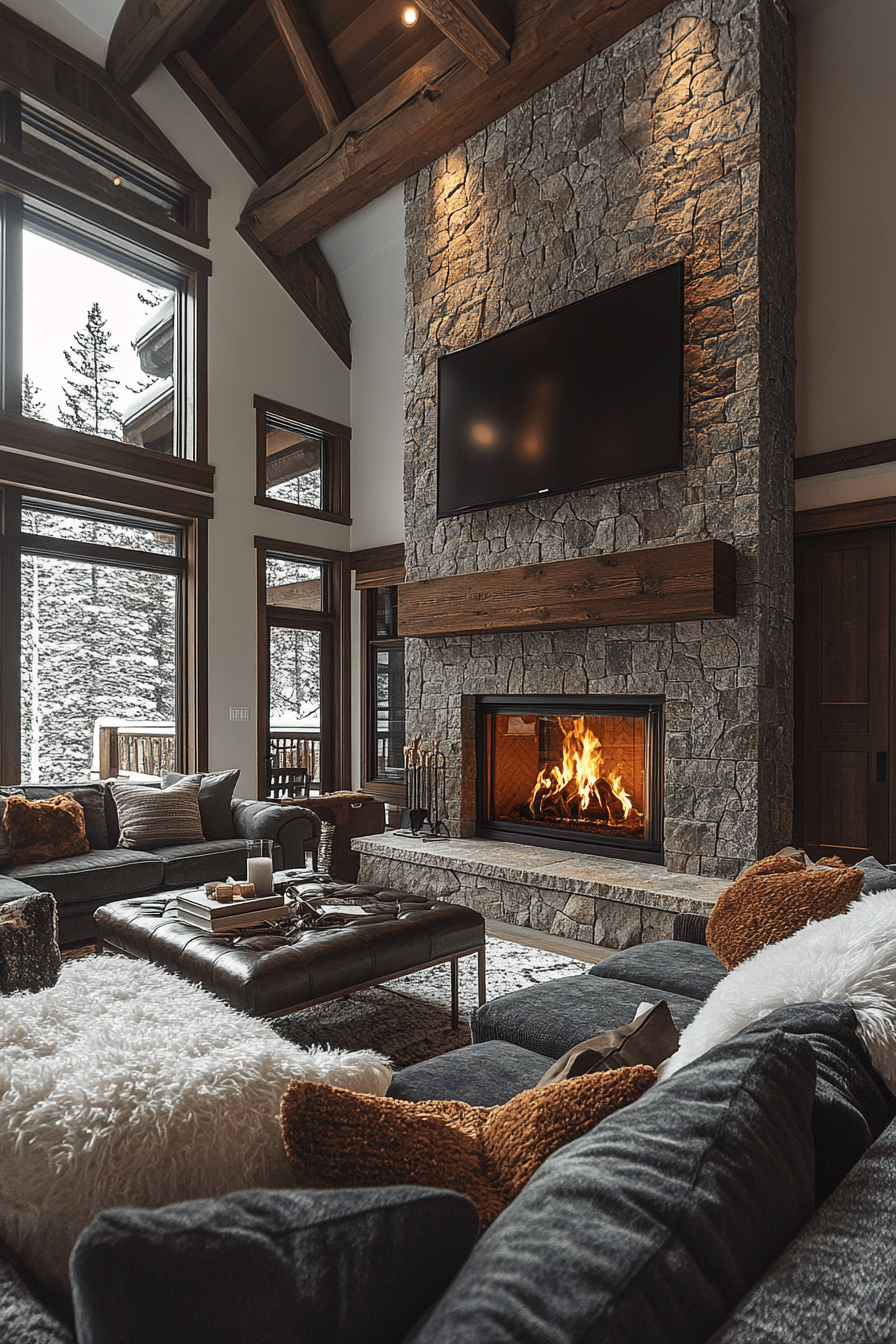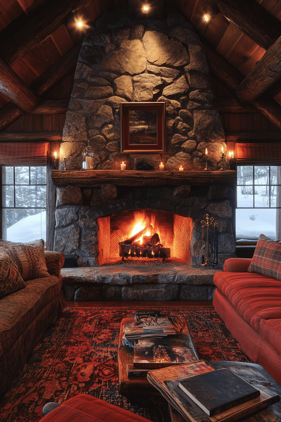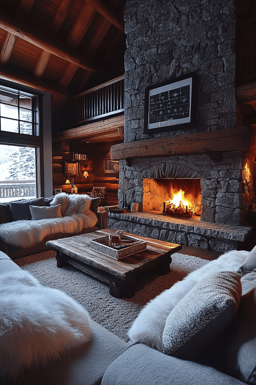 Snowy nights become magical in this cozy little cabin living room glowing with winter warmth. A soft firelight flickers against rustic stone and wood tones. Faux fur, thick blankets, and ambient lamps create the perfect retreat from the cold. It’s the ultimate haven for snowy evenings in.