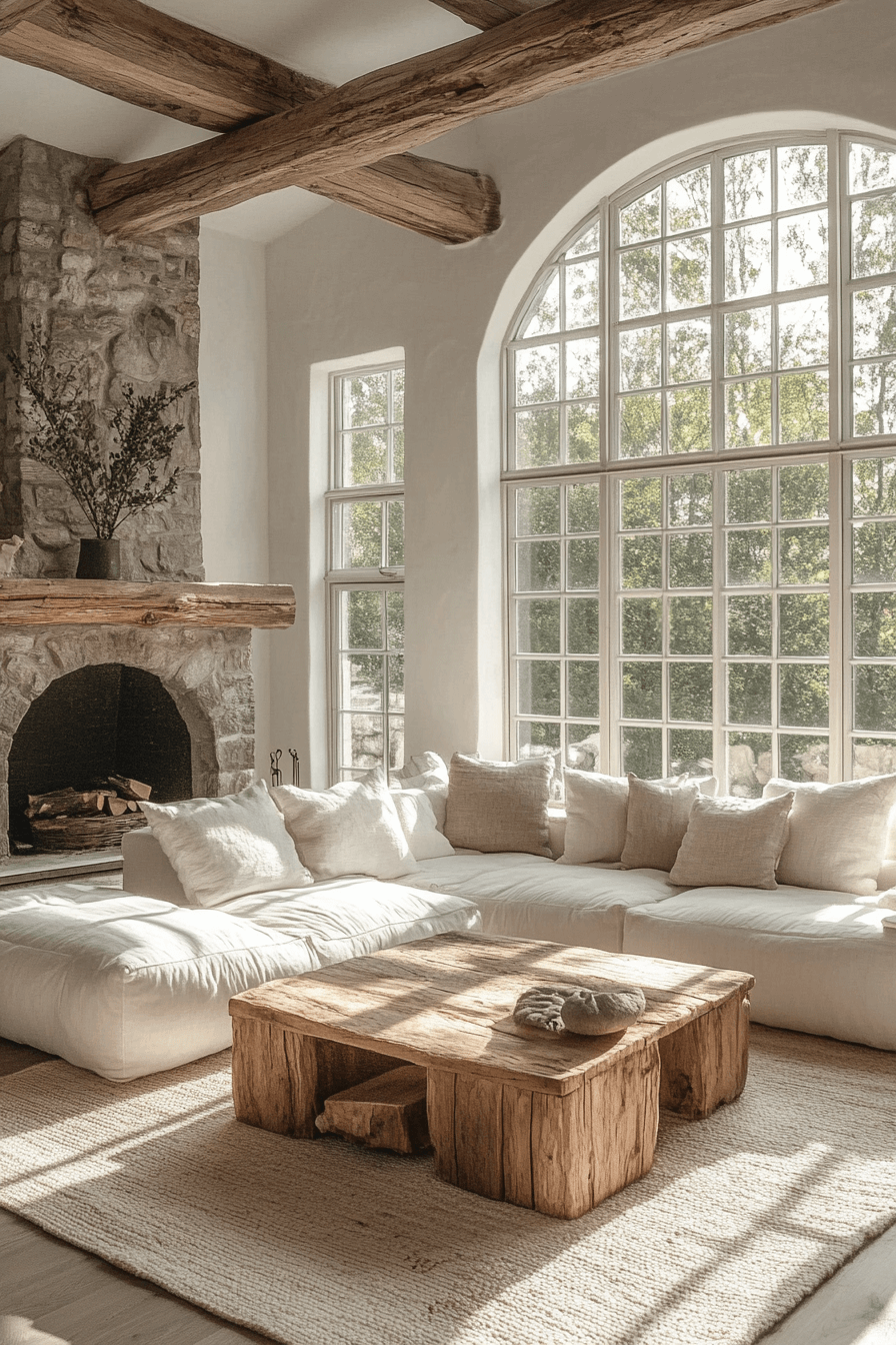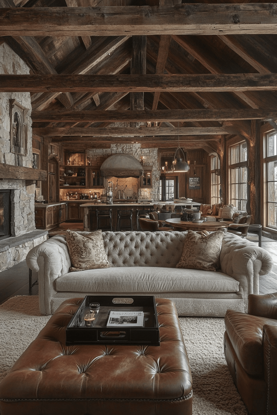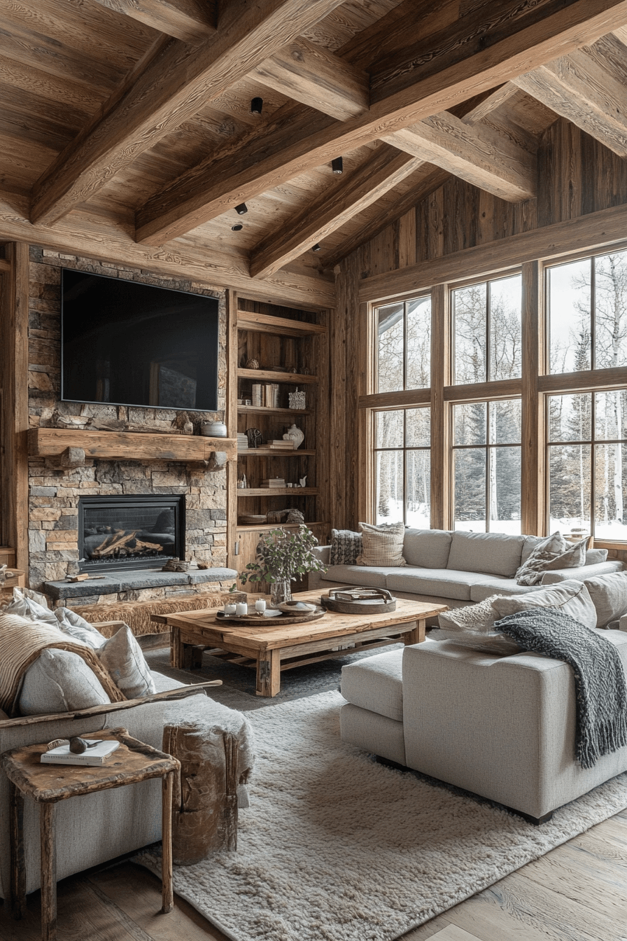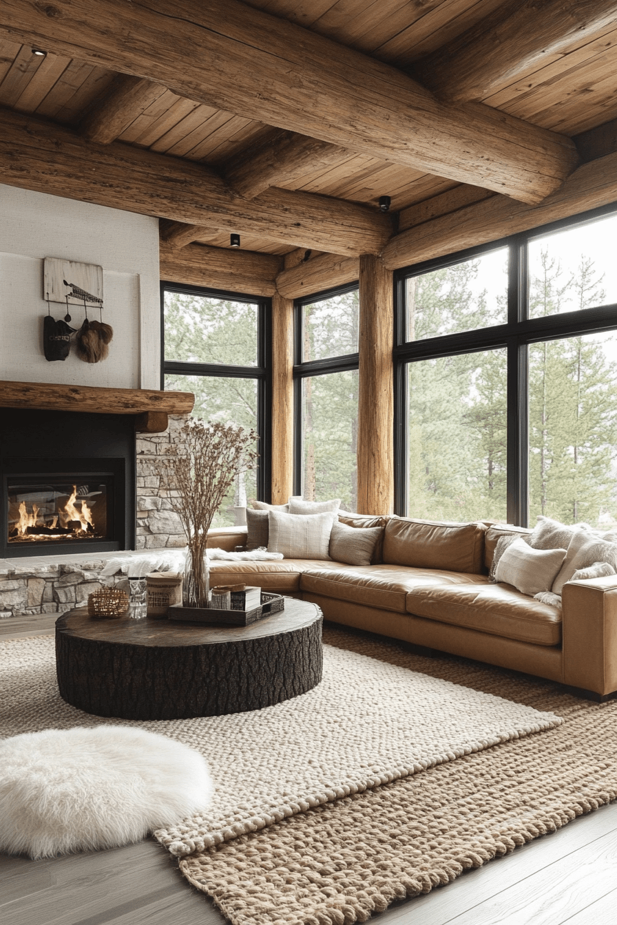 Elegance meets rustic in this little cabin living room that balances soft refinement and natural grace. Exposed beams and smooth textiles create layers of warmth. The color palette glows with creamy neutrals and earthy browns. Every element feels both sophisticated and soulful.