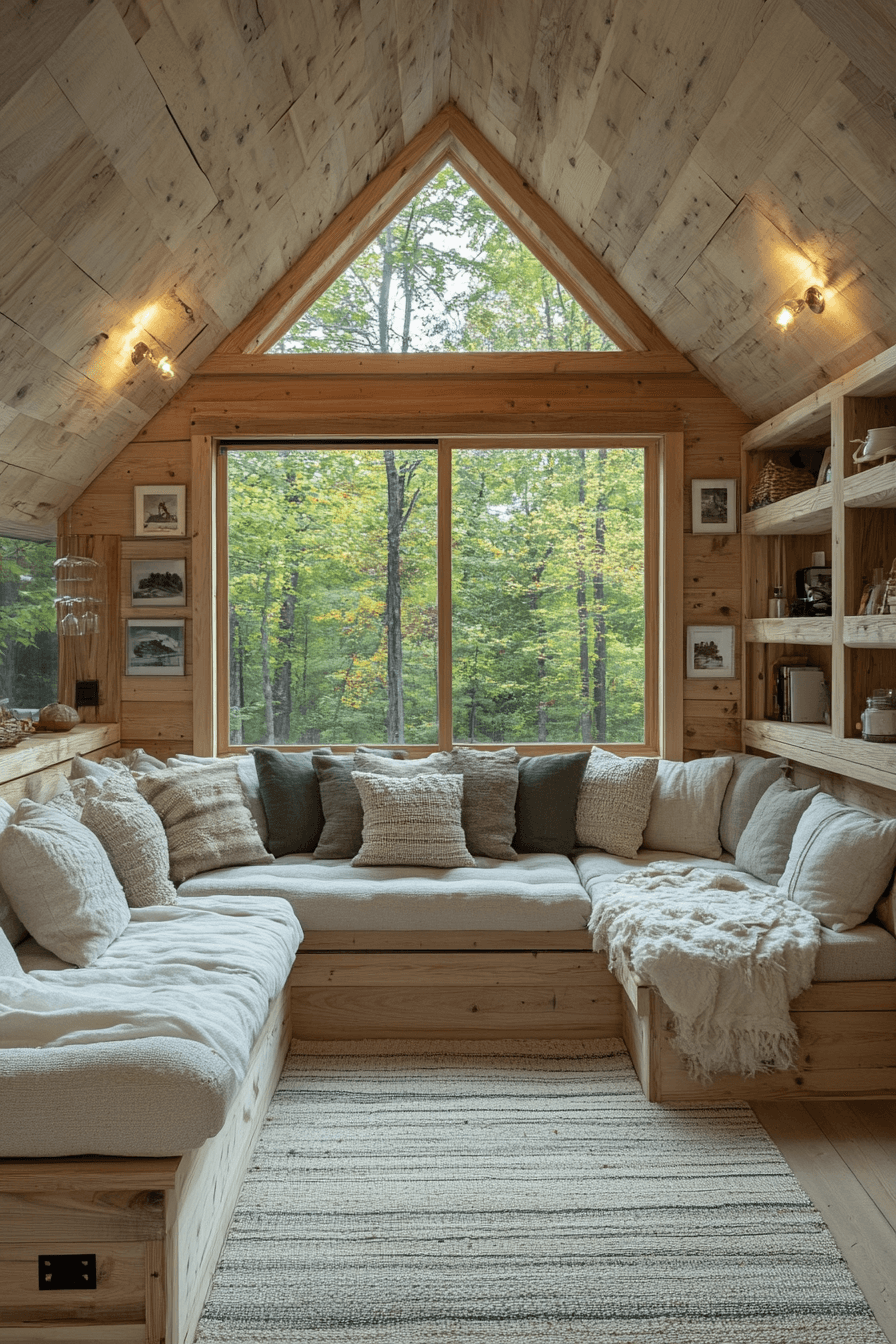 Air and sunshine fill this bright little cabin living room, turning simplicity into pure joy. Large windows open the space while light wood tones create natural harmony. Soft textiles and gentle colors add warmth without heaviness. It’s a cheerful place for connection and peace.