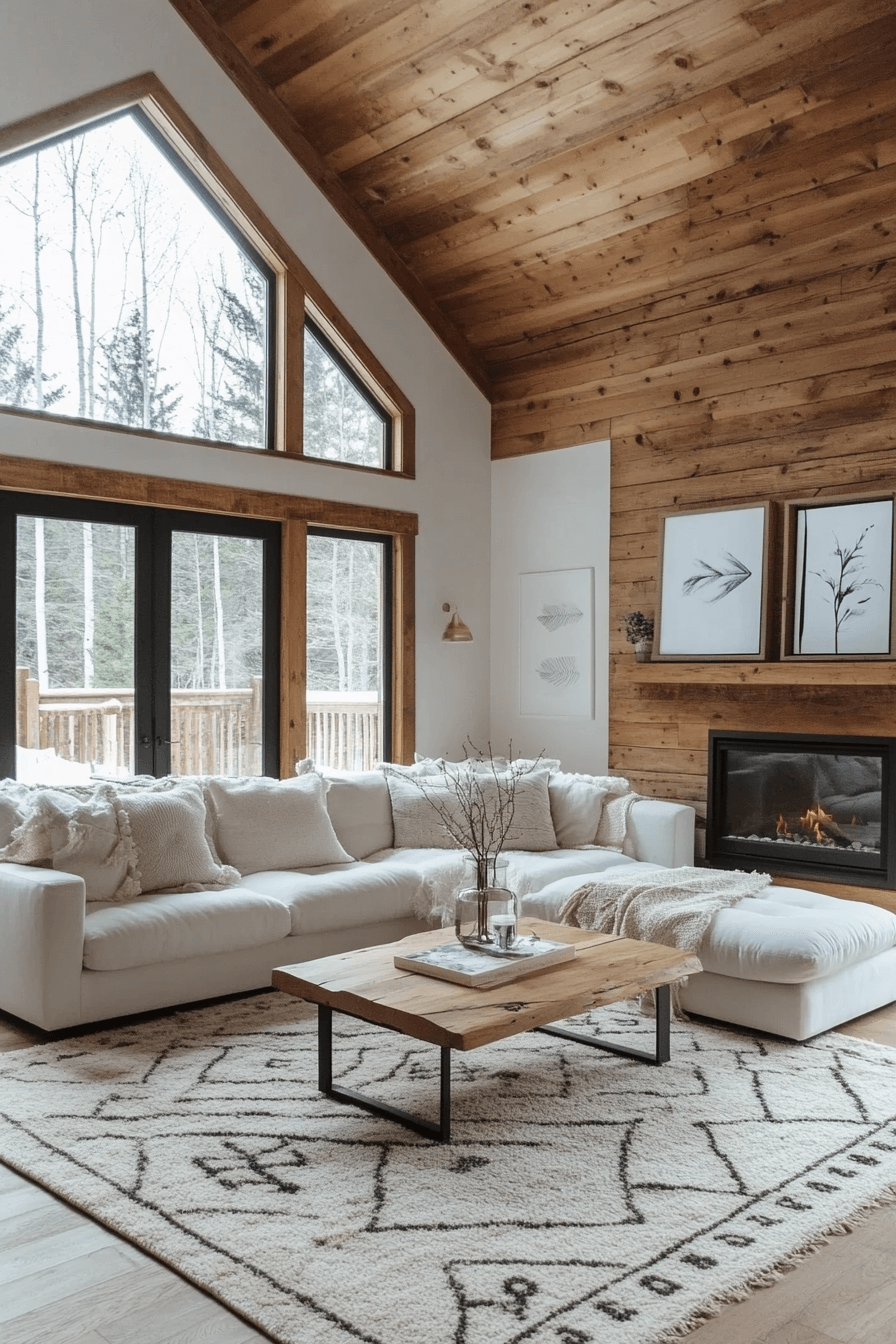 Contemporary lines meet rustic warmth in this little cabin living room built for modern relaxation. Natural wood frames the space while soft lighting sets the mood. Neutral shades give it elegance without losing coziness. The open layout enhances flow and ease.