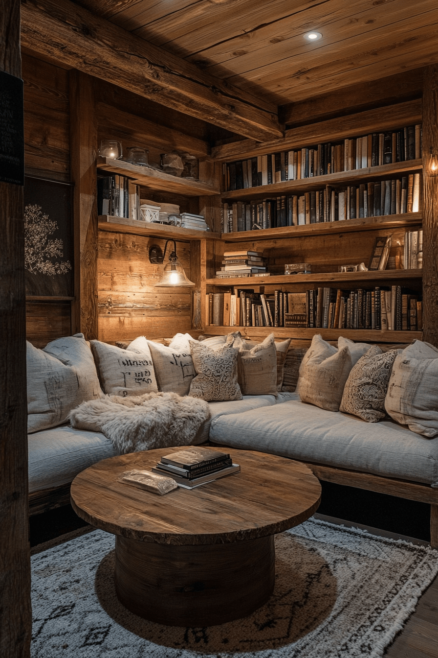 Warm tones and natural materials define this inviting little cabin living room full of earthy character. Handcrafted furniture and glowing lights create an atmosphere that hugs you in comfort. The mix of textures feels authentic and timeless. Every inch radiates rustic tranquility and heart.