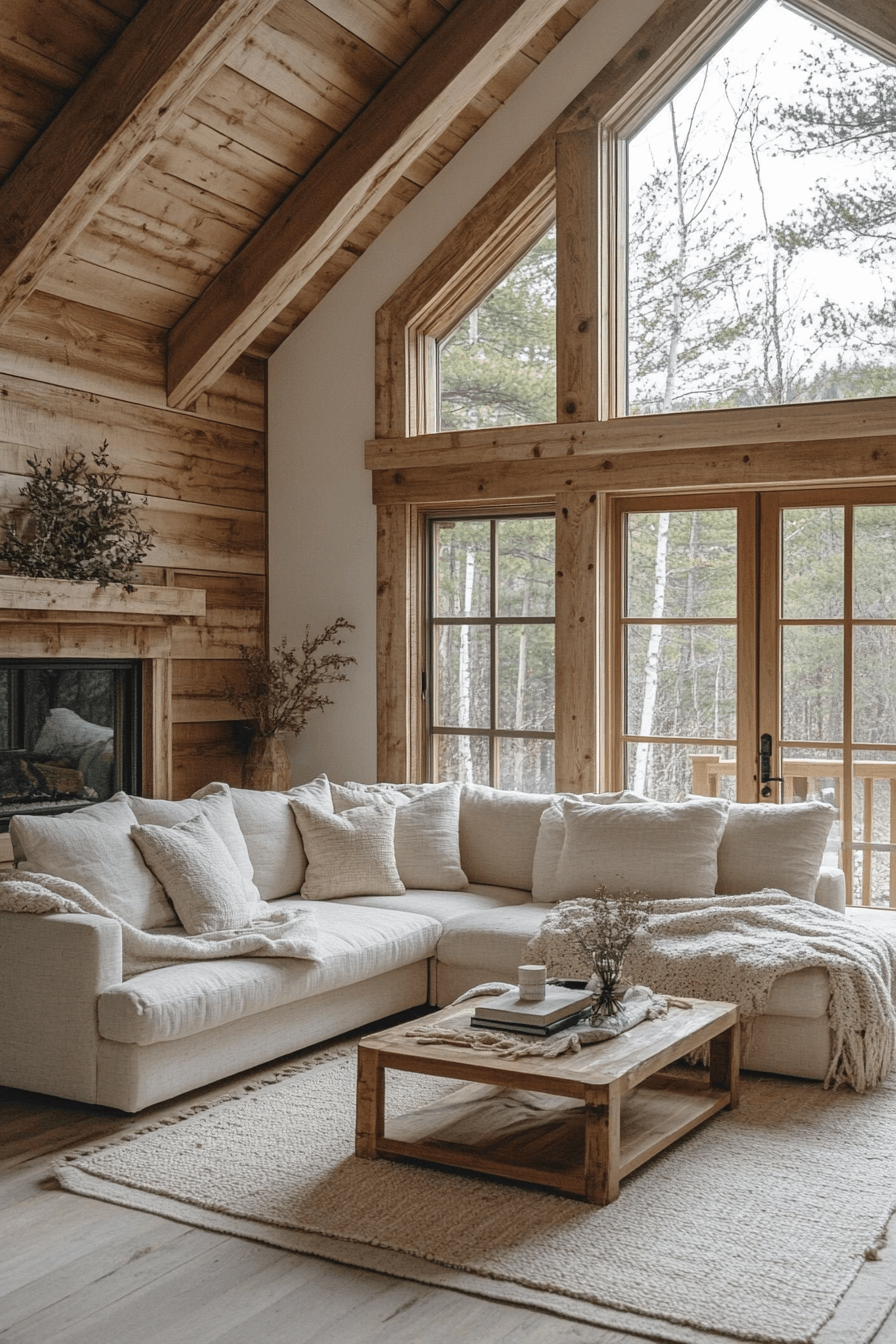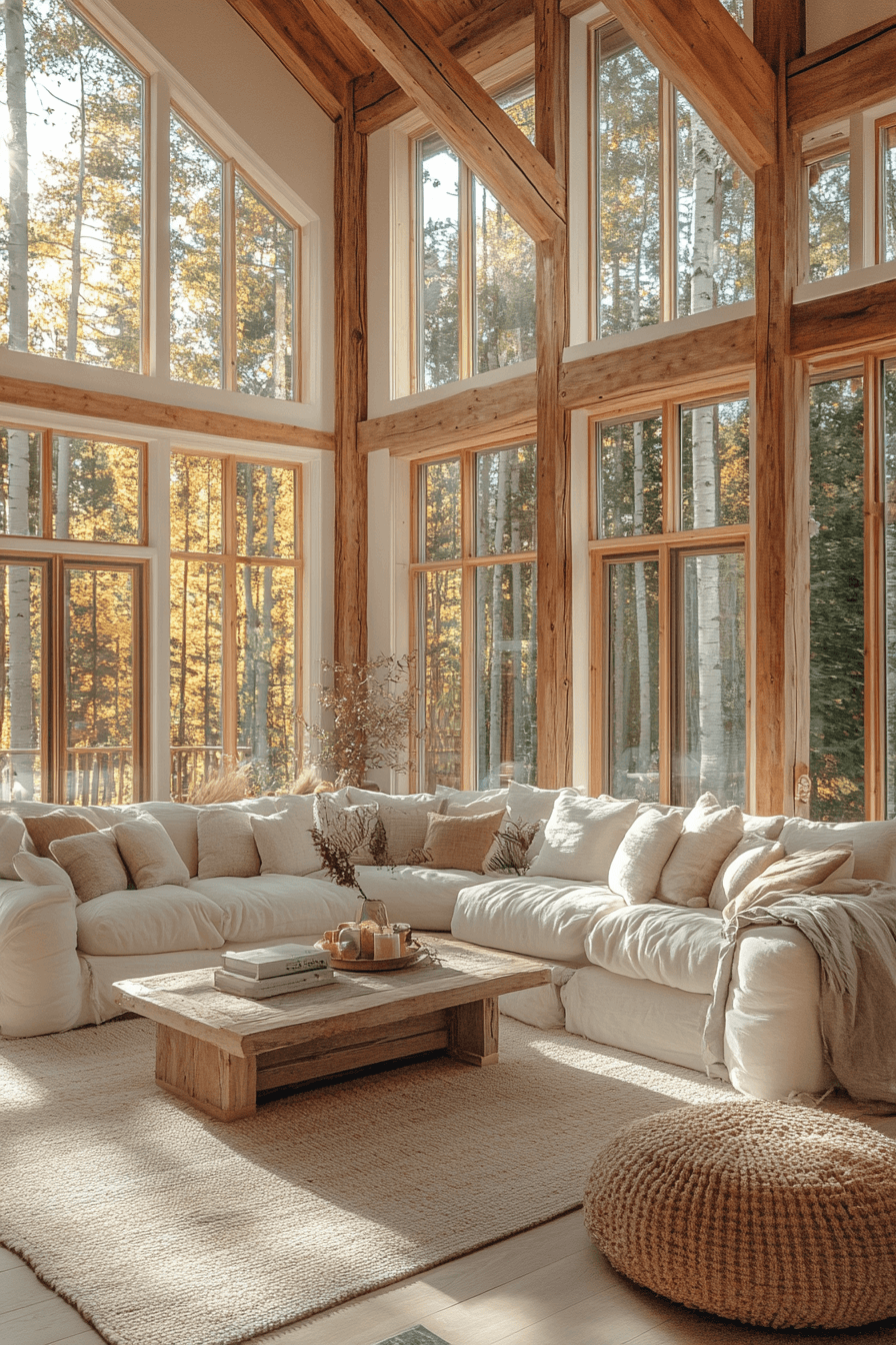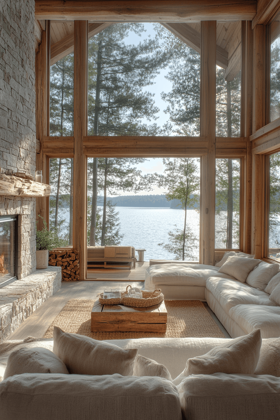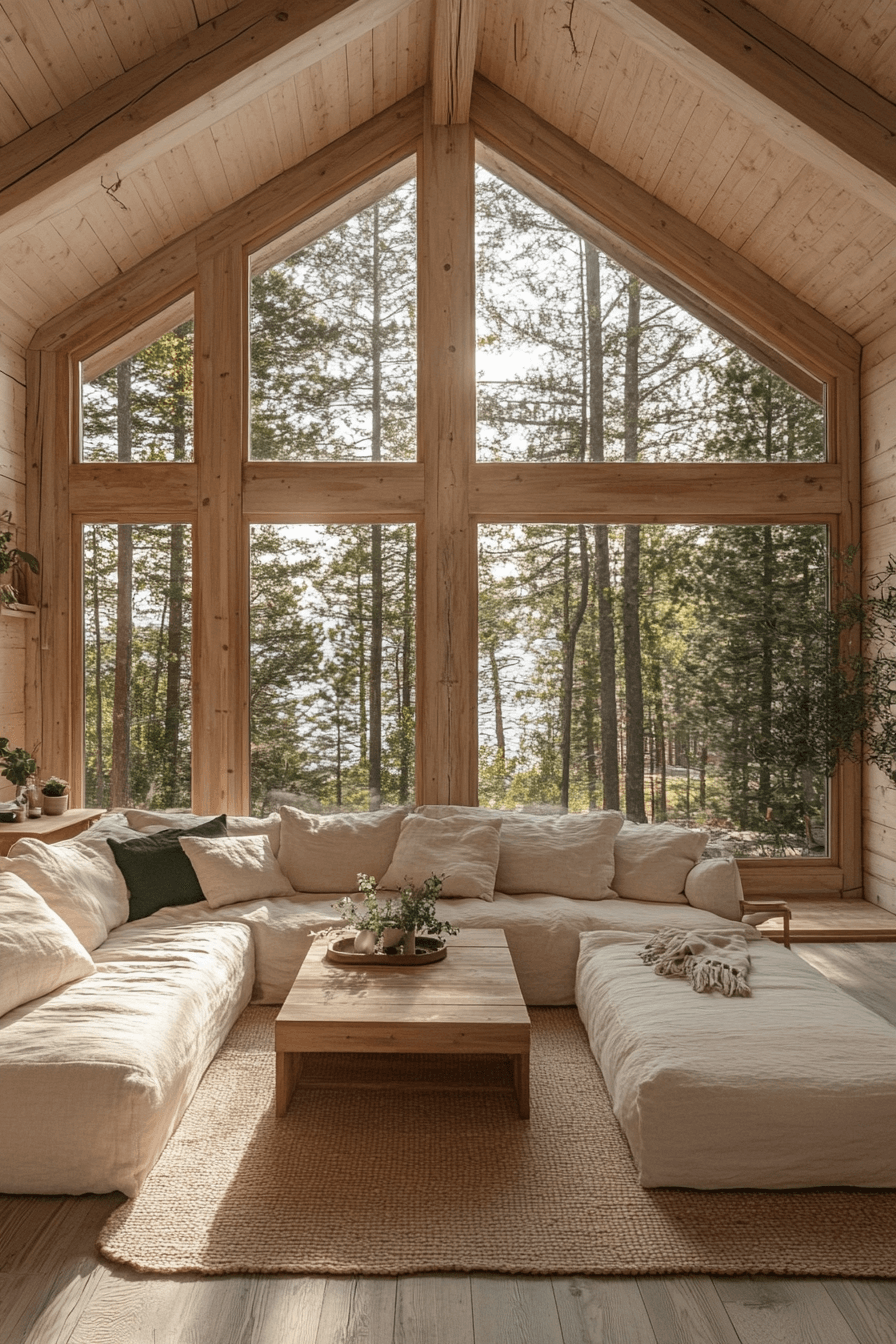 Sunlight and serenity flow through this bright little cabin living room filled with natural calm. Floor-to-ceiling windows connect you seamlessly with the outdoors. Neutral hues enhance the feeling of openness and renewal. Every moment here feels like a soft sigh of relief.