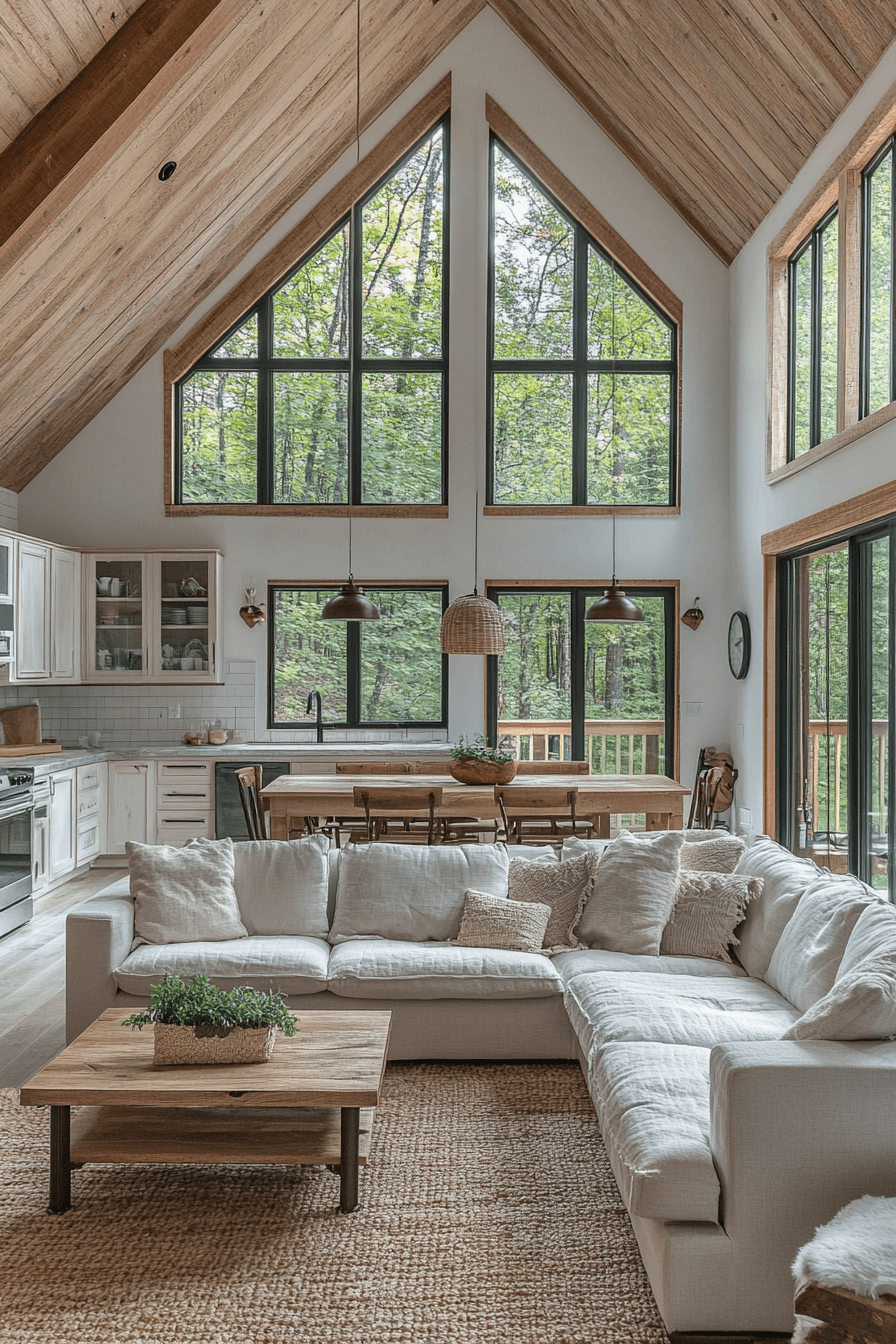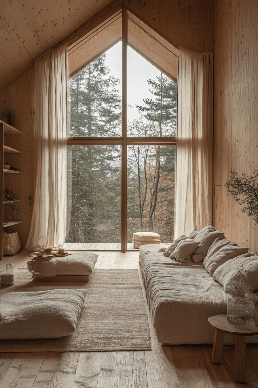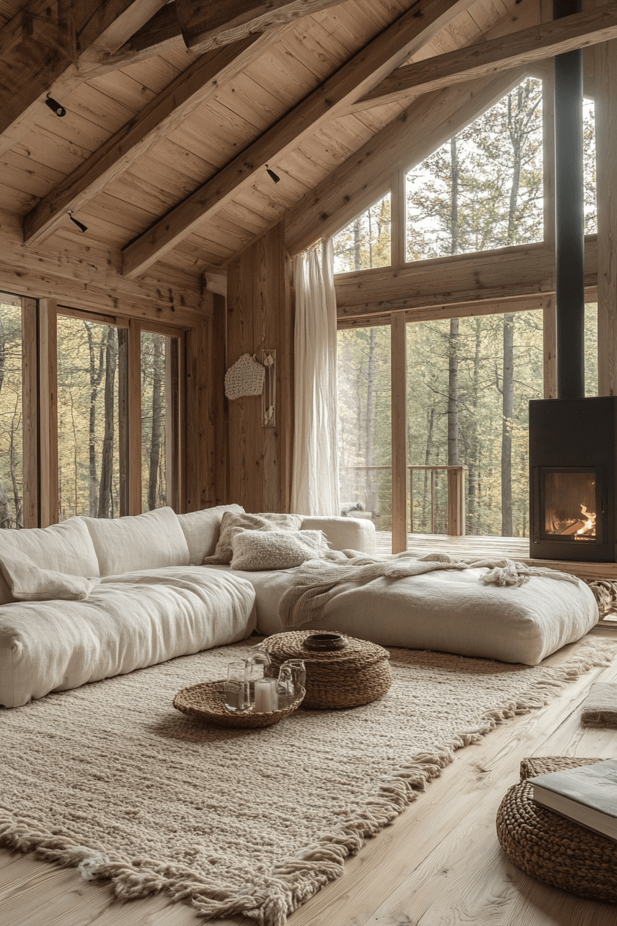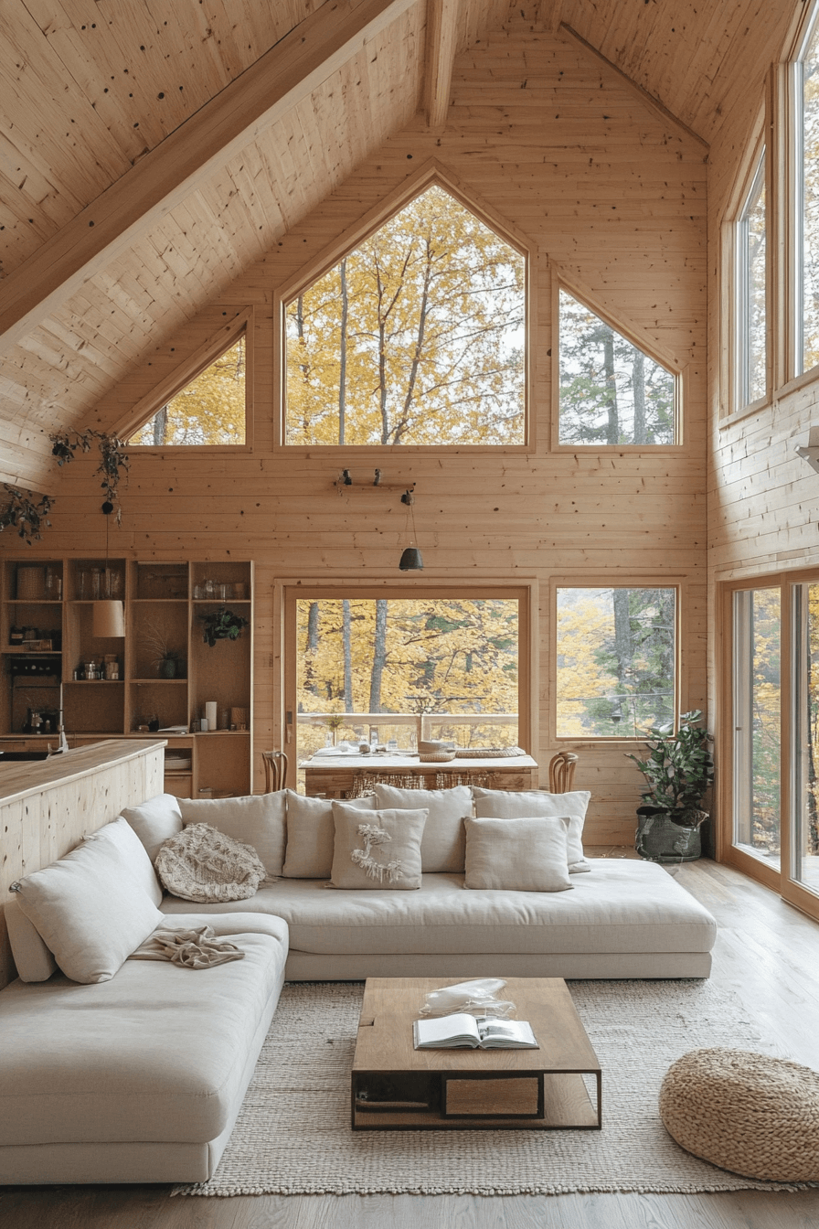 Sunlight and serenity flow through this bright little cabin living room filled with natural calm. Floor-to-ceiling windows connect you seamlessly with the outdoors. Neutral hues enhance the feeling of openness and renewal. Every moment here feels like a soft sigh of relief.