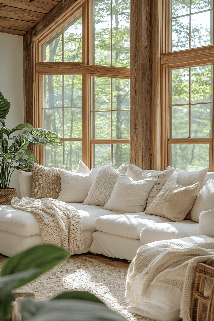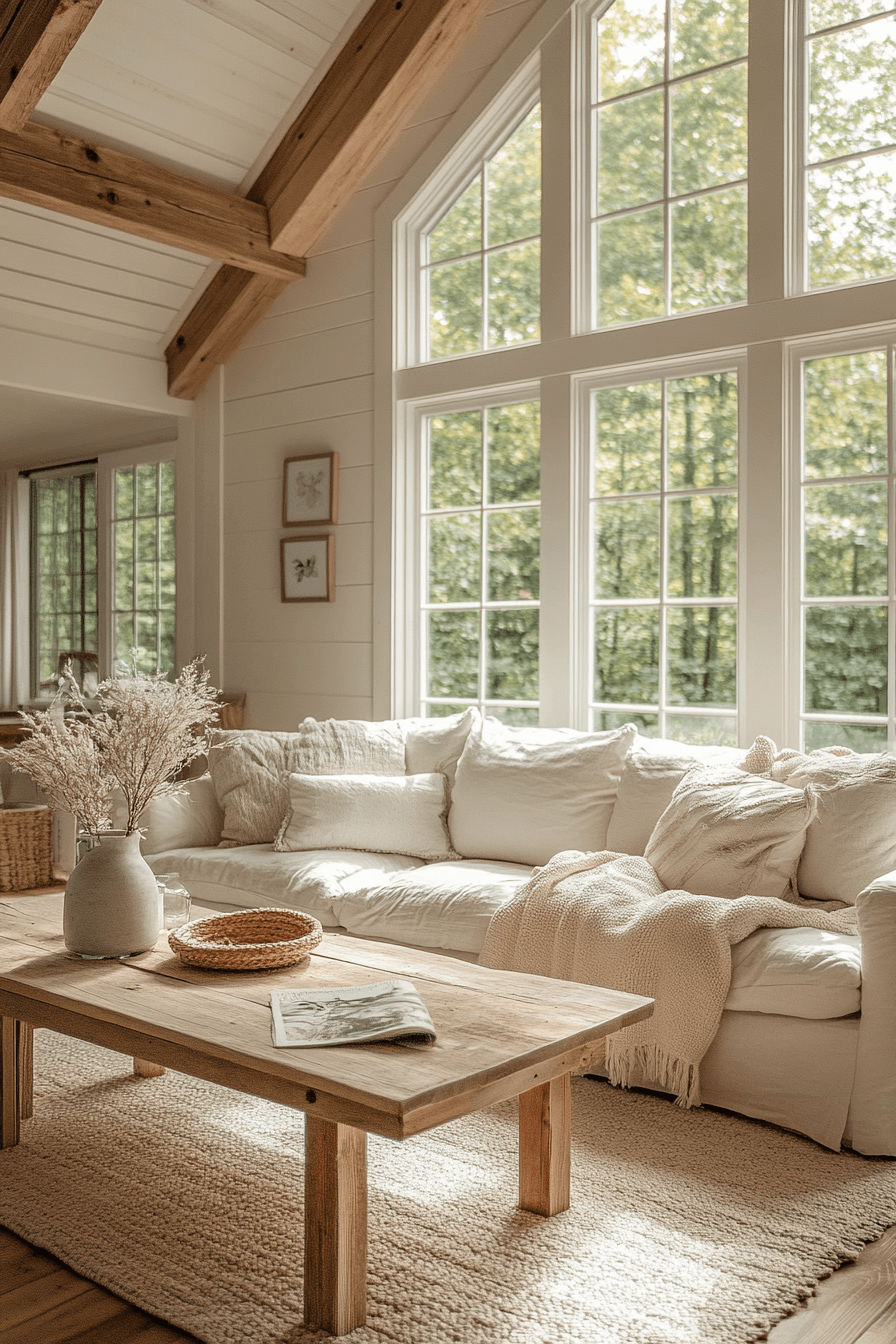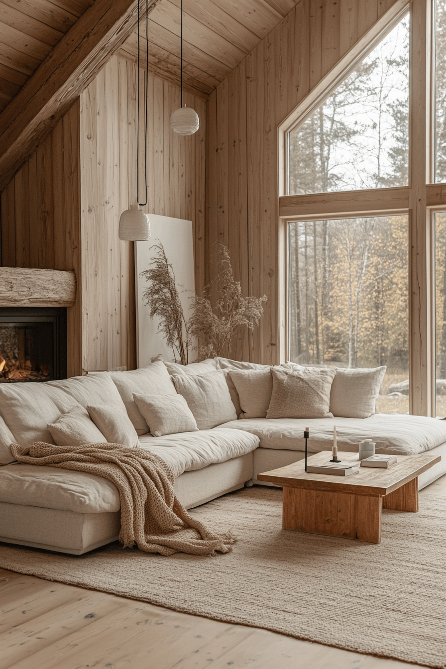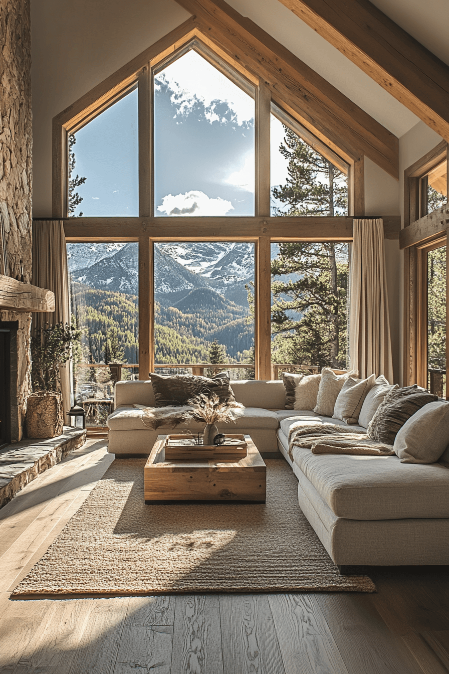 Sunlight and serenity flow through this bright little cabin living room filled with natural calm. Floor-to-ceiling windows connect you seamlessly with the outdoors. Neutral hues enhance the feeling of openness and renewal. Every moment here feels like a soft sigh of relief.