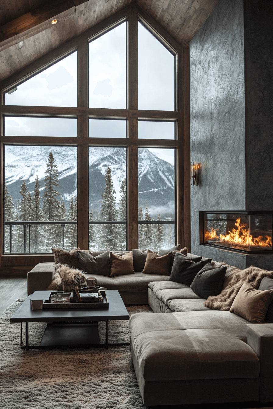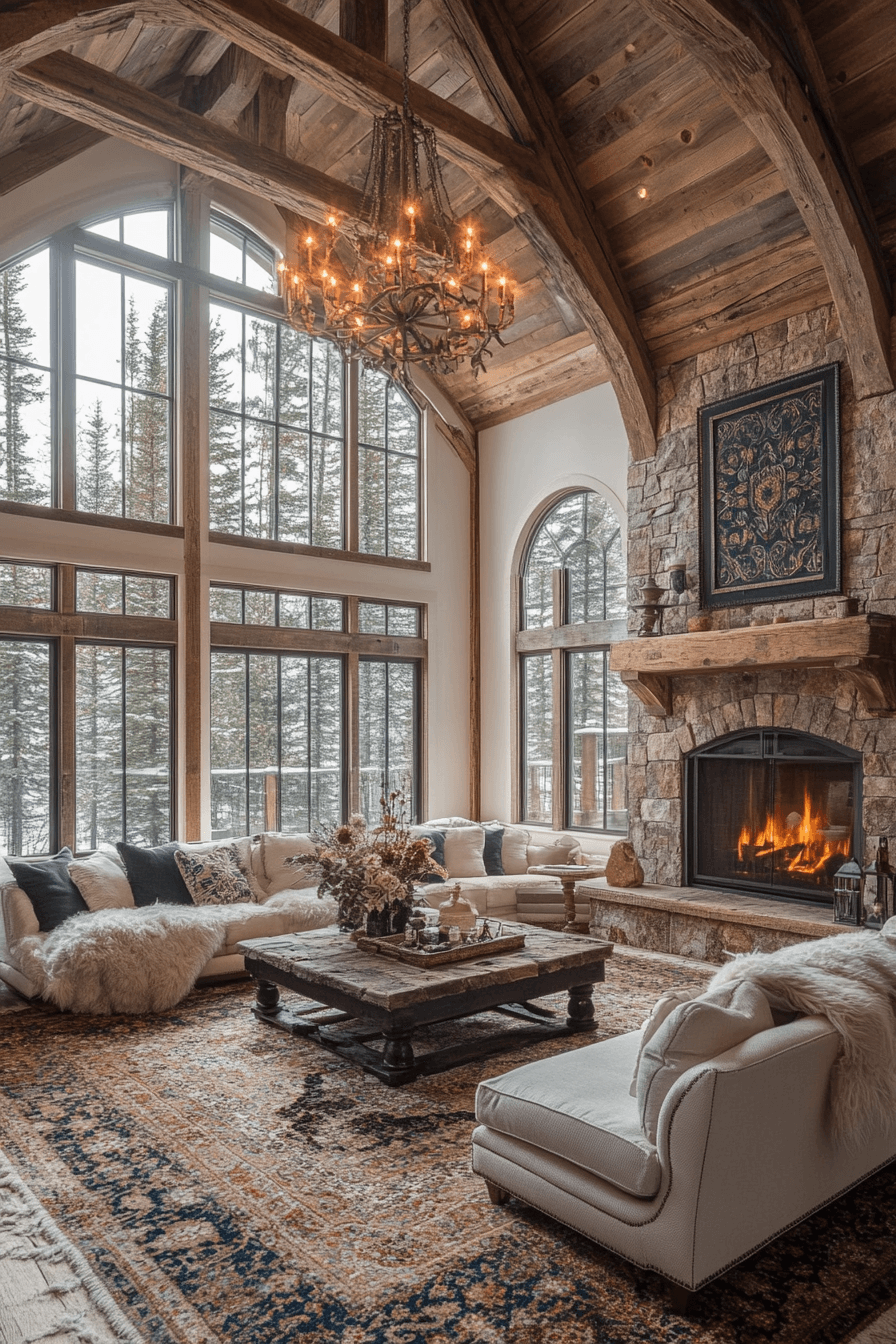 This little cabin living room balances mountain charm with modern sophistication. Smooth stone, light wood, and soft fabrics create a clean yet cozy aesthetic. The blend of metal accents and rustic details feels elevated but grounded. Sunlight spills through, highlighting its timeless beauty.
