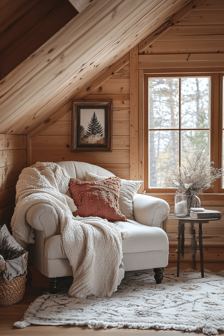 This intimate corner of a little cabin living room proves that small can feel luxurious. A comfy chair, warm lighting, and simple wood décor transform it into a restful escape. The textures bring depth, while the stillness invites reflection. It’s the perfect spot to pause and breathe.