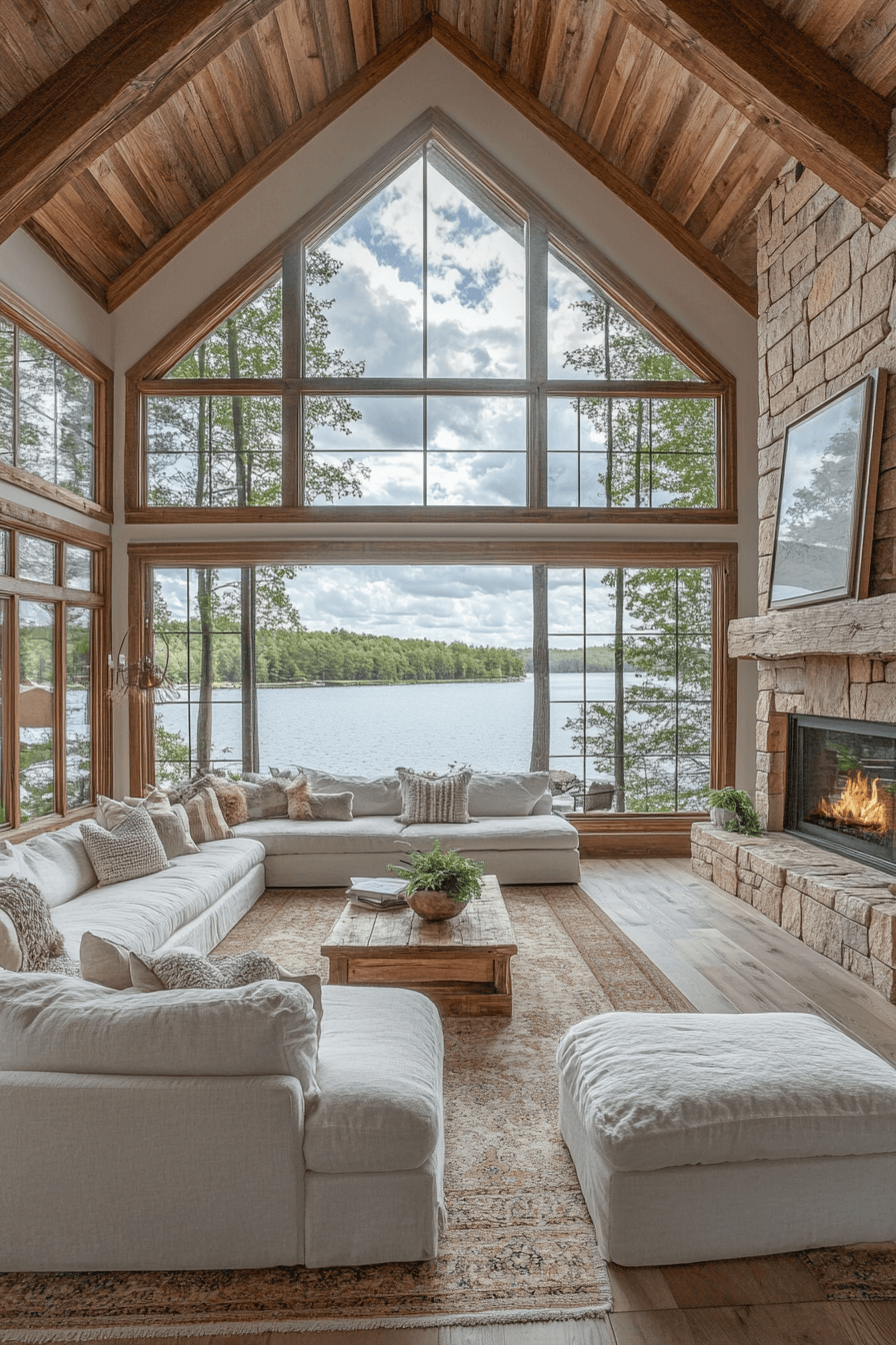 Calm reflections dance across this lakeside-inspired little cabin living room. Soft seating and muted tones mimic the stillness of the water. Natural stone and wood details add grounding texture. It’s a perfect fusion of serenity and simple luxury.