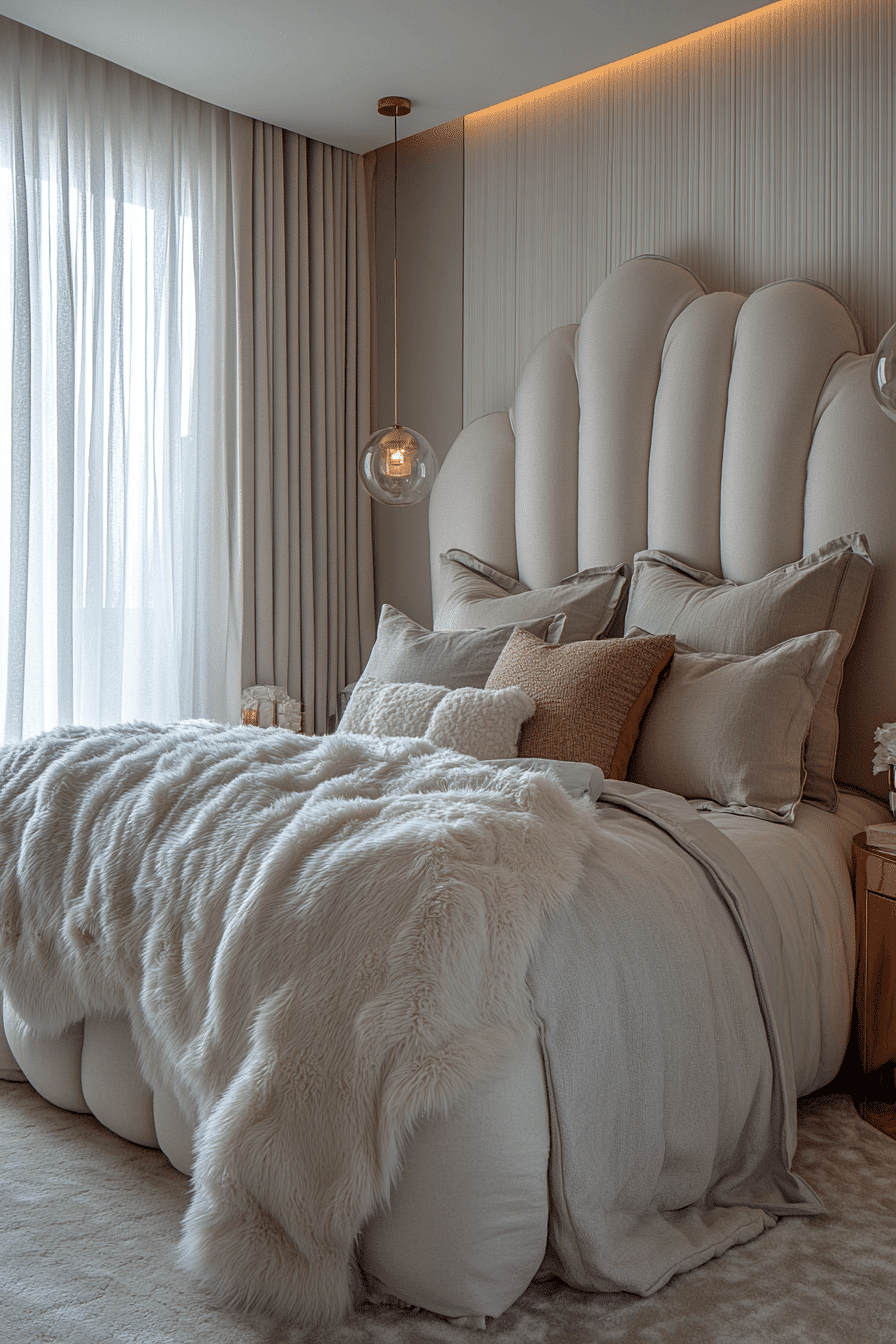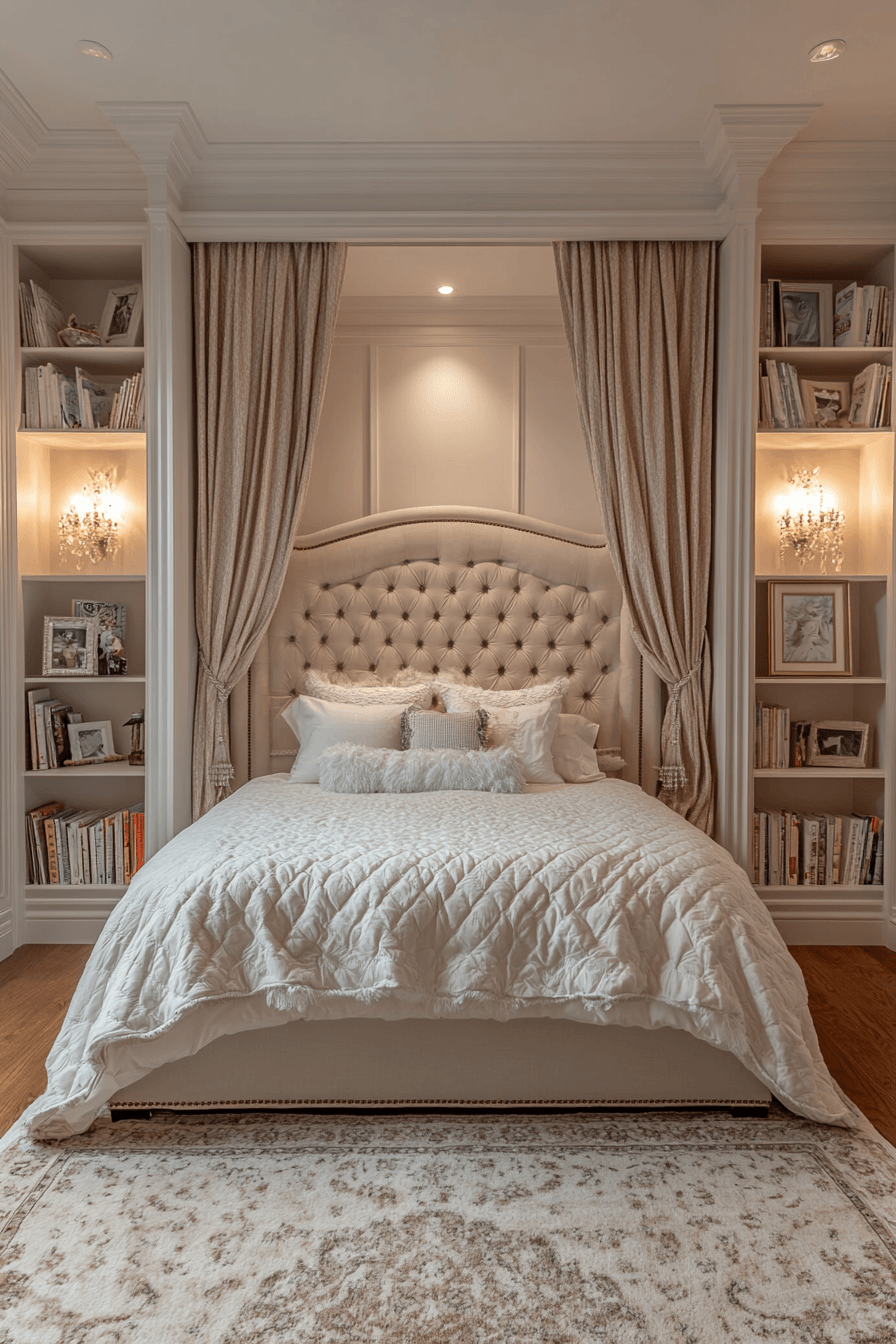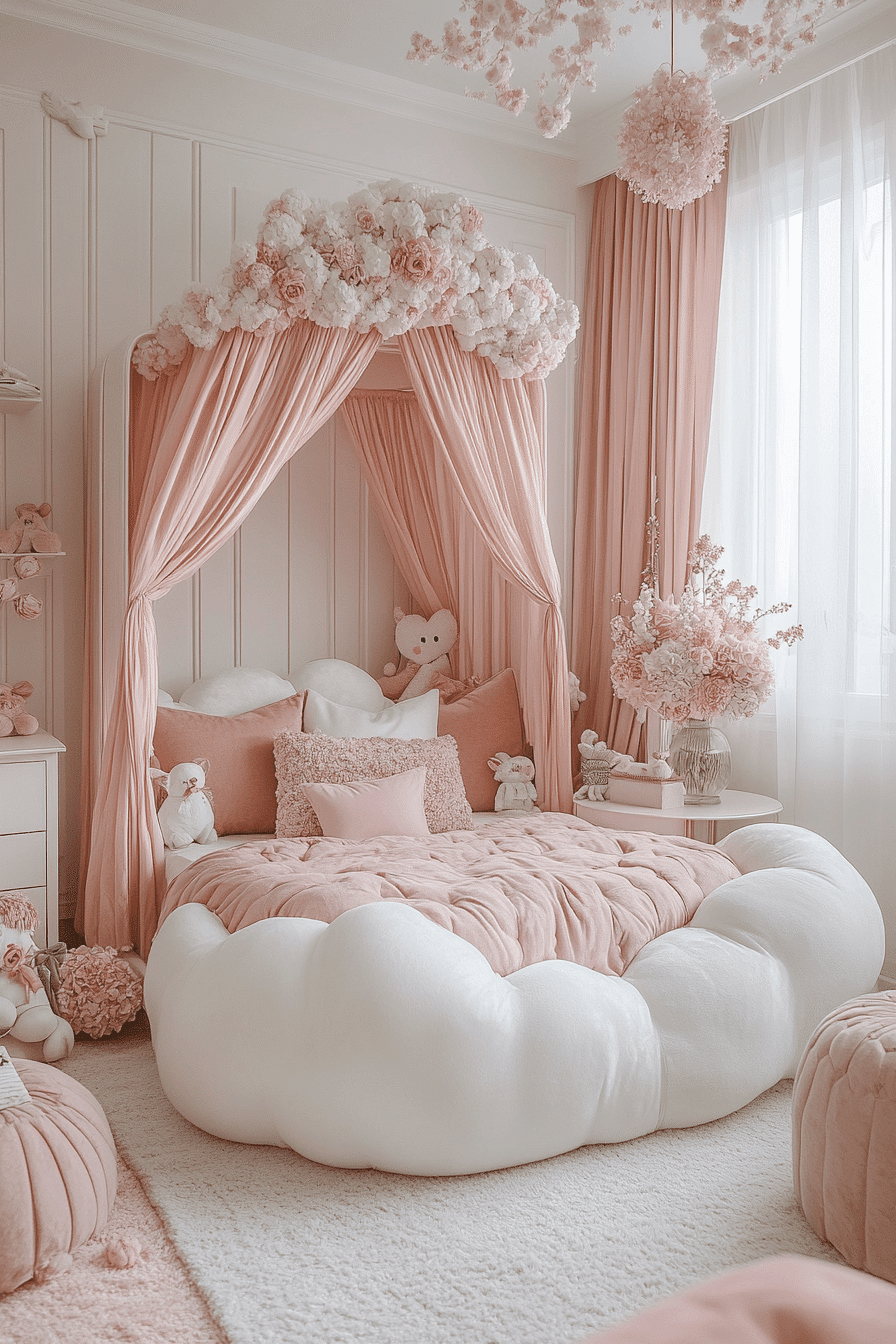 This cloud-soft luxury kids bedroom feels inviting, airy, and wrapped in comfort. Cushioned furniture, thick rugs, and plush headboards create a layered look that feels rich and relaxing. Flowing materials and canopy details add a soft dramatic touch without losing the room’s cozy appeal. Decorative lighting and elegant stitched fabrics make the design feel even more special. Every piece adds to the sense of warmth and softness. Wander through more dreamy room inspiration and design a retreat that feels like floating.