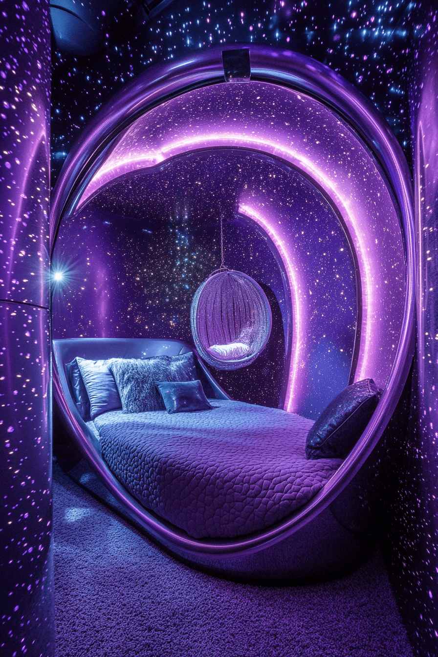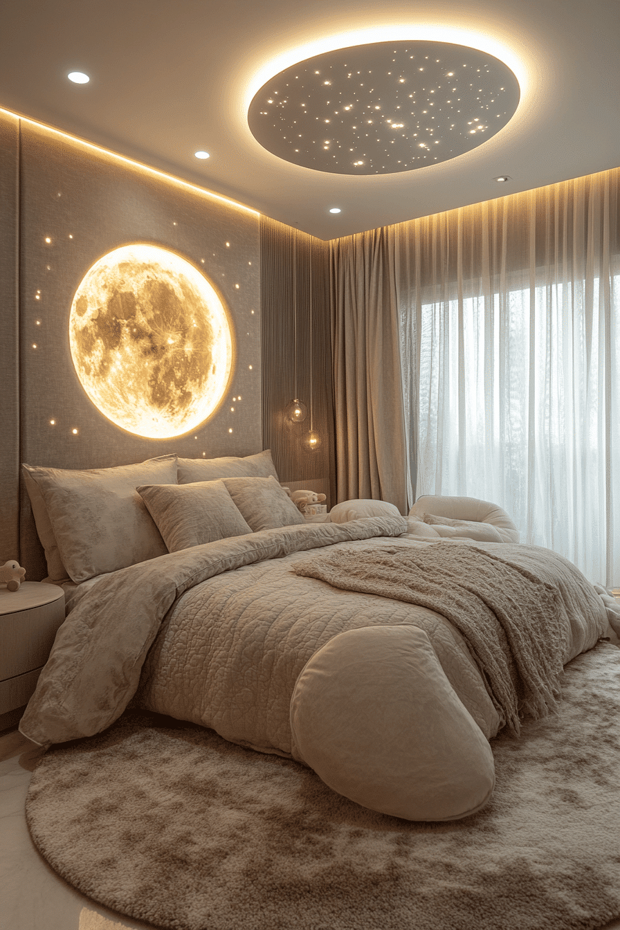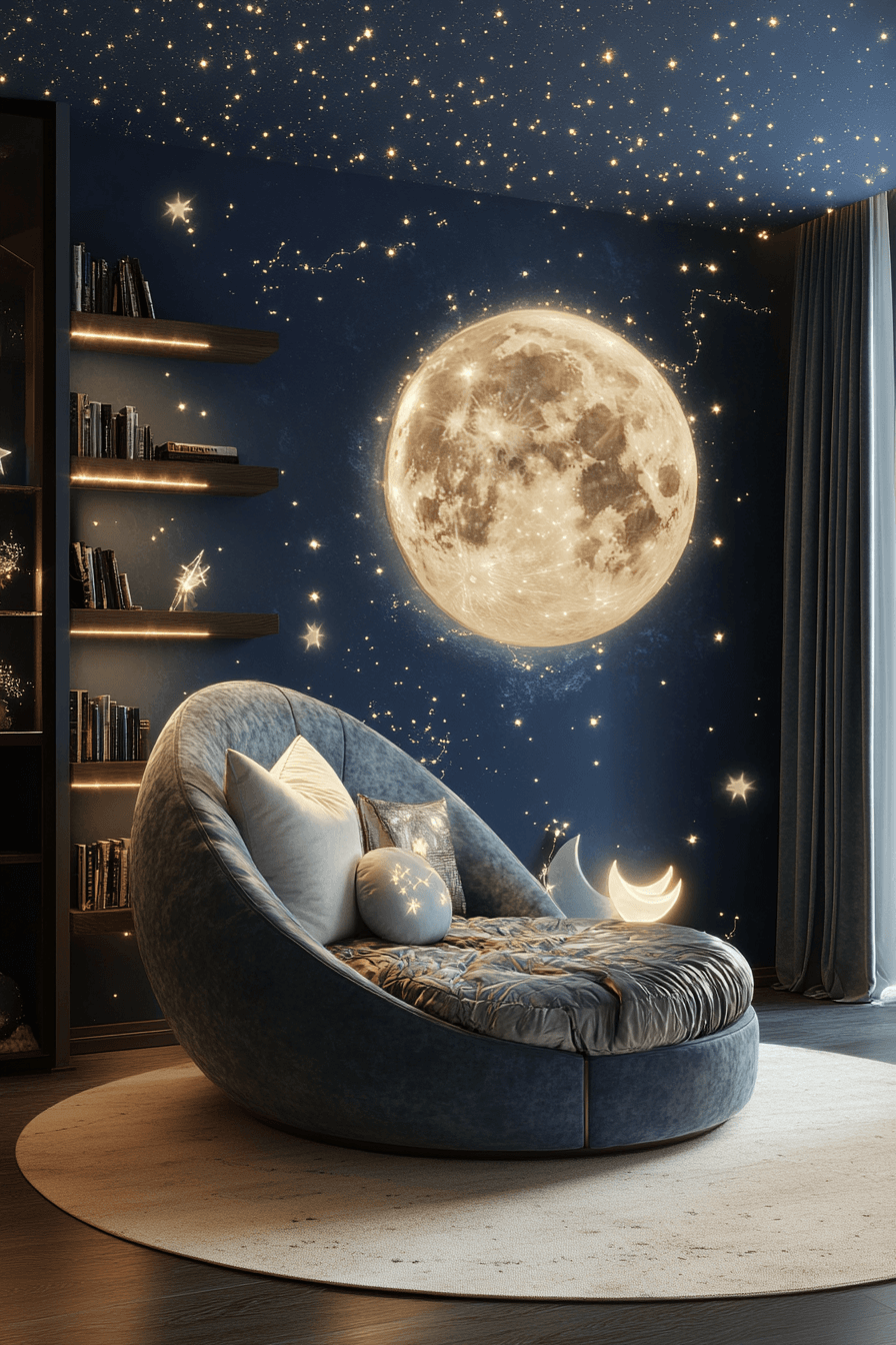 A celestial luxury kids bedroom brings the wonder of the night sky indoors in the most magical way. Deep midnight tones and shimmering silver accents create a dreamy setting inspired by stars and moonlight. Velvety pillows, layered rugs, and soft fabrics make the room feel extra cozy and welcoming. Glowing lamps and starry lighting features add a sense of adventure that makes bedtime feel special. The whole design feels imaginative, soothing, and beautifully elevated. Wander into more galaxy-inspired ideas and create something unforgettable.