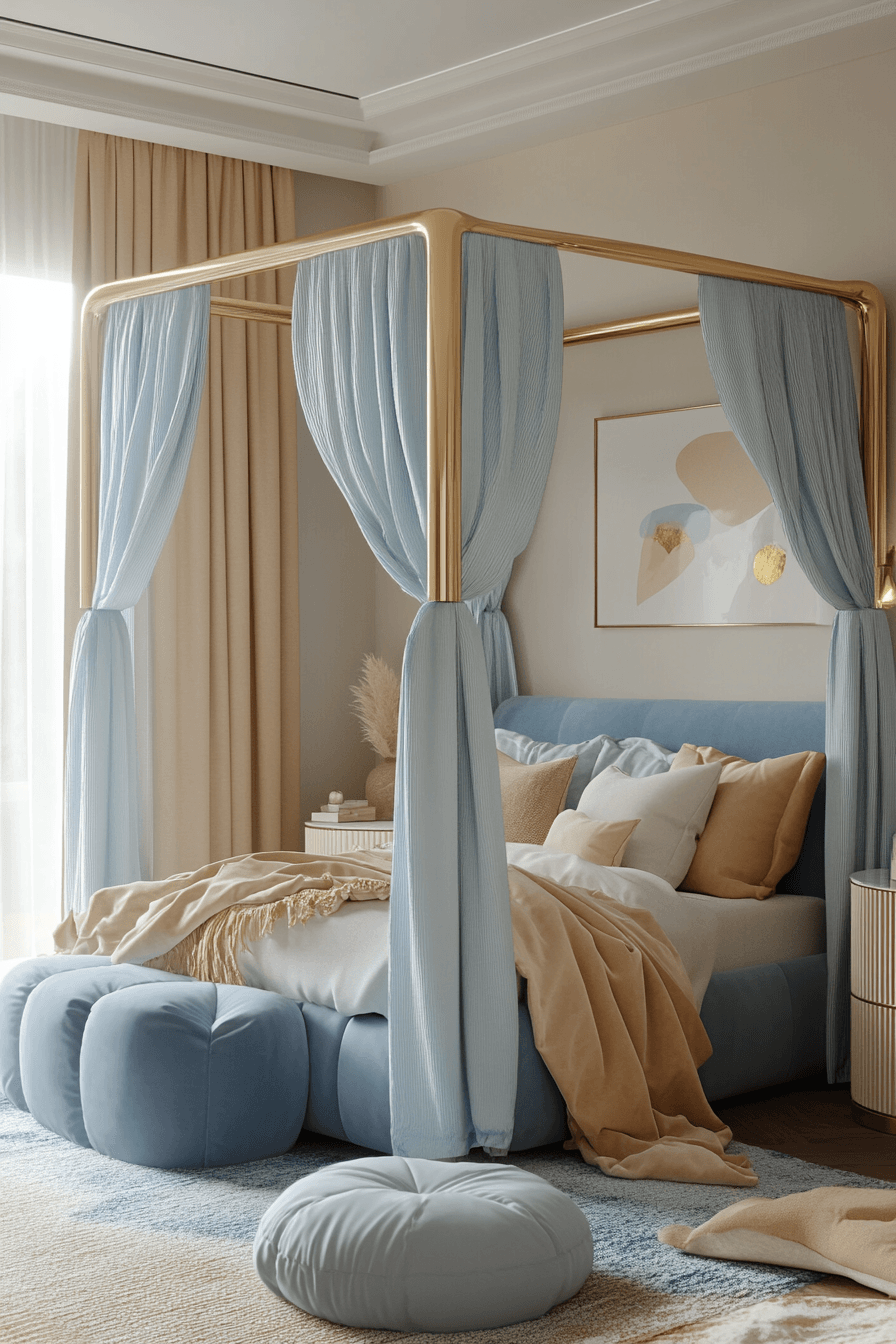 This luxury kids bedroom blends royal elegance with modern restraint for a space that feels charming and restful. Canopy elements, classic molding, and rich accent shades bring a storybook feeling into the room without making it feel busy. Soft neutral tones keep everything airy while velvet and satin textures add beautiful depth. The design feels elevated but still peaceful enough for everyday comfort. It is a lovely mix of fairytale beauty and modern calm. Discover more regal room inspiration and create a dreamy escape with ease.