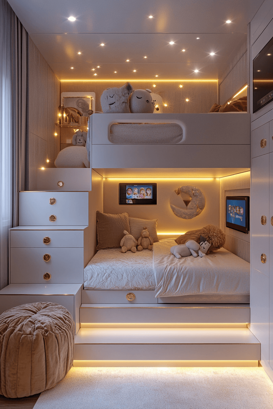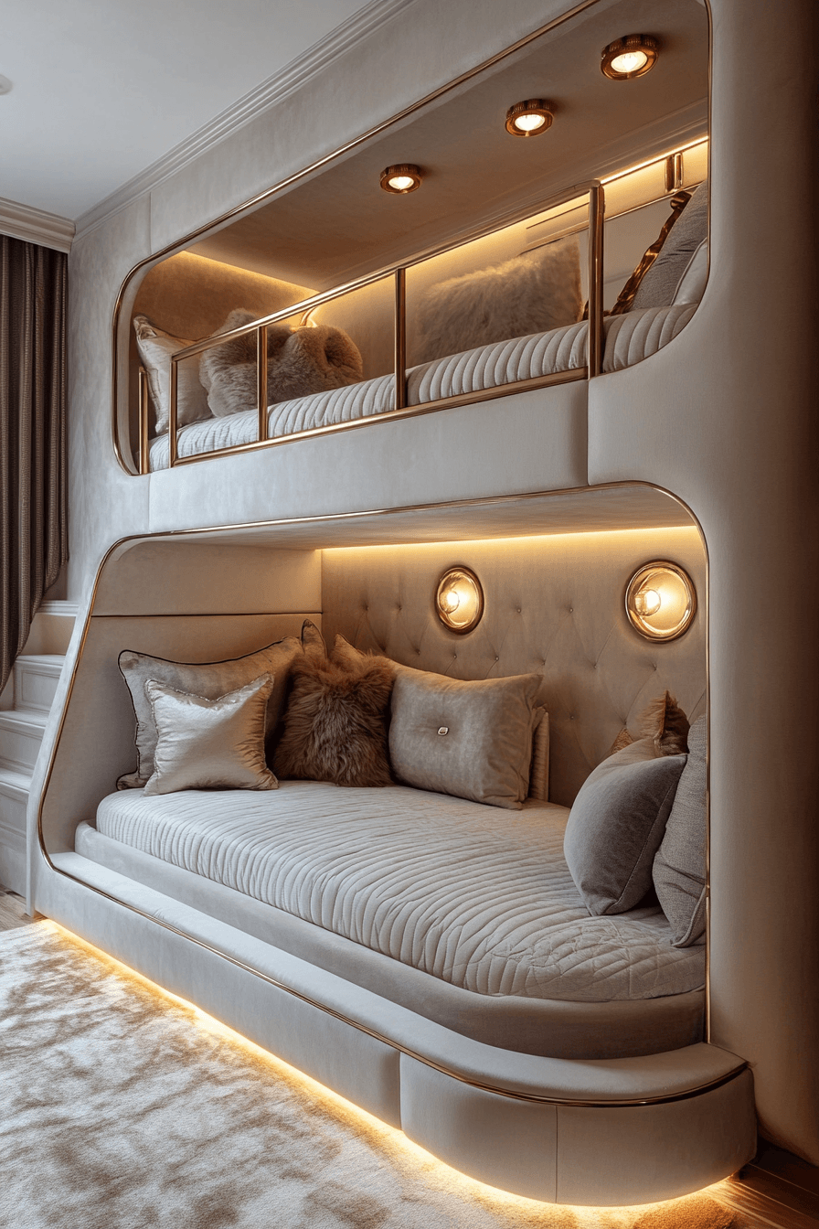 A bunk-filled luxury kids bedroom can feel fashion-forward, cozy, and incredibly well designed. Upholstered bunks, built-in shelving, and personalized lights help each sleeping spot feel special. Carefully chosen colors keep the room feeling stylish while still making it fun for kids. Extra details like velvet panels or metallic rails add a more elevated designer feel. The setup is practical for shared spaces while still looking beautifully curated. Find more elevated bunk room ideas and give shared sleeping areas a stylish upgrade.
