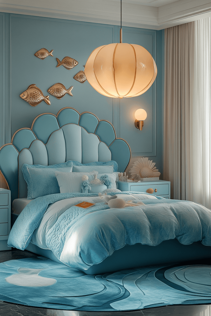 An ocean-inspired luxury kids bedroom feels refreshing, serene, and beautifully upscale. Tones of navy, sea glass, and pearl bring a breezy palette that instantly softens the space. Curved patterns and soft ambient lighting create a peaceful setting that feels like a gentle coastal getaway. White furniture and subtle metallic details keep the room crisp and sophisticated. A playful seat or cozy nook adds charm while preserving the polished atmosphere. Dive deeper into coastal-inspired looks and create a room with breezy elegance.
