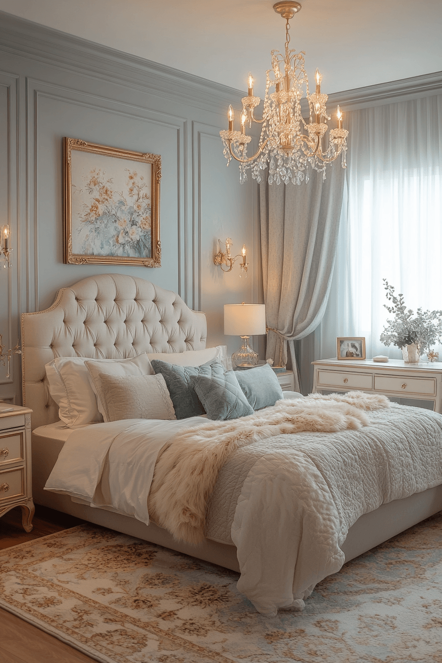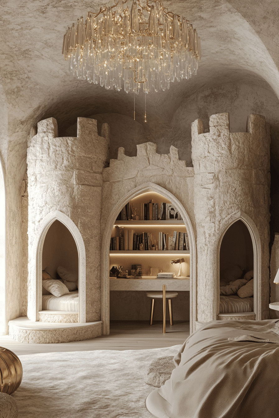 A luxury kids bedroom with a royal mood can turn an ordinary room into a graceful little palace. Rich fabrics, tufted furniture, and elegant metallic details give the space a polished look that still feels warm and magical. Shades like dusky lavender or deep navy bring depth while keeping the room playful and inviting. Soft chandelier lighting adds sparkle and creates a beautiful glow across every surface. Built-in storage and layered materials make the room feel organized, cozy, and beautifully styled. Step into more regal inspiration and uncover a room idea worth dreaming about.