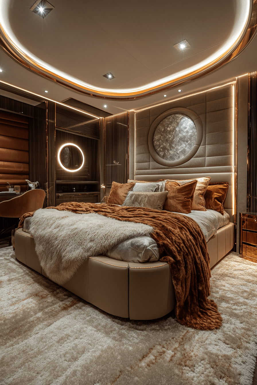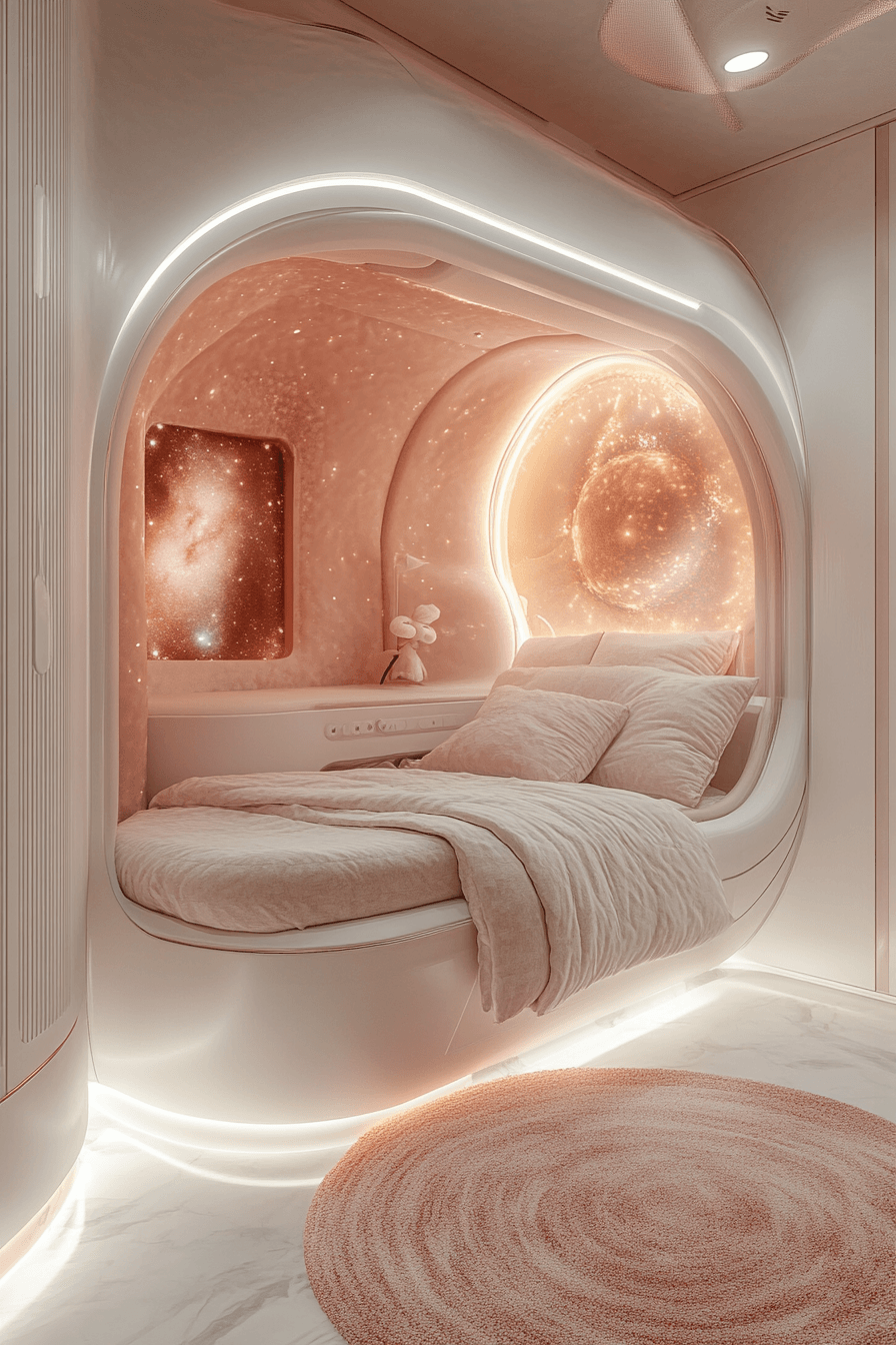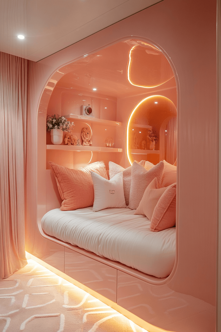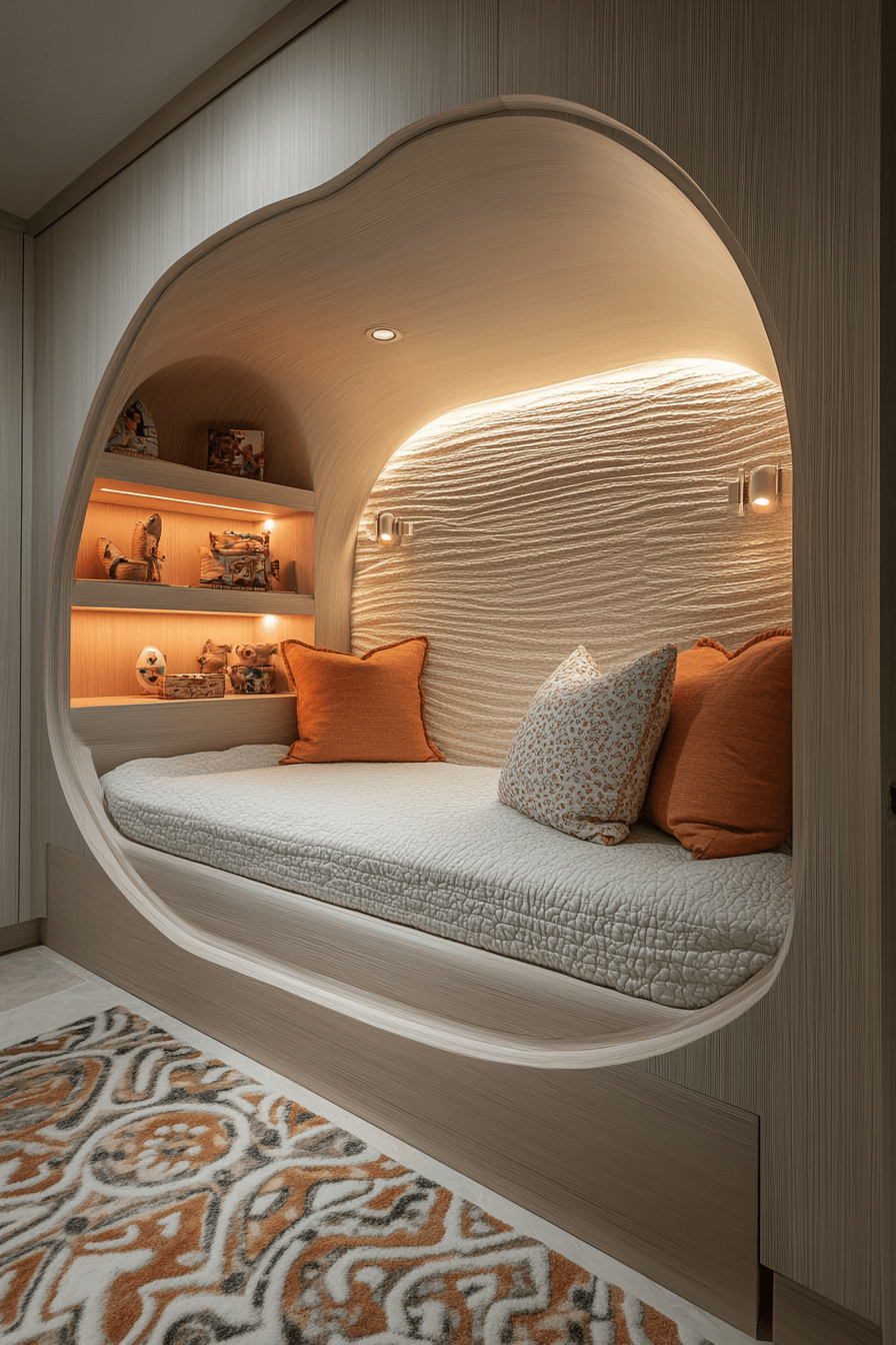 This pod-style luxury kids bedroom creates a tucked-away retreat that feels secure, stylish, and unique. Curved forms, bold wall treatments, and soft lighting make the sleeping area feel cozy and private. Calm tones help the room stay sleek and restful rather than crowded. Built-in storage keeps the design tidy and supports that smooth, polished finish. It feels like a personal little suite designed with comfort in mind. Find more cozy bedroom inspiration and shape a room that feels wonderfully special.