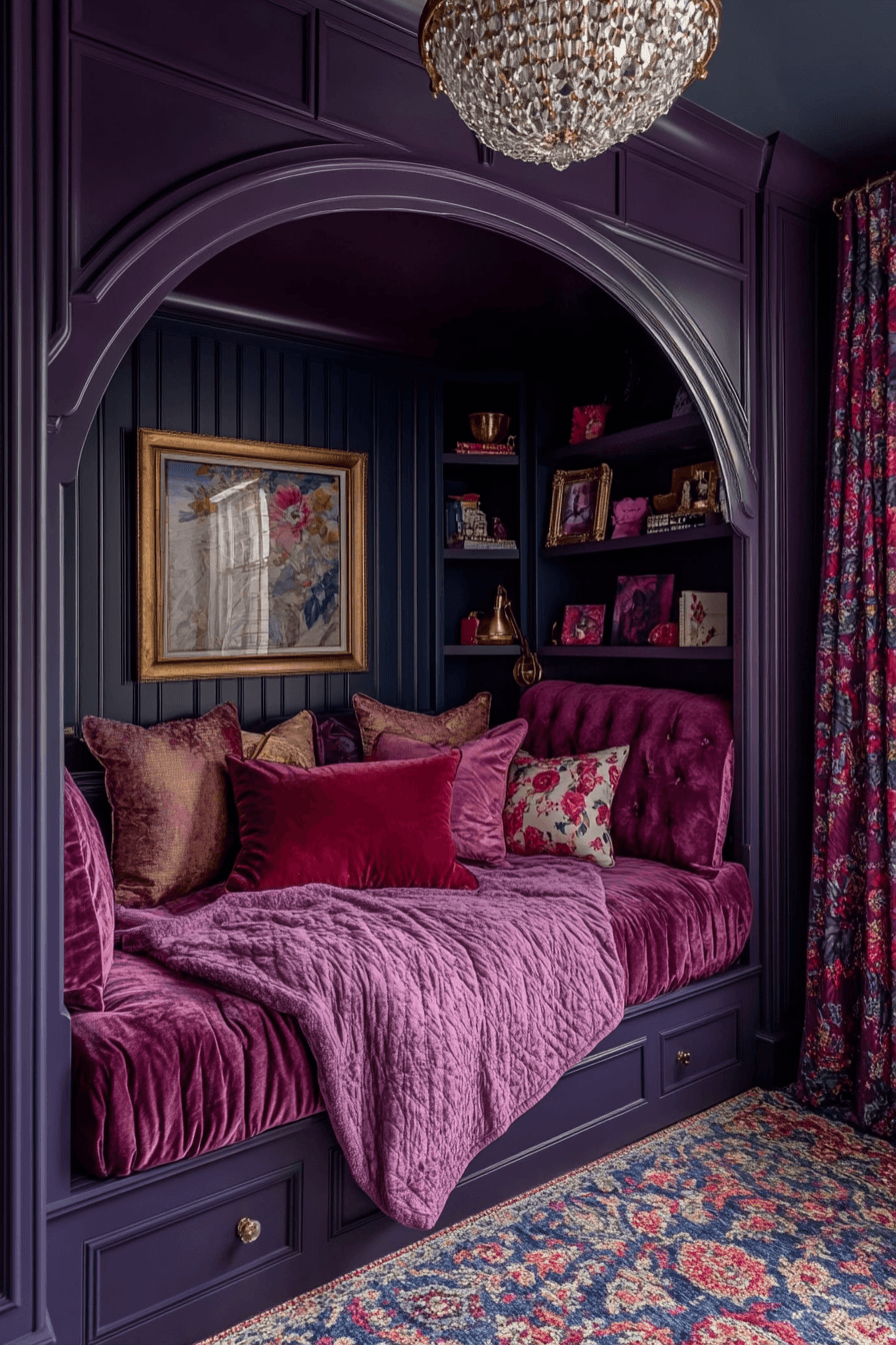 This twilight-inspired luxury kids bedroom wraps the room in moody color and cozy comfort. Deep jewel-like shades mixed with silver accents create a magical setting that feels restful and imaginative. Layered lighting helps the room shift effortlessly from active afternoons to quiet evenings. Plush seating and velvet textures make the whole space feel warm and inviting. Sleek furniture lines keep the design grounded and beautifully balanced. Explore more evening-inspired room ideas and create a dreamy hideaway with style.