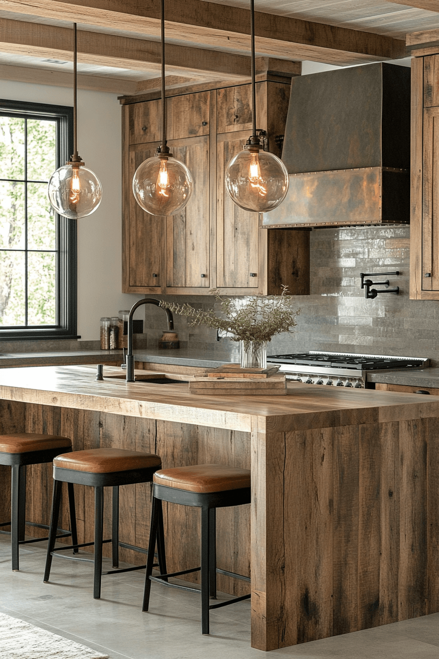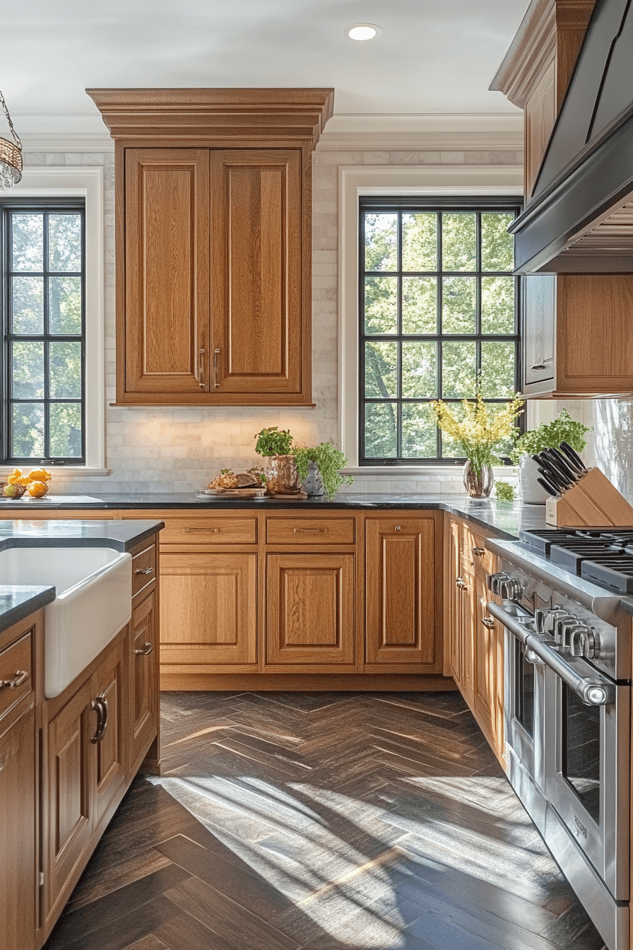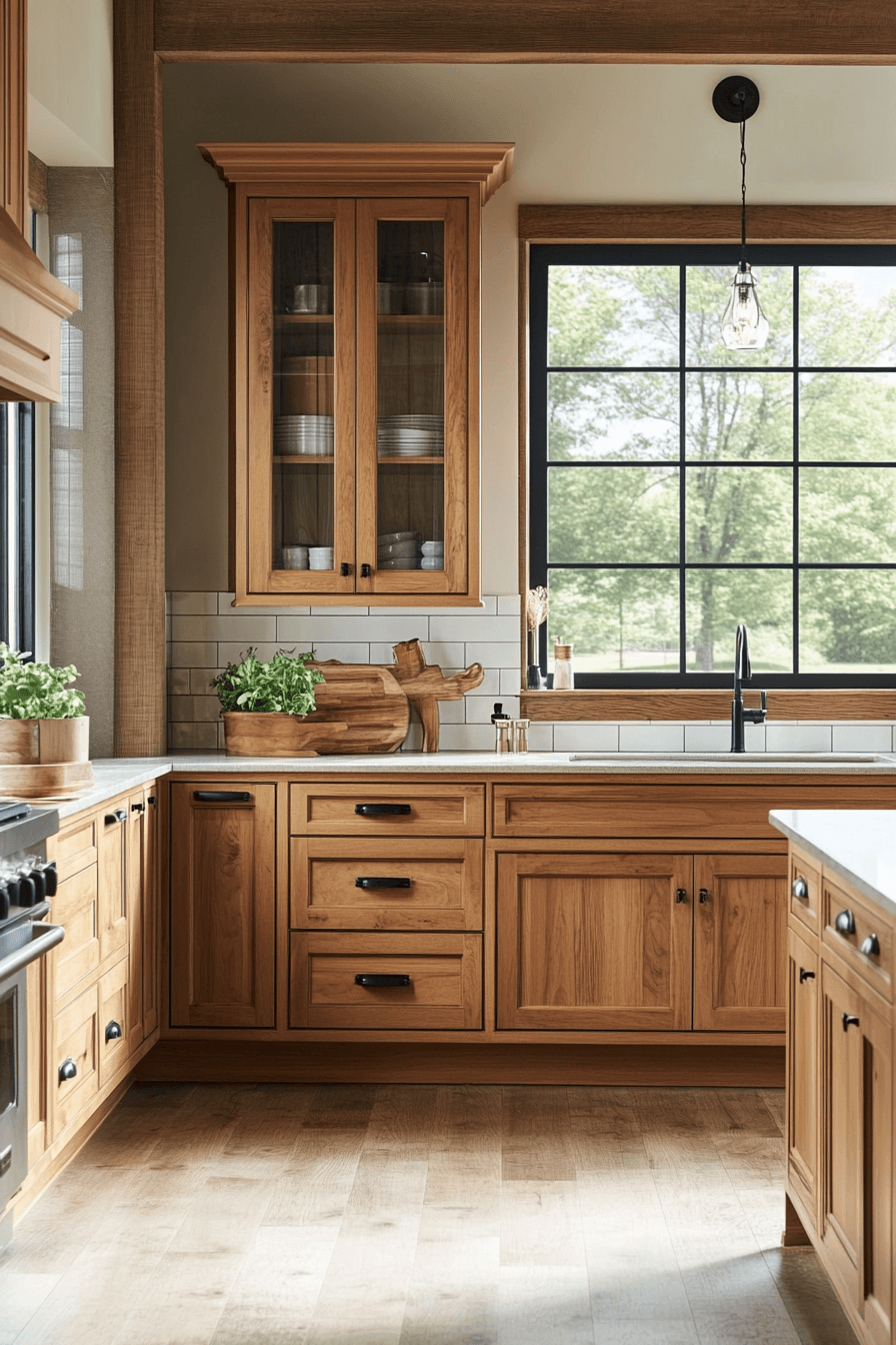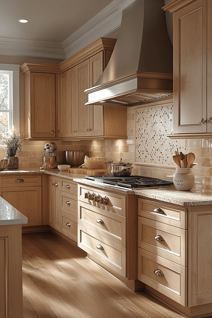 Rustic-leaning maple kitchen cabinets bring natural comfort into the kitchen while still looking refined and polished. The soft grain and wood character add depth without making the room feel rough or unfinished. Balanced craftsmanship keeps the cabinetry looking elevated and intentional. Stone counters, muted metals, and vintage-inspired touches help complete the look beautifully. This style feels cozy without ever losing its sophistication. Explore more rustic-modern kitchen ideas and bring warm charm into your design.