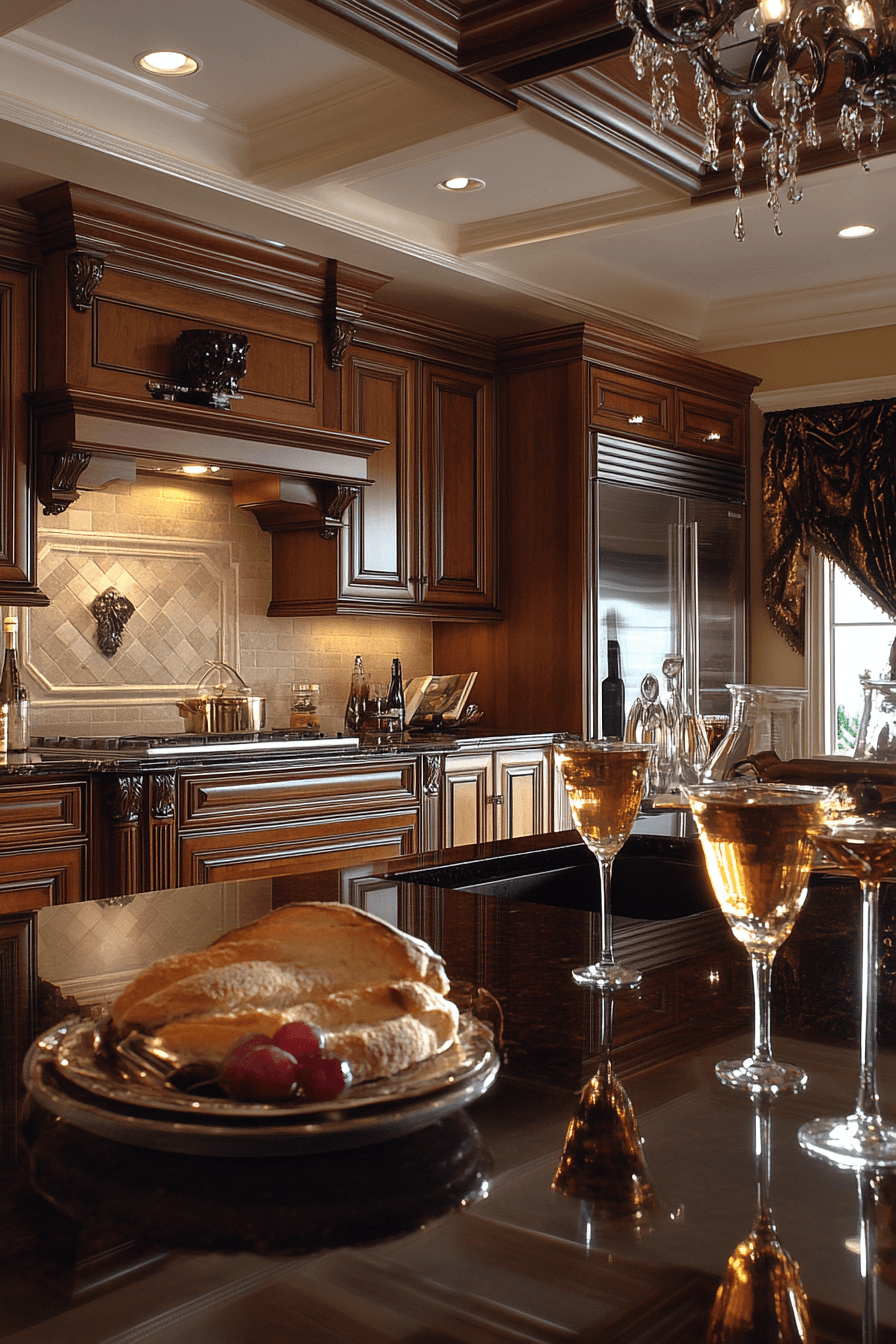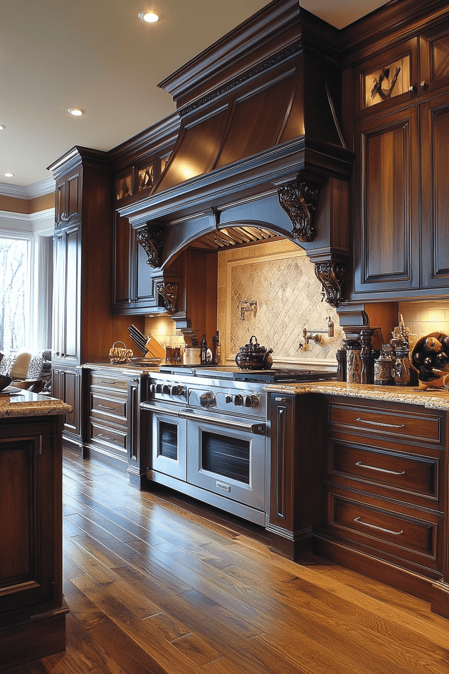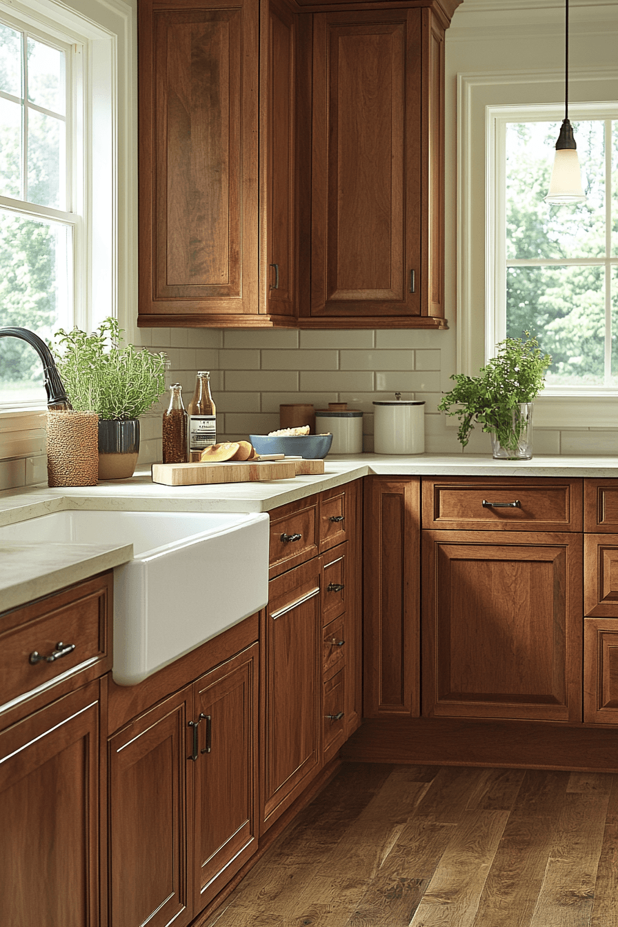 Deep amber maple kitchen cabinets bring richness and depth that instantly elevate the entire kitchen. Darker maple tones create a sense of quiet luxury while still keeping the room warm and approachable. Natural variations in the grain add handcrafted beauty that makes the cabinetry feel special. This style feels especially at home in traditional and transitional spaces. Stone surfaces and layered lighting make the whole look feel even more refined. Explore more rich wood kitchen inspiration and create a beautifully grounded space.