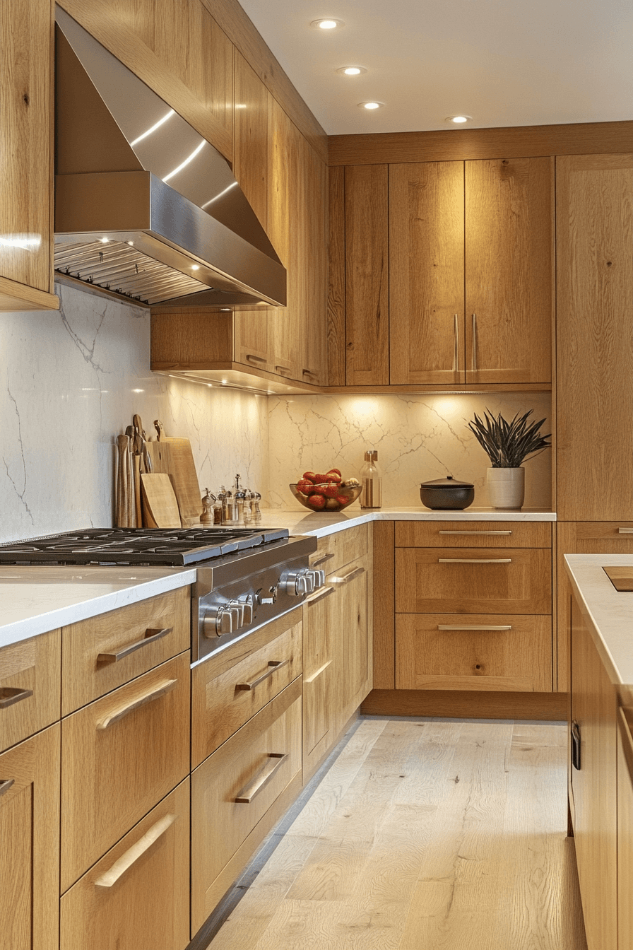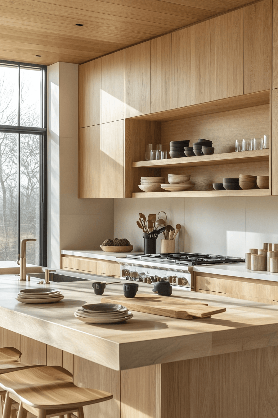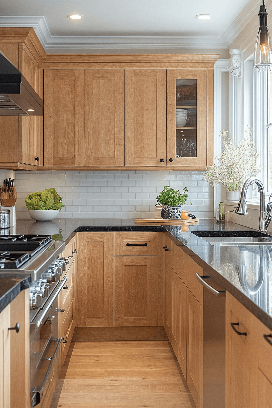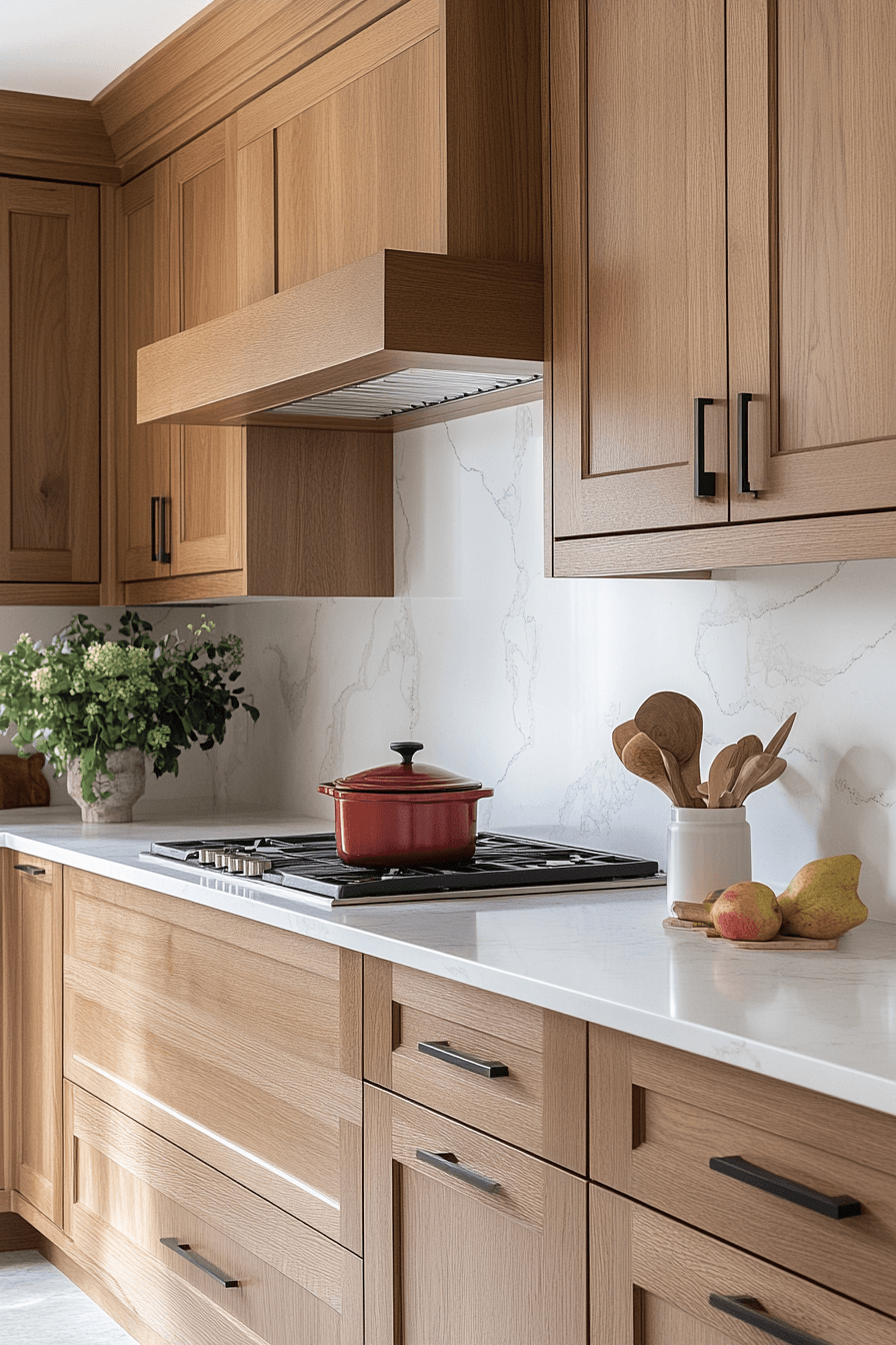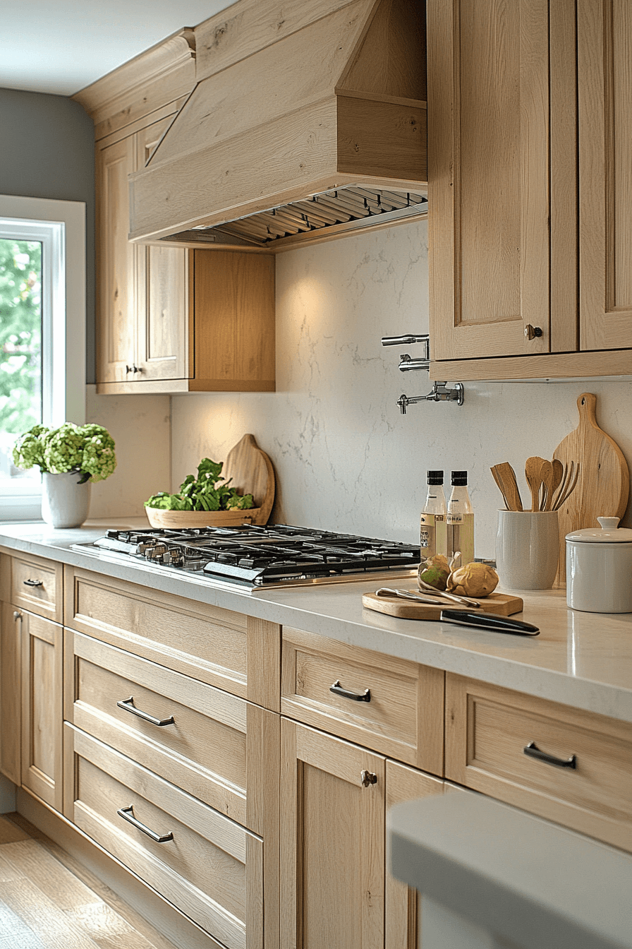 Minimal-lined maple kitchen cabinets keep the kitchen looking crisp, clean, and thoughtfully designed. Without heavy embellishment, the natural wood becomes the star of the space. This style feels ideal for kitchens that lean modern, Scandinavian, or Japandi-inspired. Sleek appliances and understated hardware make the whole look feel seamless. Everything feels functional, refined, and visually calm. Find more clean kitchen inspiration and shape a maple design that feels beautifully intentional.