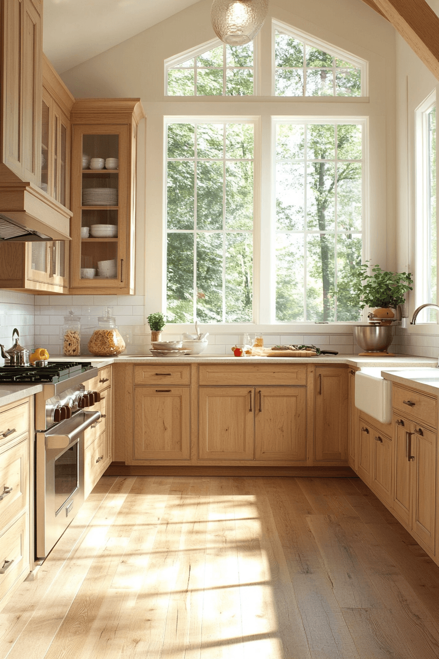 Daylit maple kitchen cabinets work beautifully in homes where sunlight pours into the kitchen. Their pale surface reflects natural brightness in a way that helps the whole room feel open and expansive. Subtle maple texture keeps the look interesting while preserving an airy overall feel. This style is especially lovely in kitchens with big windows or open layouts. Warmth and brightness blend together in such an uplifting way. Discover more light-filled kitchen inspiration and turn your space into a fresh retreat.