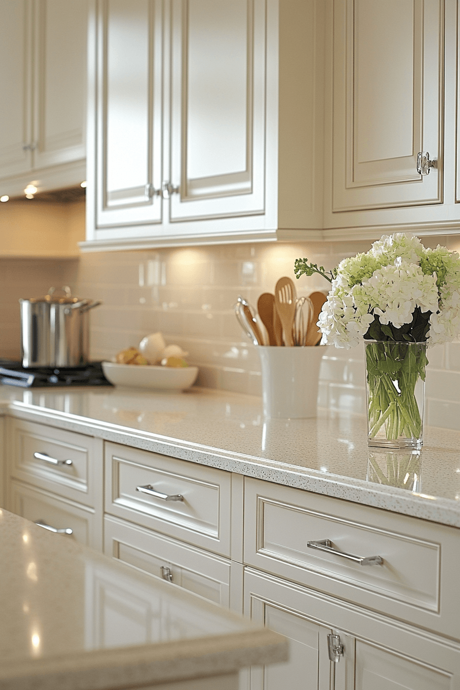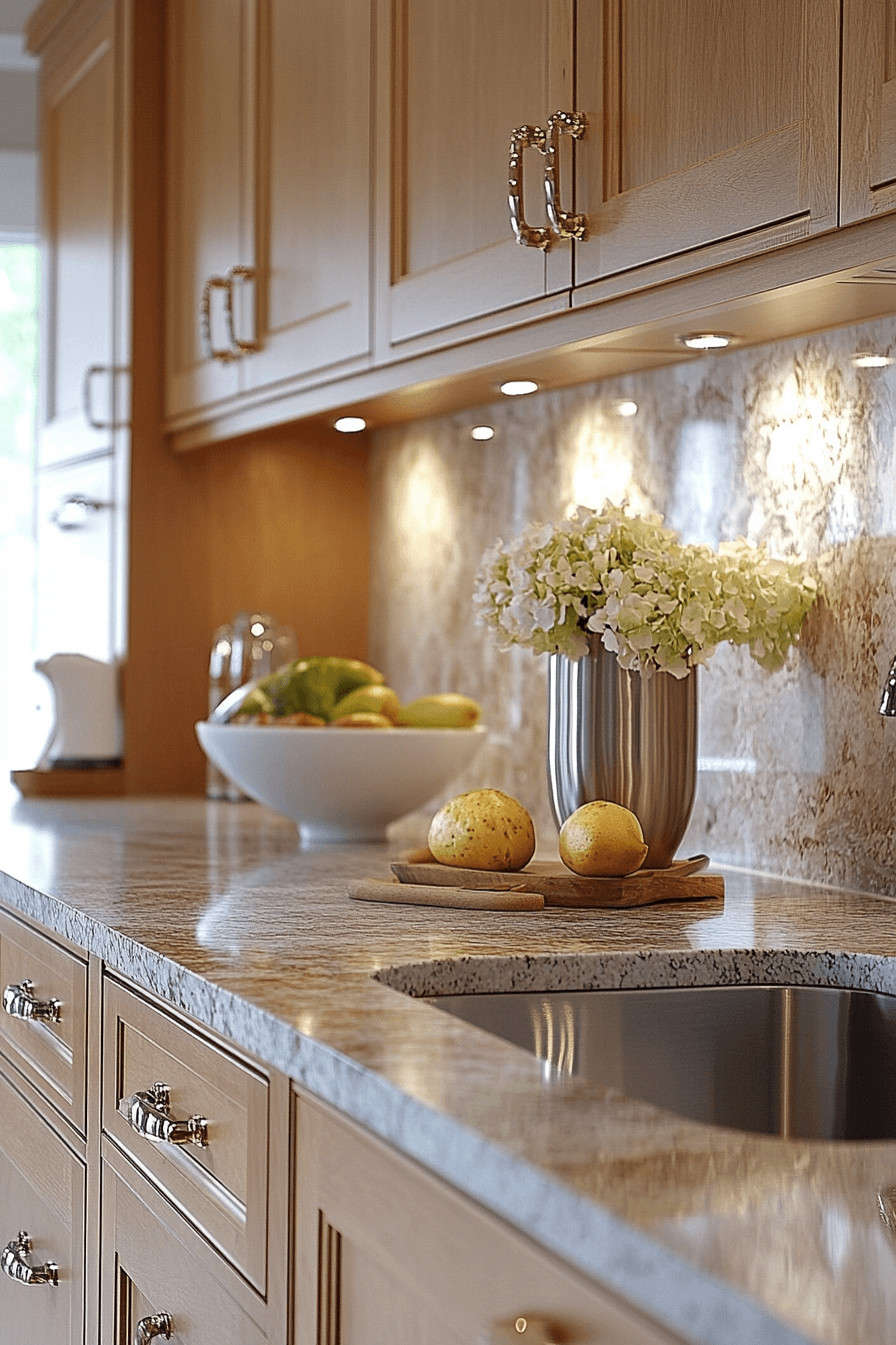 Satin-touch maple kitchen cabinets deliver a refined surface that feels polished, graceful, and quietly luxurious. Their finish adds a soft glow that highlights the natural warmth of maple in a very subtle way. This approach feels upscale without ever becoming flashy or overwhelming. Warm lighting and brushed hardware complete the look beautifully. Sophisticated kitchens can still feel inviting, and this style proves it. Explore more satin-inspired kitchen ideas and elevate your cabinets with soft elegance.