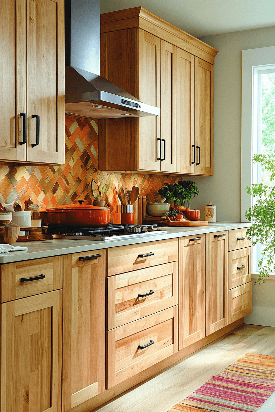 Crisp-profile maple kitchen cabinets give the kitchen bold structure and unmistakable modern appeal. Sharp edges and smooth finishes create a clean-lined look that feels strong and organized. Pairing them with dark counters or metal details makes the warm maple tone stand out even more. This style suits kitchens that value contrast, simplicity, and visual impact. Functional design feels especially stylish here. Discover more bold kitchen ideas and create a maple space that makes a statement.