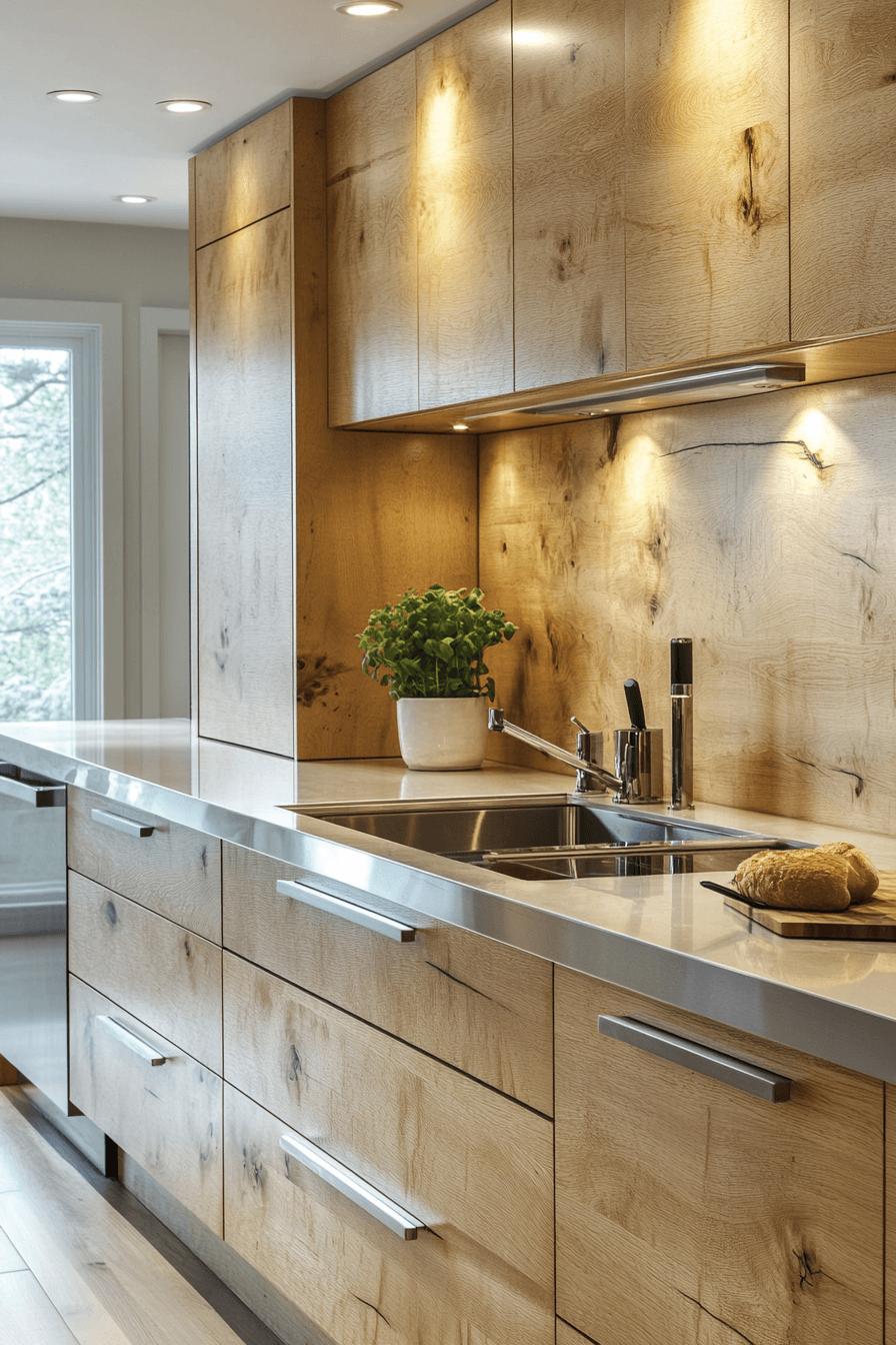For a clean contemporary look, maple kitchen cabinets offer a simple base that still feels warm and welcoming. Their lighter natural color helps the room stay bright while adding organic softness to the design. Smooth grain and minimal shaping create a polished kitchen that feels uncluttered and current. They look especially stylish with steel details, stone counters, and matte finishes. Practical and modern can absolutely work together here. See more sleek kitchen inspiration and transform your space with modern maple charm.