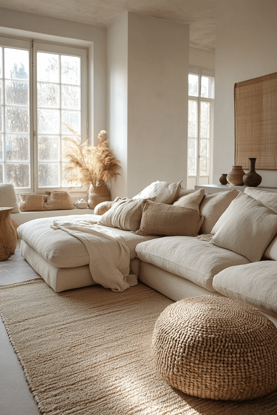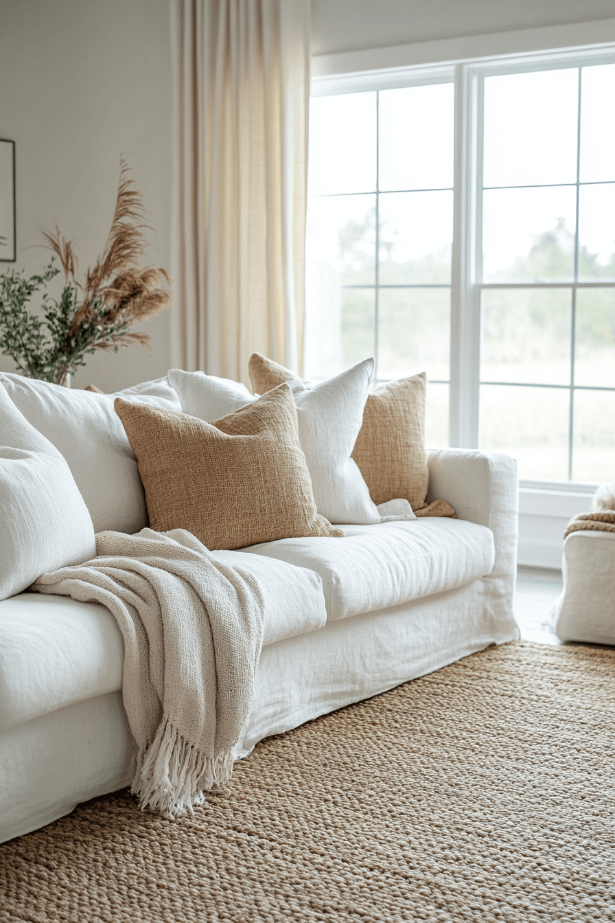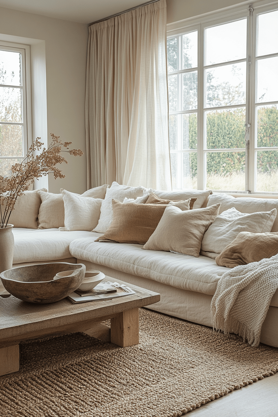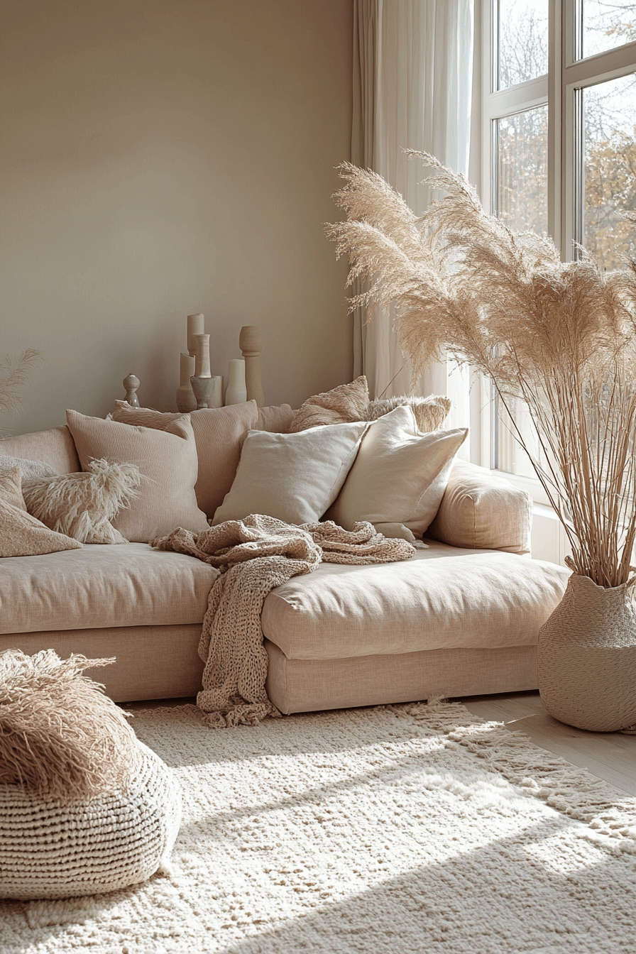 Rely on layered beige tones for gentle warmth. Mix them with creamy white and light tan. Choose clean-lined furniture for a contemporary edge. Add tactile decor for softness.