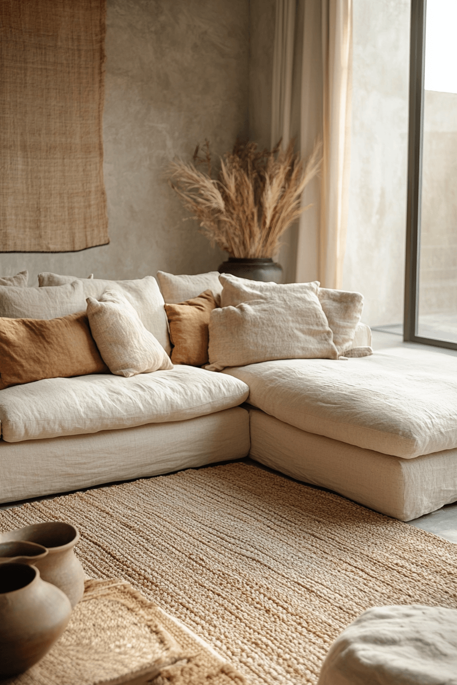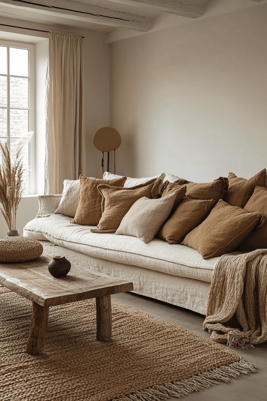 Combine linen, wool, and cotton in warm shades for a richly textured modern boho living room. Add throws and cushions for softness. Keep the palette consistent for a cohesive look. The result is comfort you can see and feel.