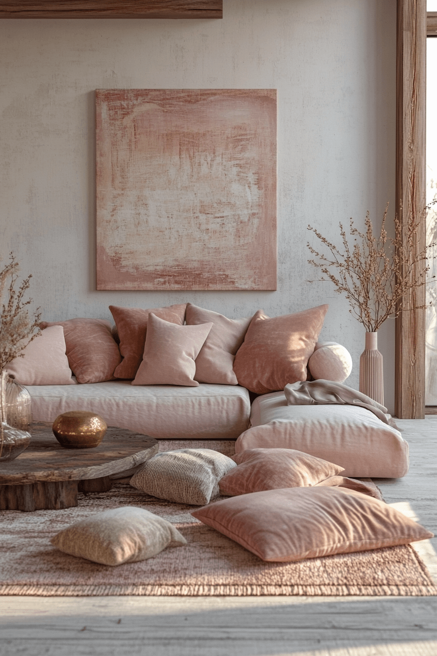 Bring the gentle glow of sunset indoors with dusty rose, warm taupe, and pale terracotta. Keep shapes simple to balance the richness of the hues. Light fabrics maintain airiness. The palette adds a cozy, welcoming feel.