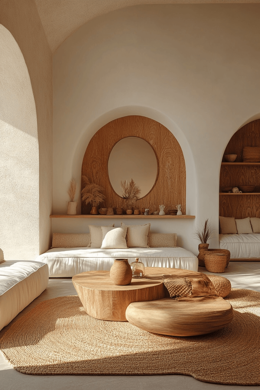 Use rounded shapes and gentle lines to soften your modern boho living room. Arched mirrors, curved sofas, and circular rugs create a natural flow. Keep your palette subdued for a calming effect. Layer textures for interest without overwhelming the space.
